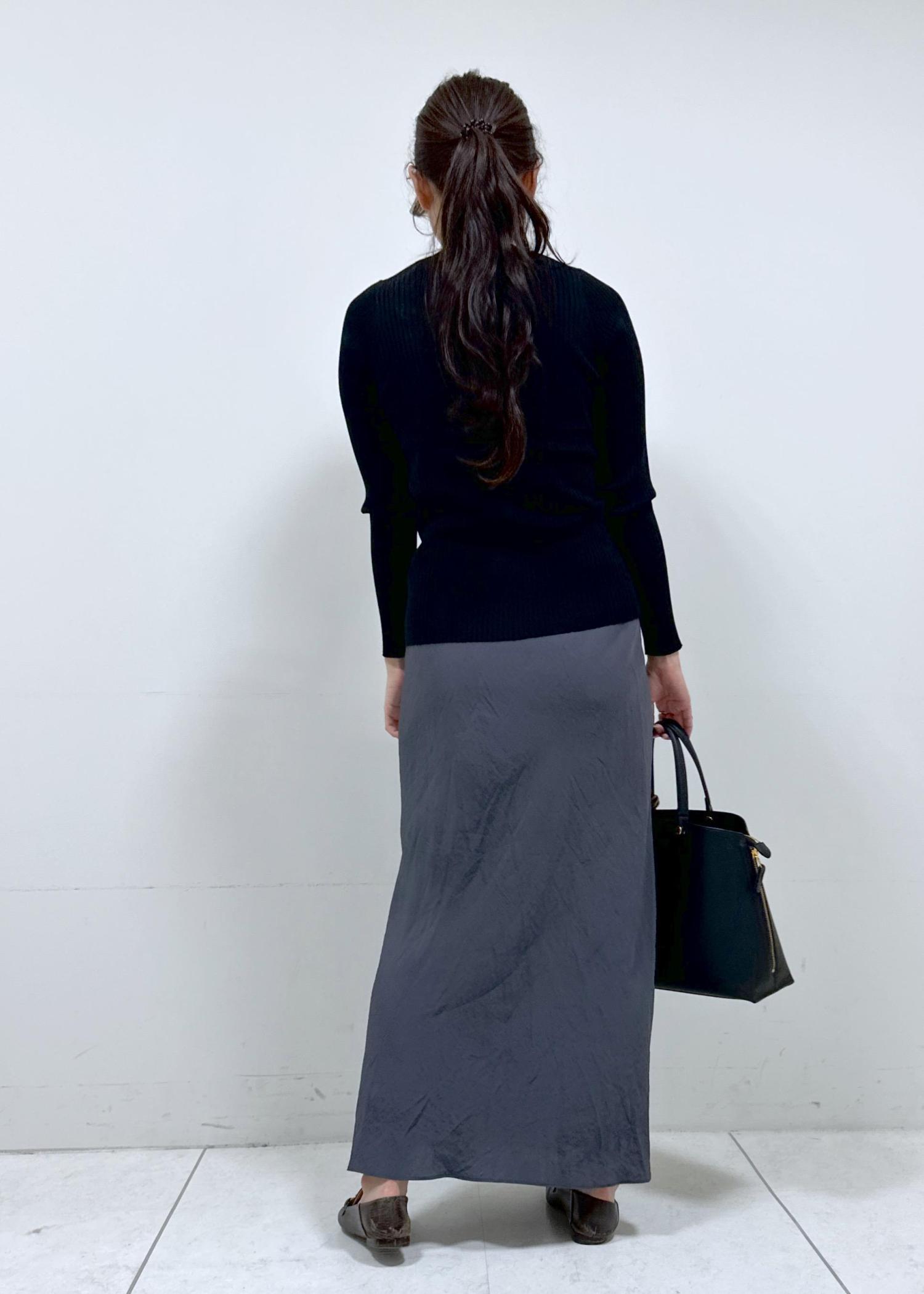 腰回りがすっきりとしたマーメイドシルエットで、ウエストが後ろゴムなので楽に着ていただけます◎ -