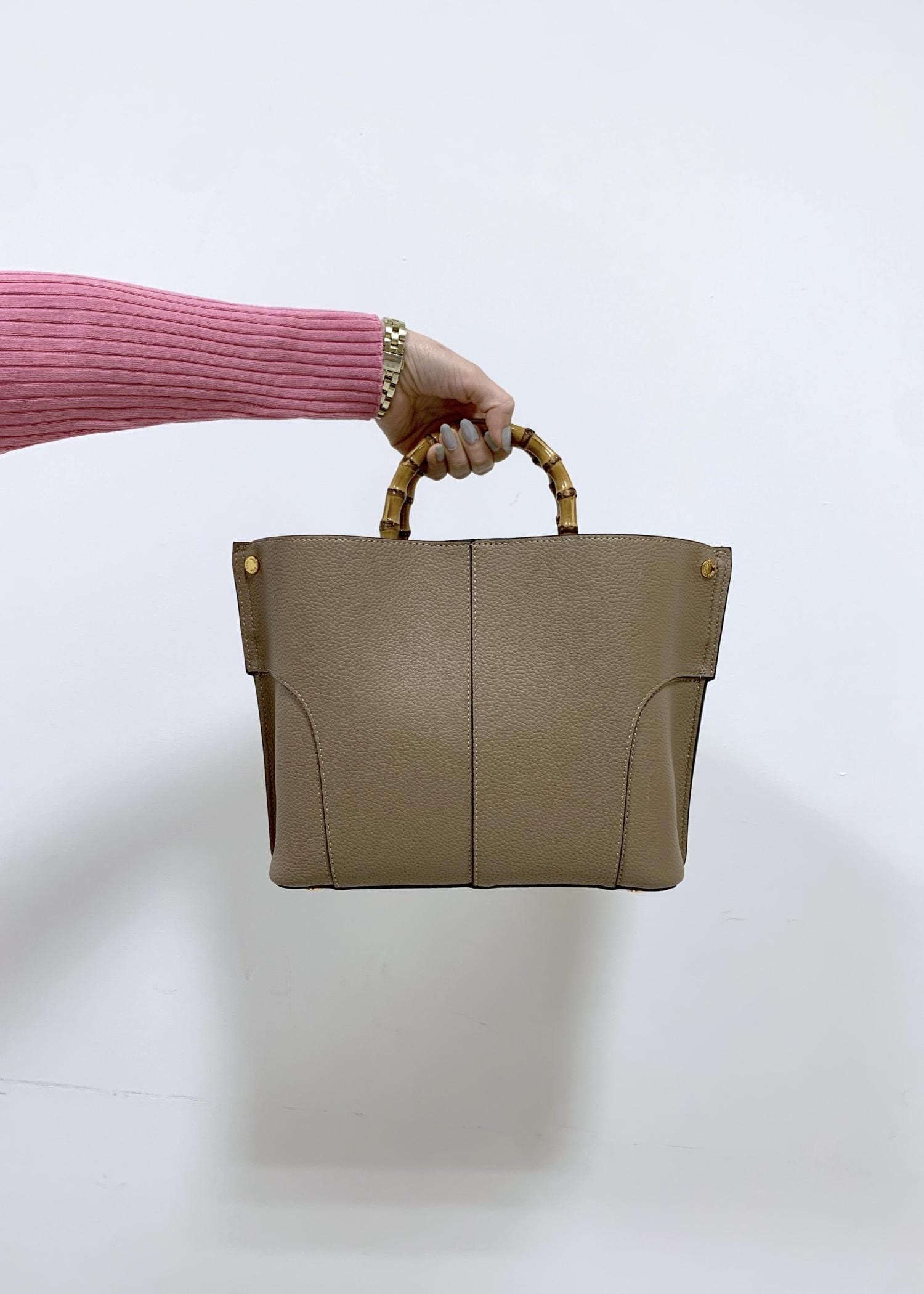 マチも有るのでお出掛けに必要なお財布、スマホ、ポーチ等はしっかり収納出来てお出掛けにぴったりなサイズ感です。バンブーハンドルが高級感と抜け感をプラスし高見えします♪