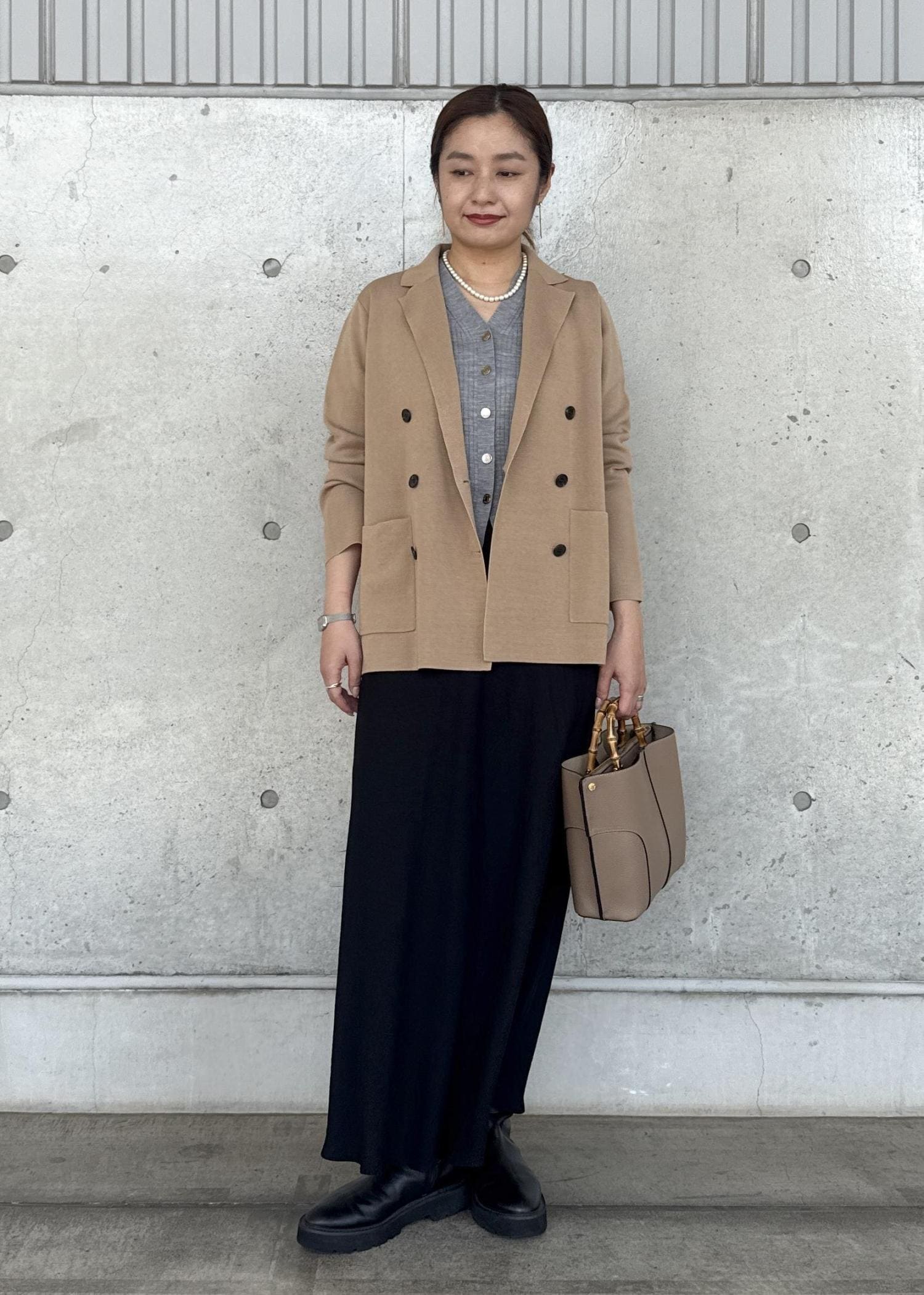 釦を全て留めて、Vネックニットとしても着れるVの深さなので一枚あると汎用性の高いニットです。