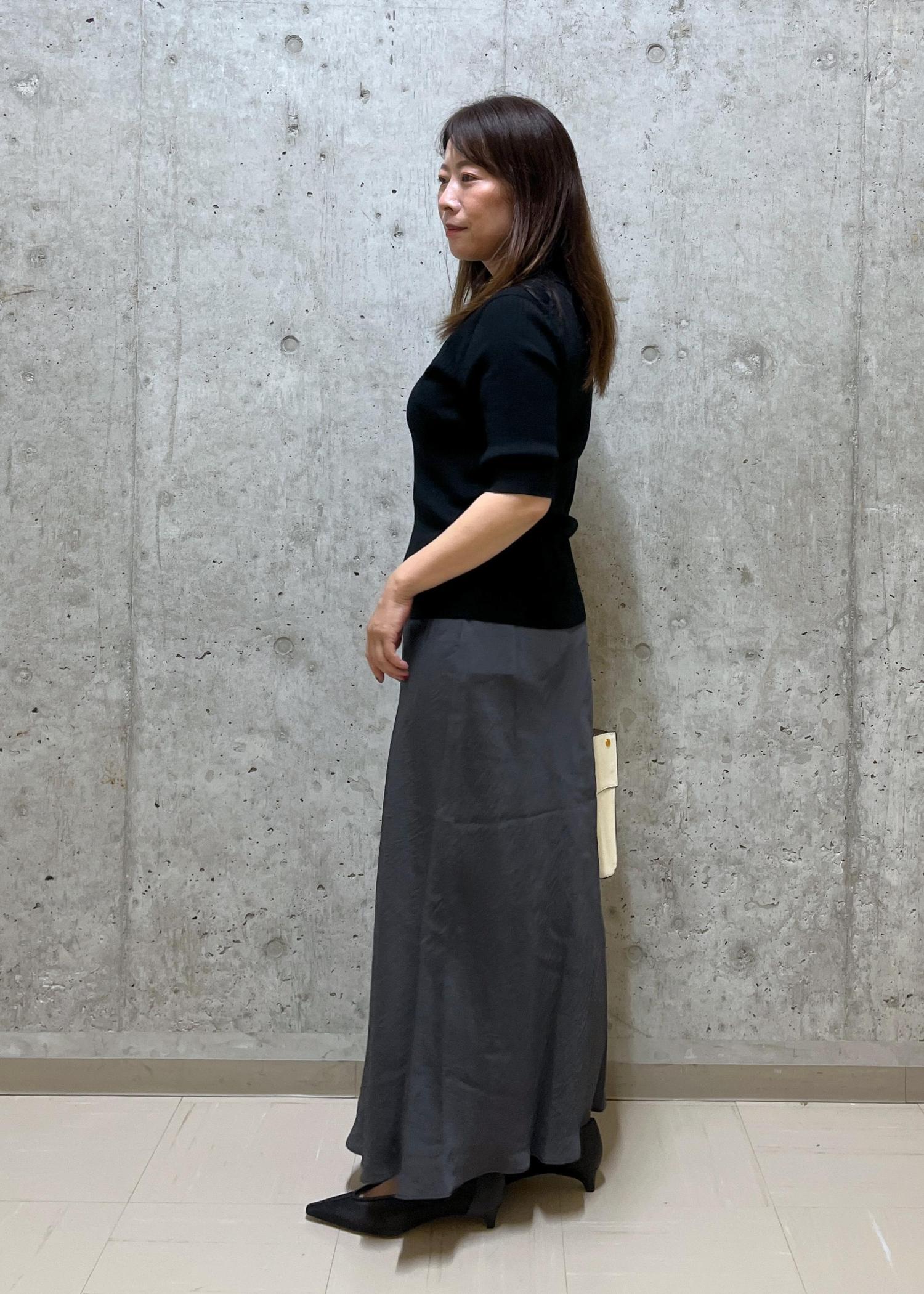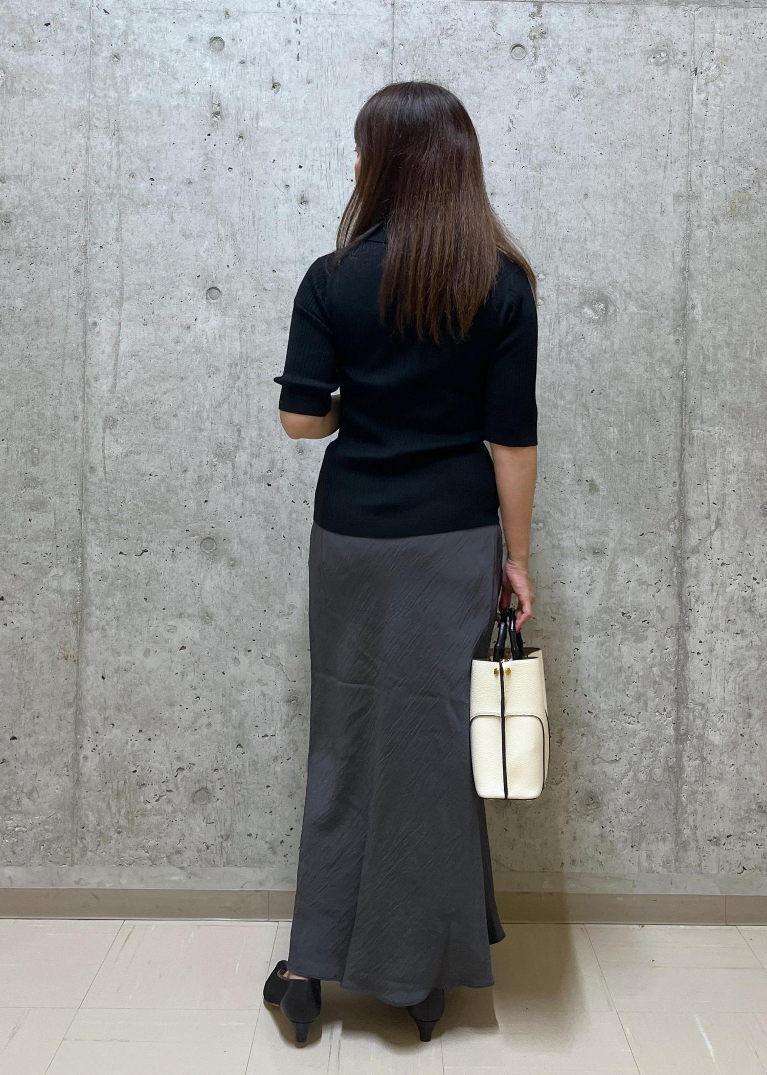 パールボタンがポイントの5部袖ニットはマーメイドスカートと合わせて可愛らしい雰囲気にしました!