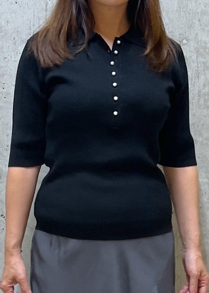 ポロ襟デザインですがパールボタンがカジュアル過ぎない雰囲気で、幅広いコーディネートが楽しめます。 -