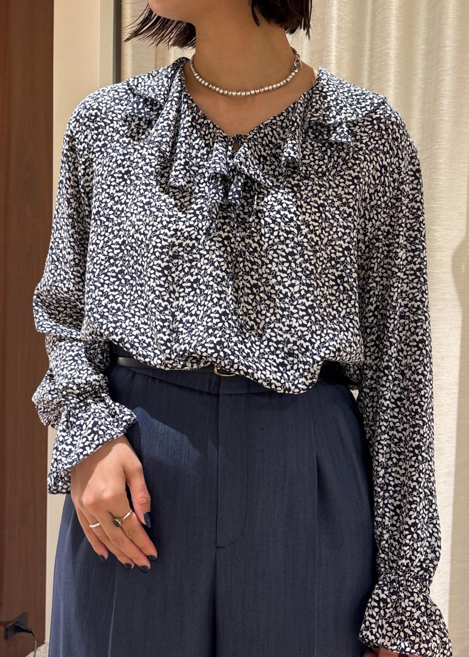 リーフ柄のプリントフリルブラウスに、