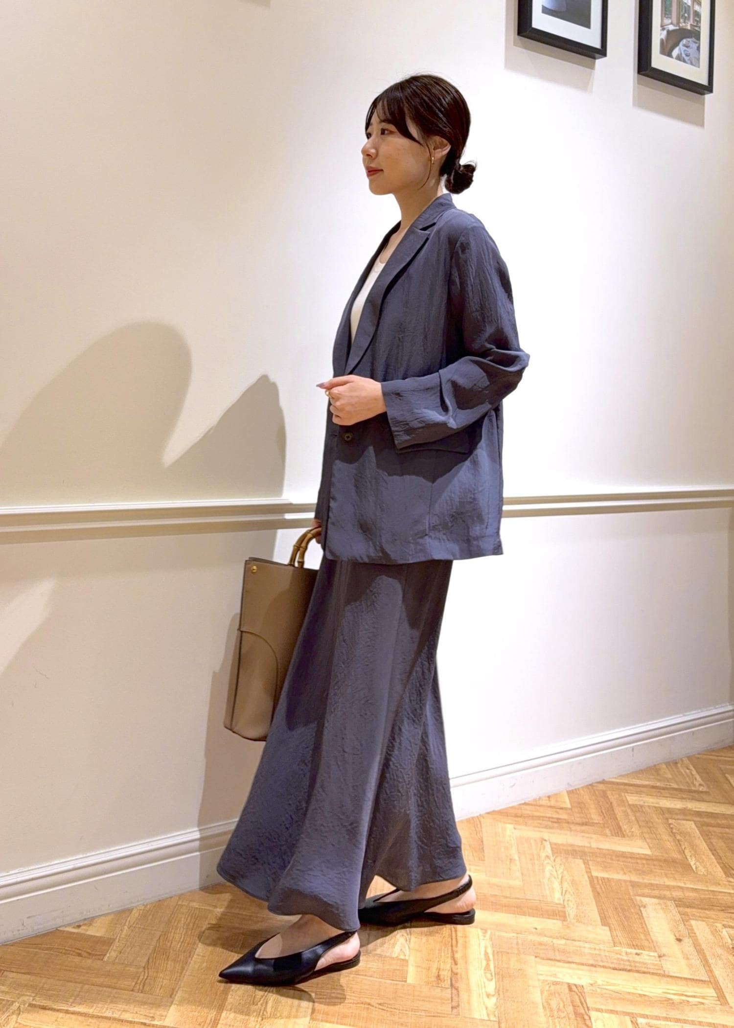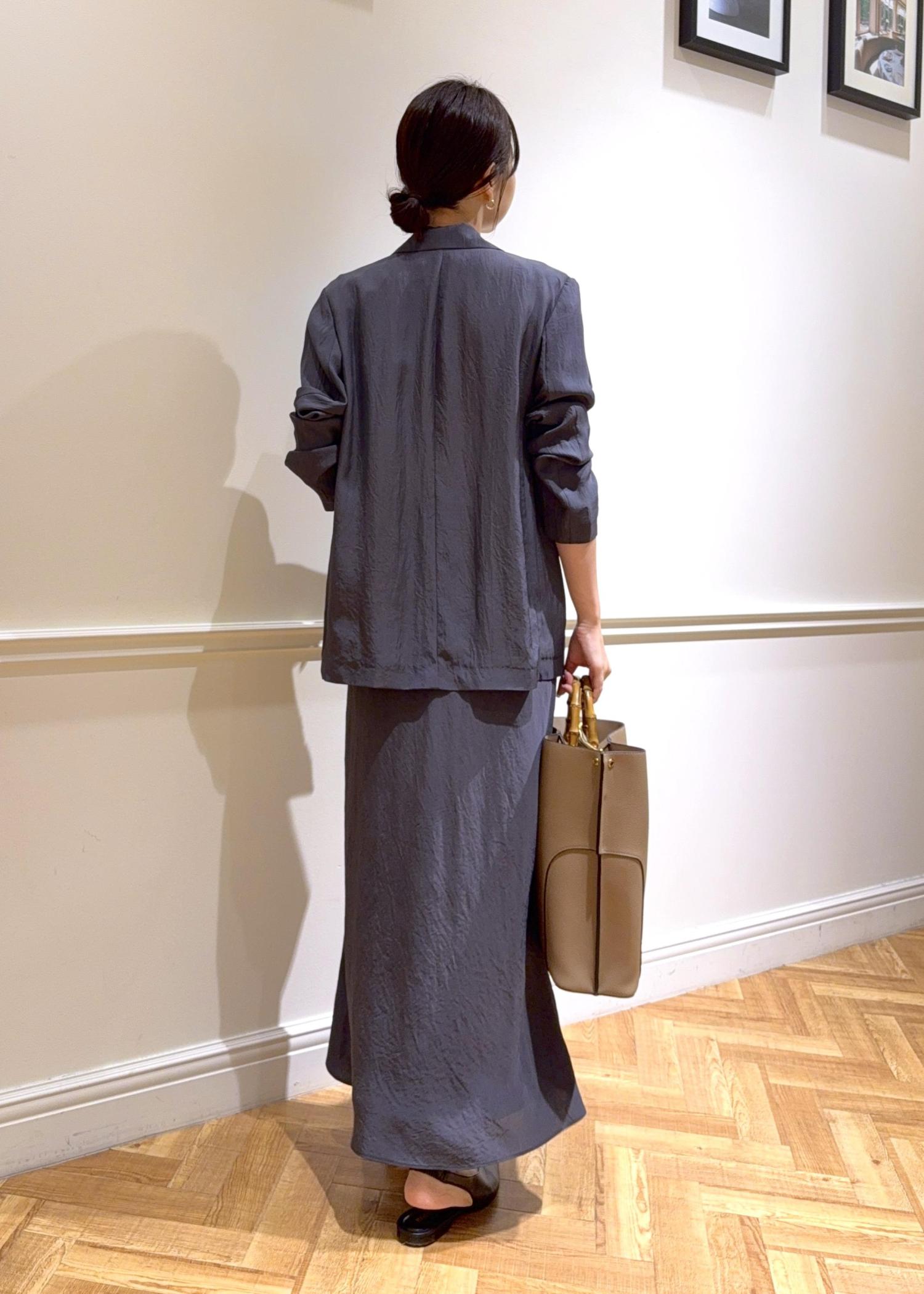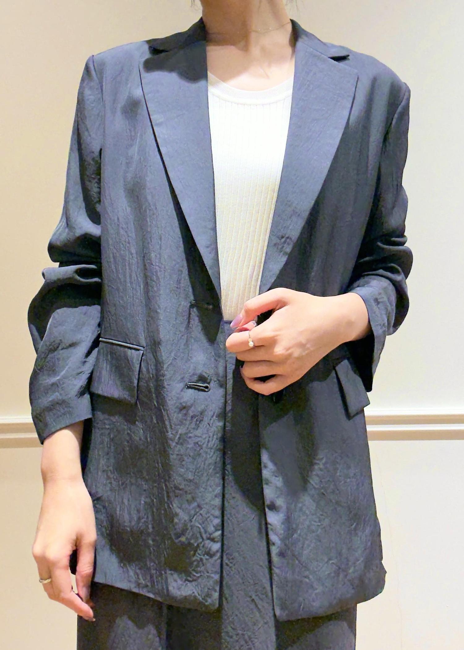 シアー素材のセットアップは、気温差に左右されずにジャスト〜先までお使いいただけます。