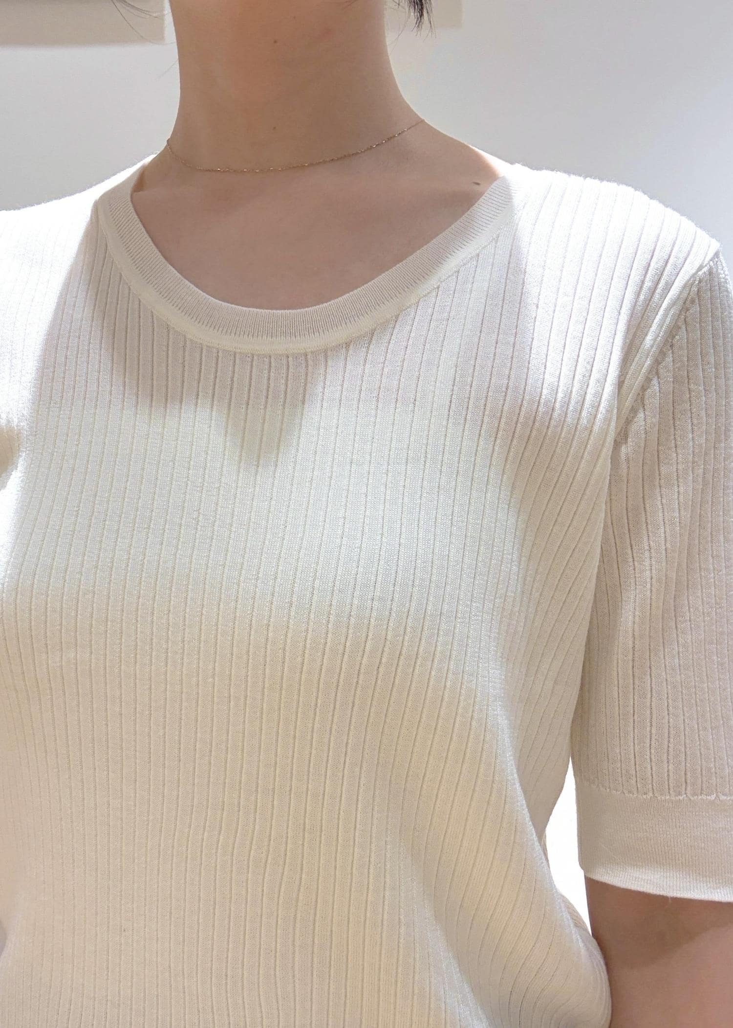 柔らかく伸びの良いリブニットです。ネック部分も開きすぎていないので、お仕事でも安心して着ていただけます。
