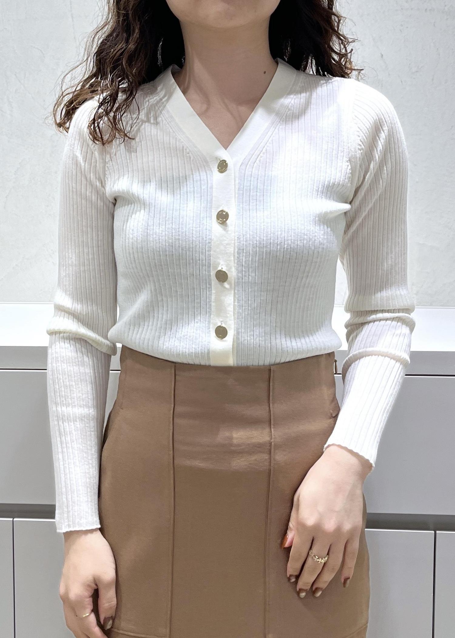 Vネックですっきり見え、ゴールドボタンが映えるのでアクセサリーいらずで華やかな印象になります♪ -