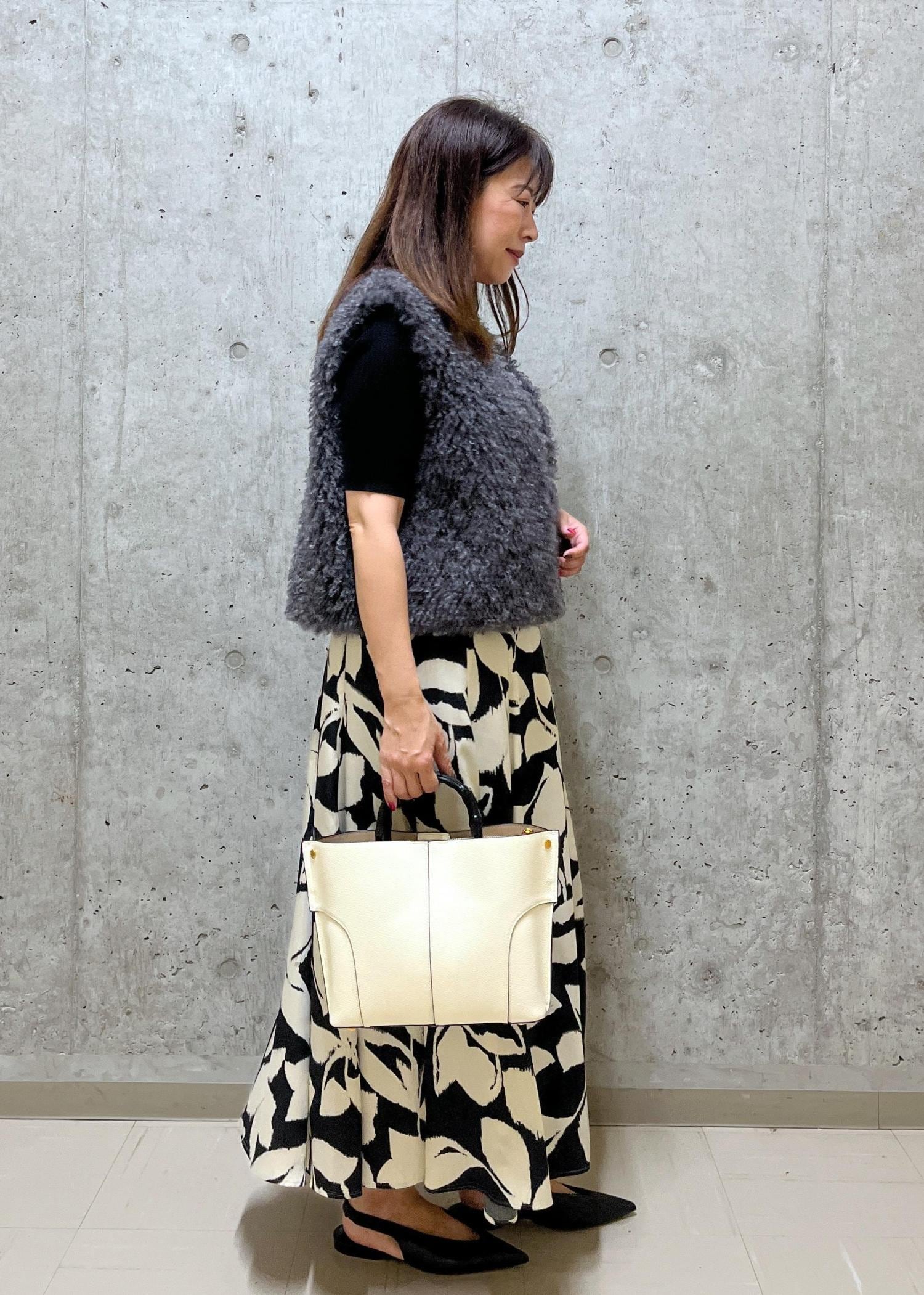 シンプルなニットにファーベストを合わせて秋の雰囲気にしました。