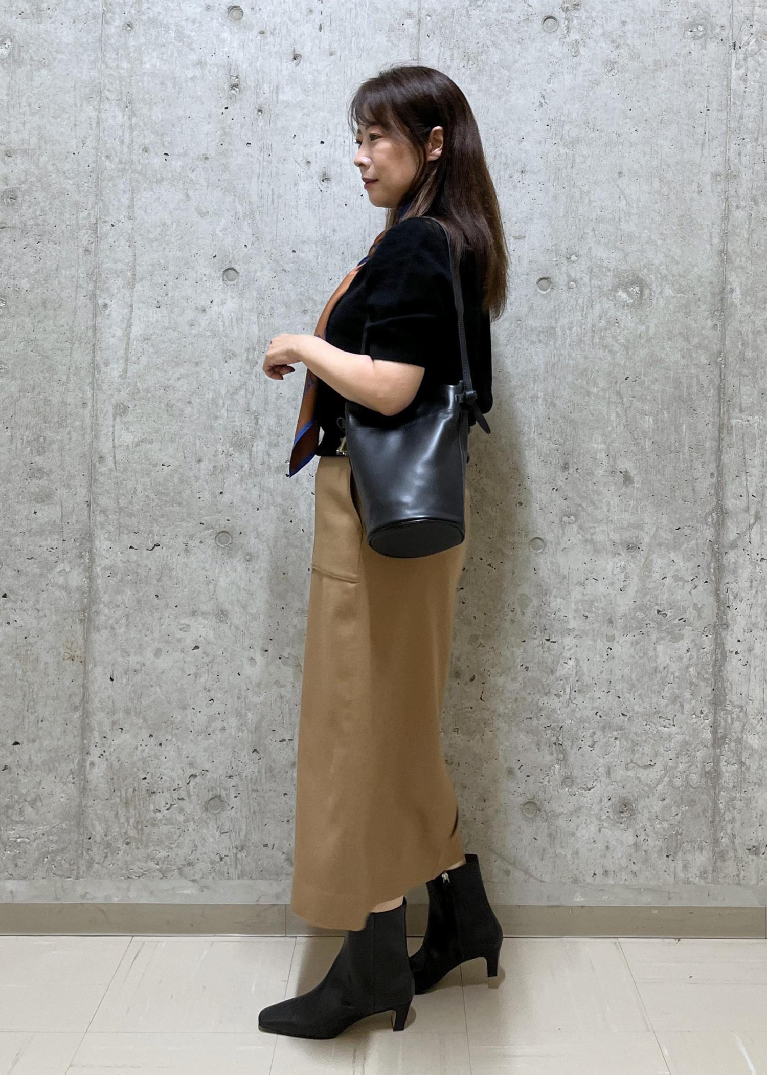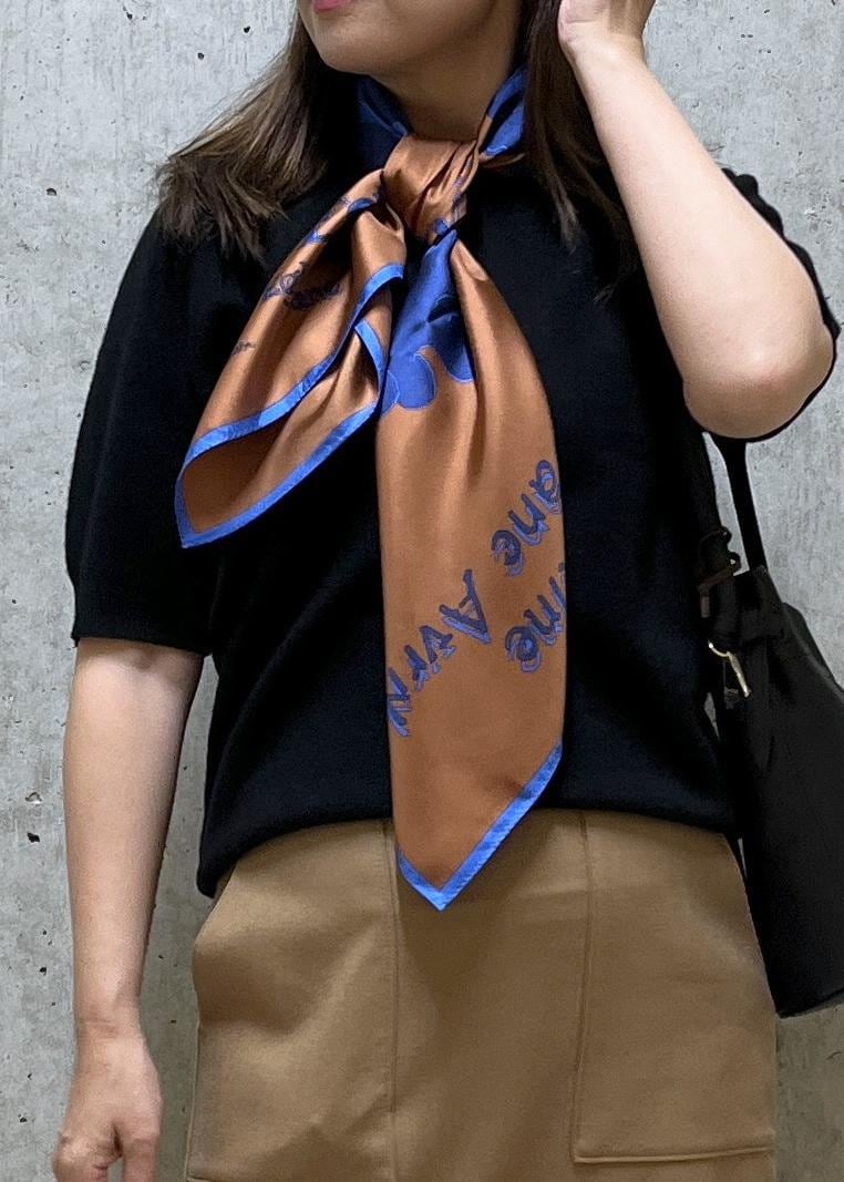 ポイントにロートレックのスカーフを巻き、シンプルなコーデに少し華やかな印象になるようにしました。