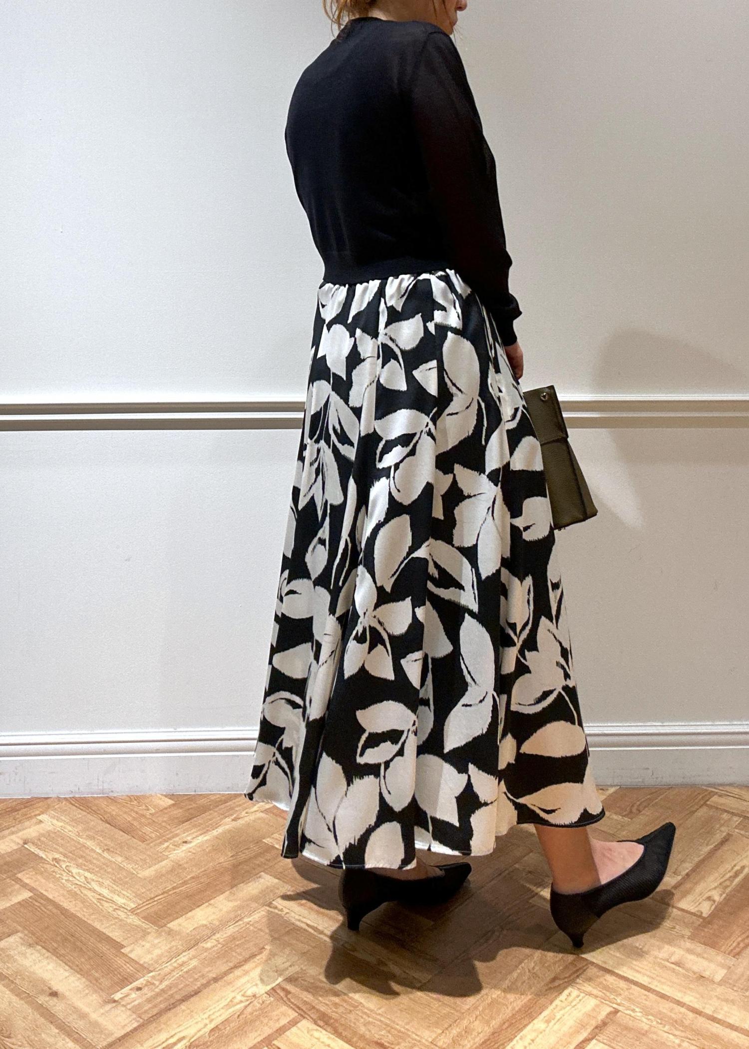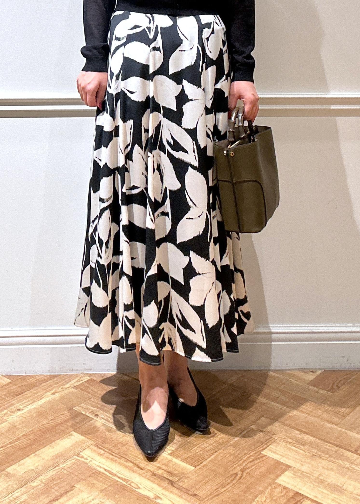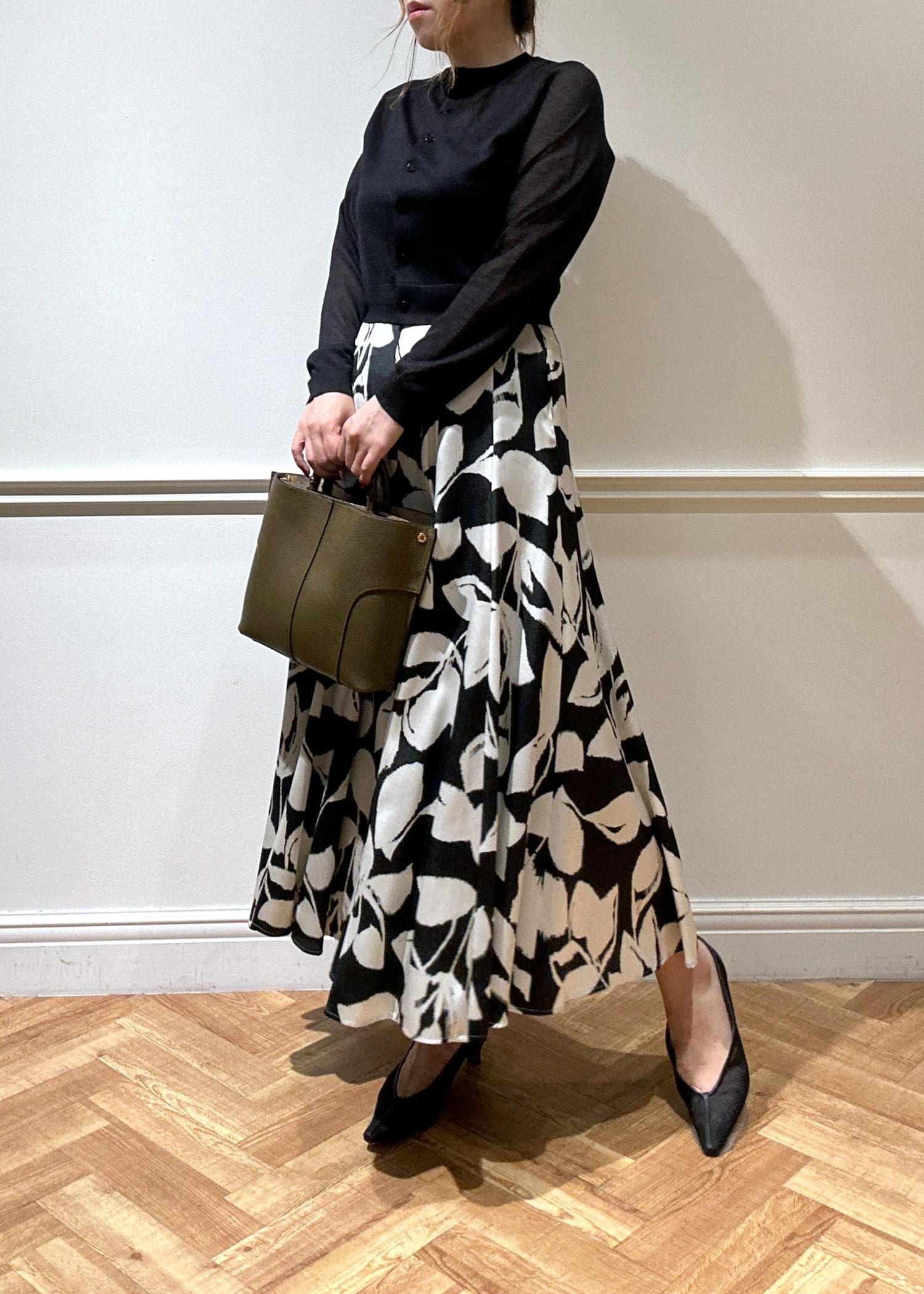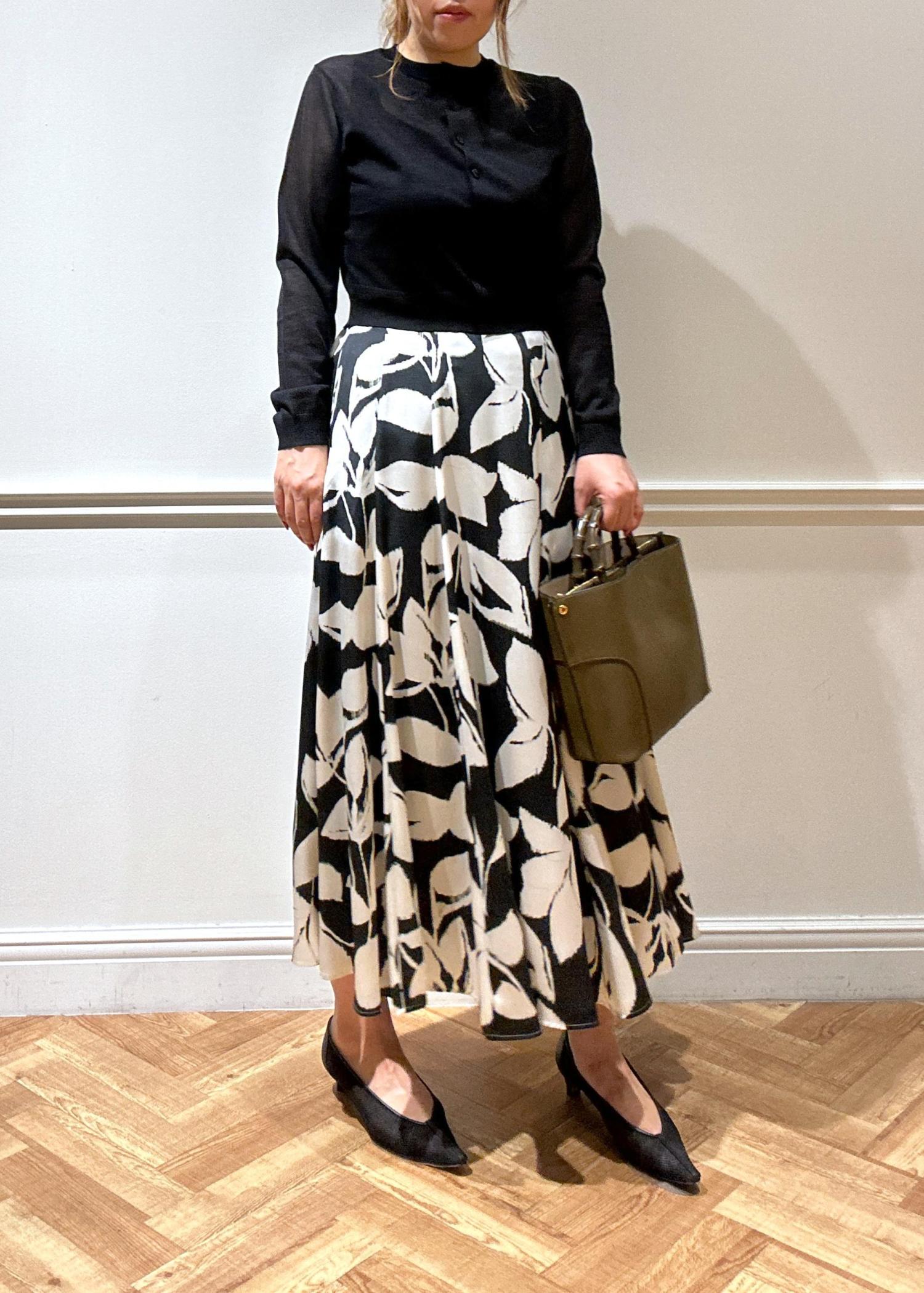 柄のスカートは同素材でパンツ、ブラウスも作っているのでセットアップで着ていただくのもおすすめです。