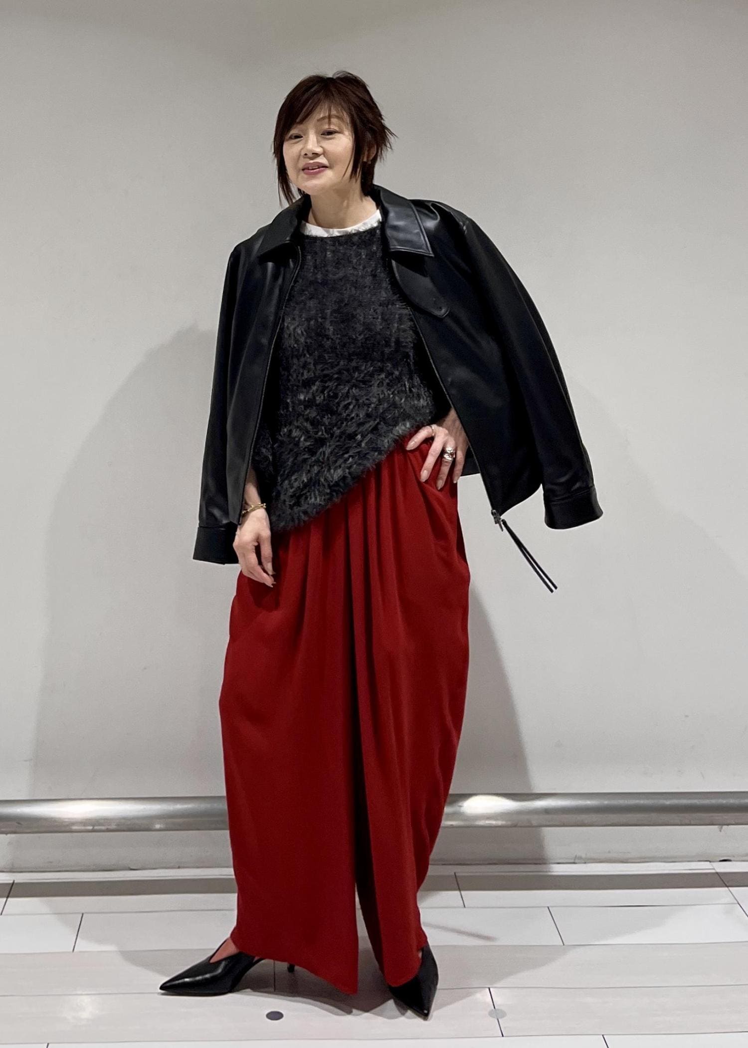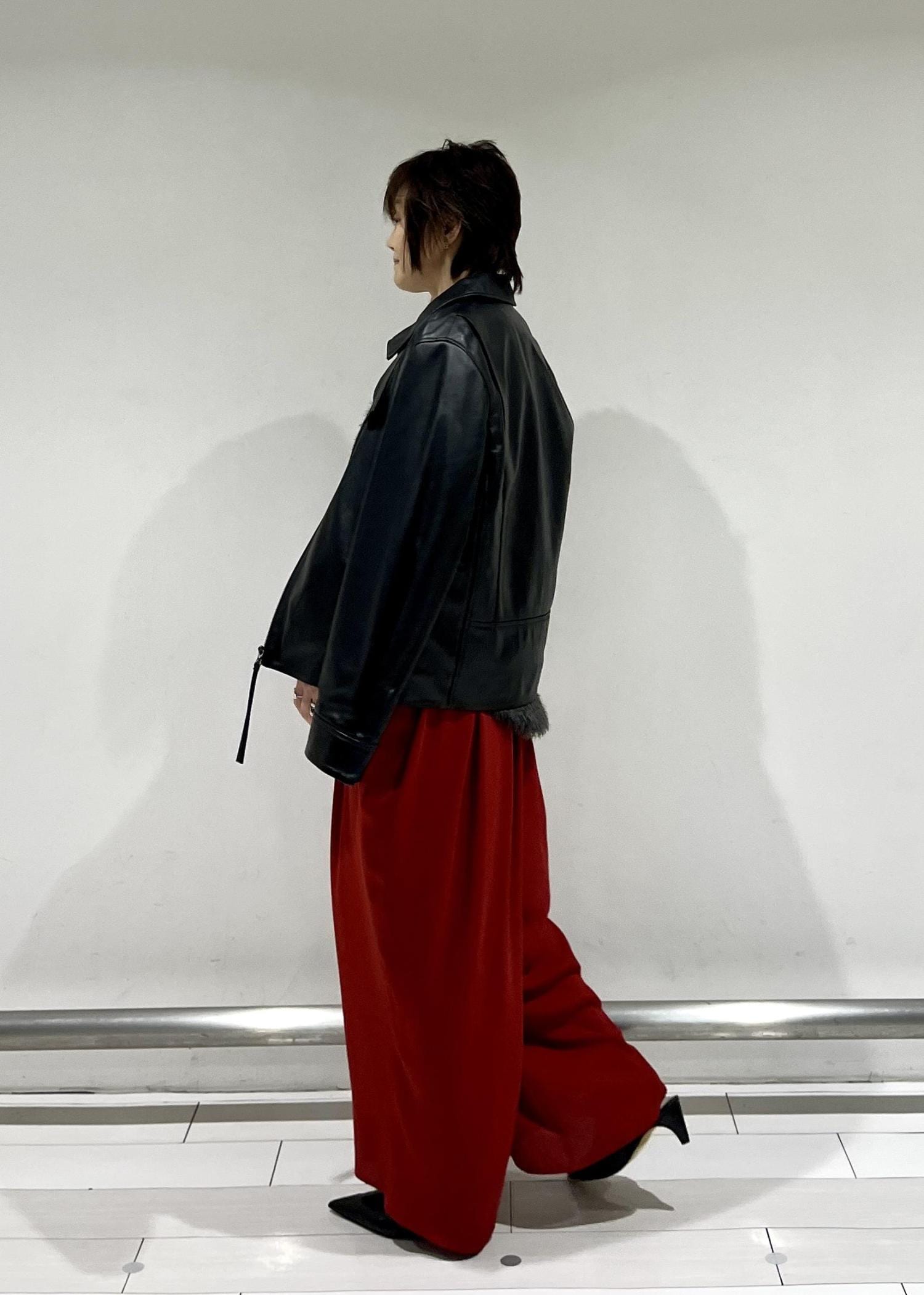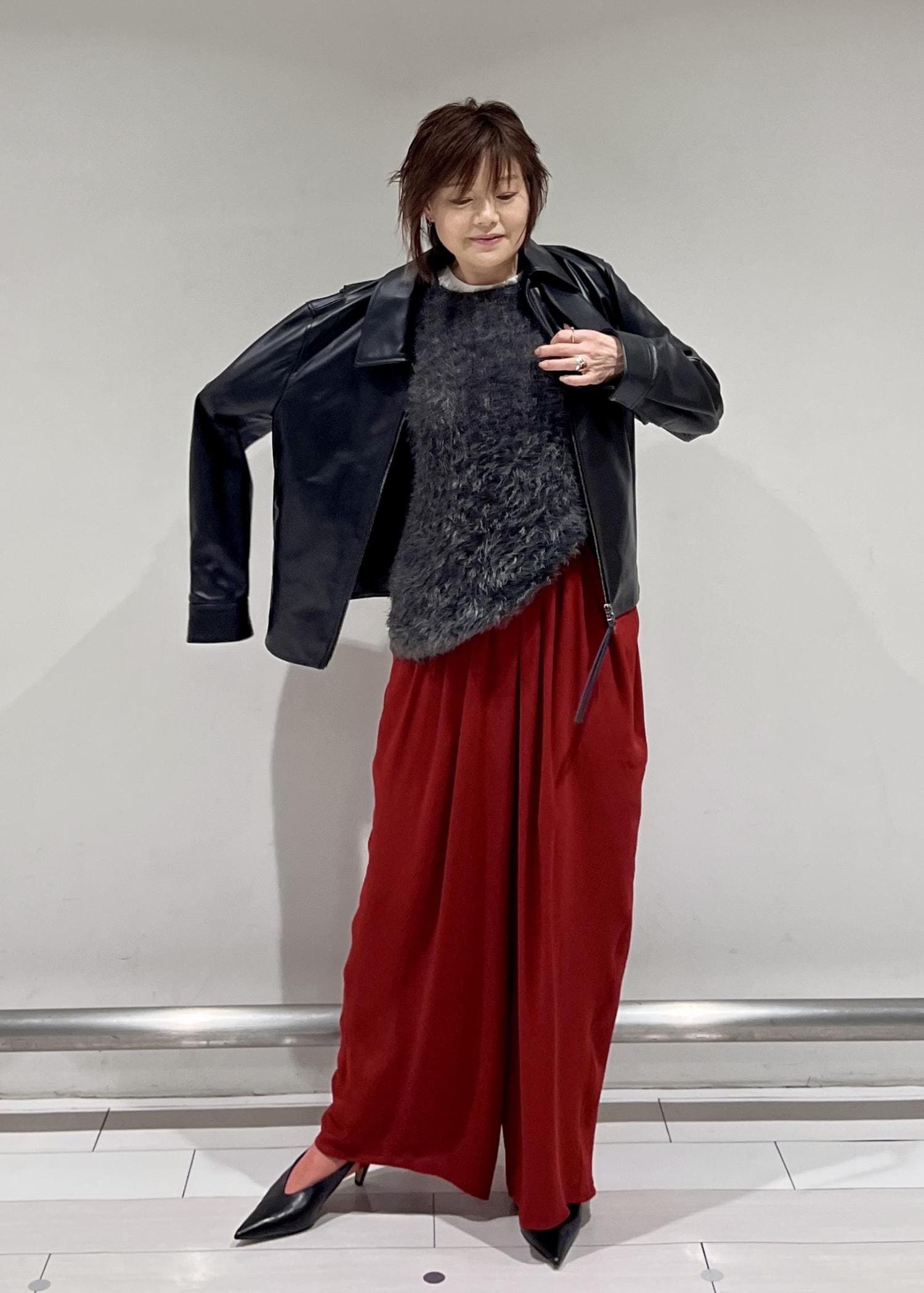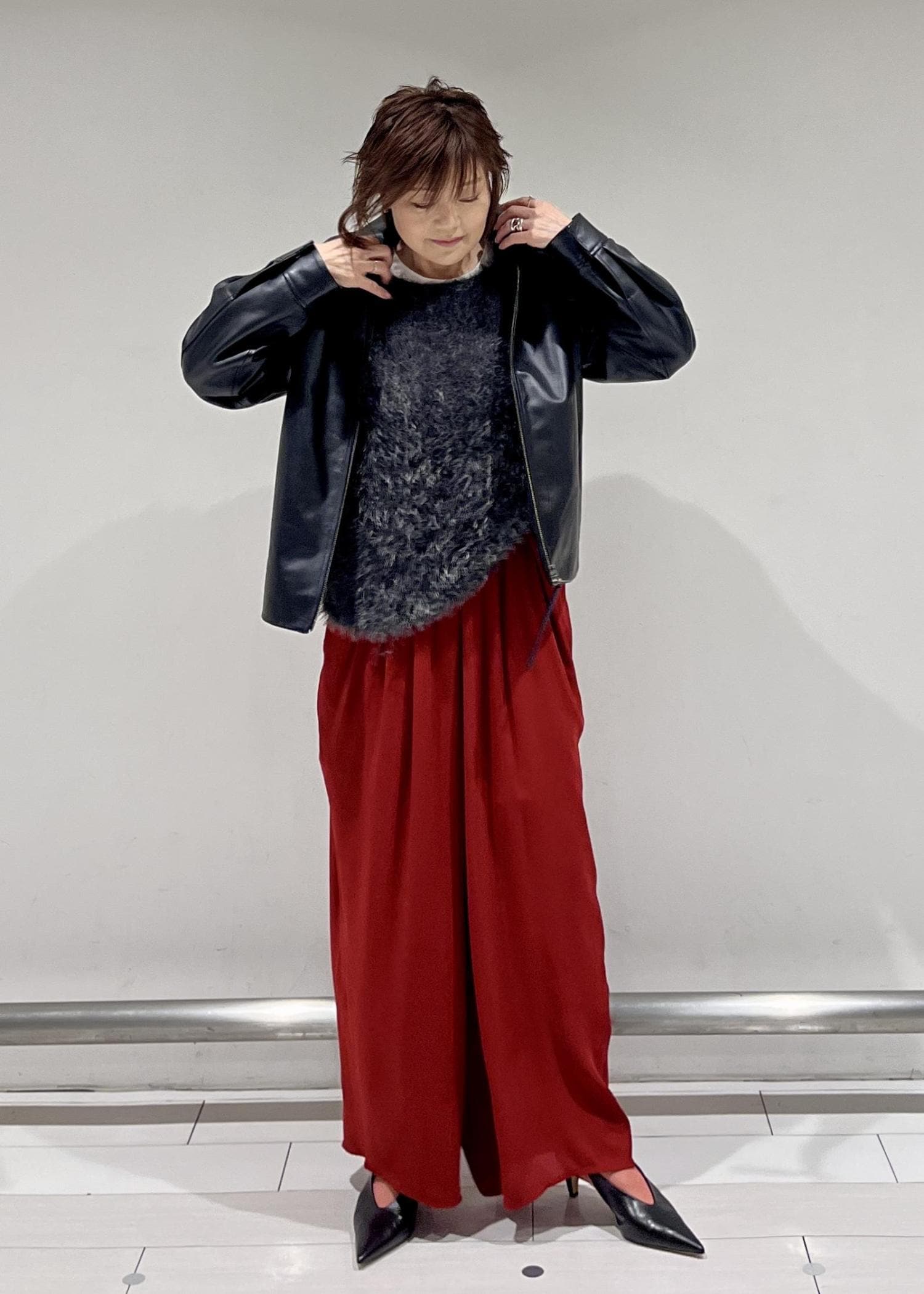 ジップブルゾンはちょっとハードな印象になりがちなのでシャギーニットのフワっとした質感とドレープ感のあるREALMのギャザーパンツでコントラストが映える女性らしいコーディネートを楽しみました。