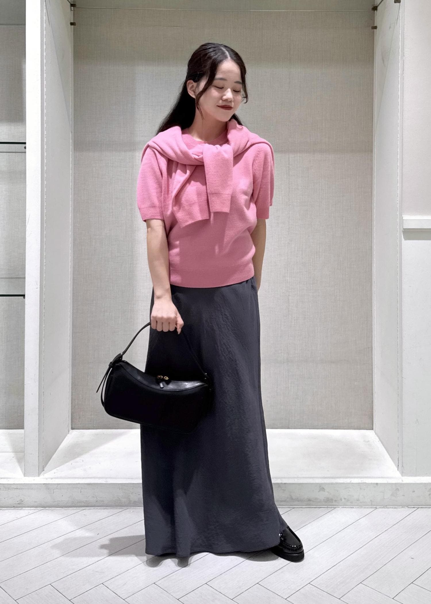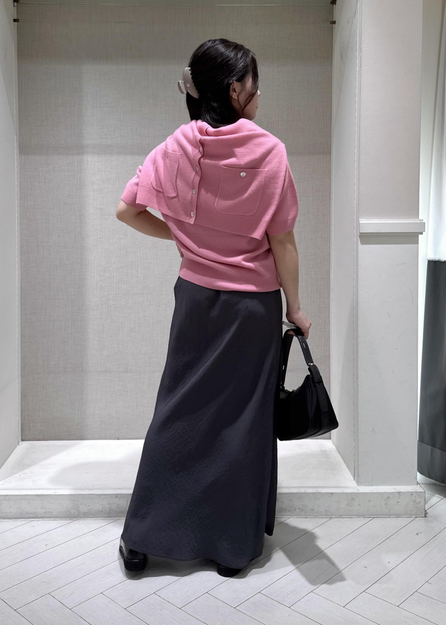 5分袖ニットとカーディガンのアンサンブルを着用してみました♩ セットできても、肩がけしても、着映えするピンクのカラーがオススメです!