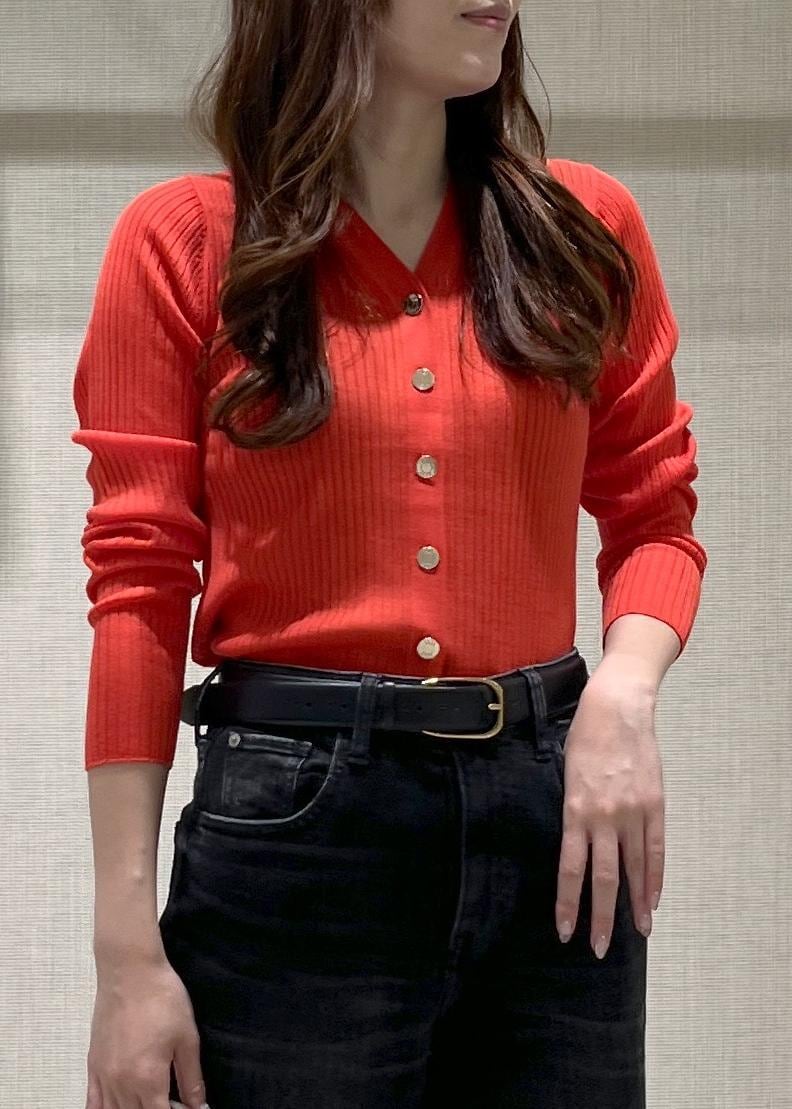 Vネックですっきり見え、ゴールドボタンが映えるのでアクセサリーいらずで華やかな印象になります。