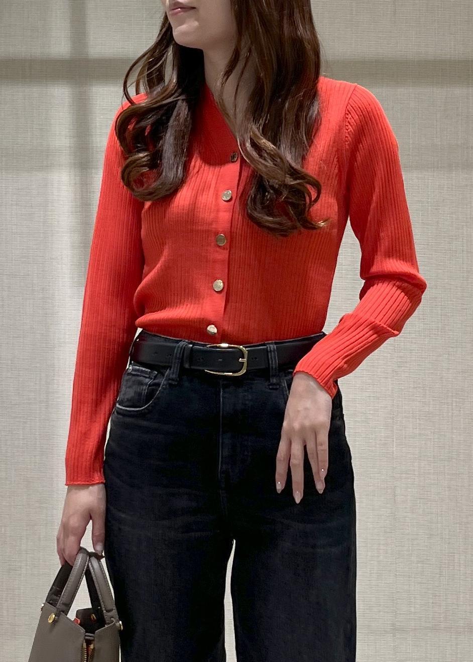 すっきりと身体に馴染むカーディガンは女性らしく上品な印象に◎羽織りにもトップス使いにもできて今の時期にさらっと着られるアイテムです。フロントにはロゴ入りのゴールドボタンがシンプルな中に華やかさをプラスしてくれます。