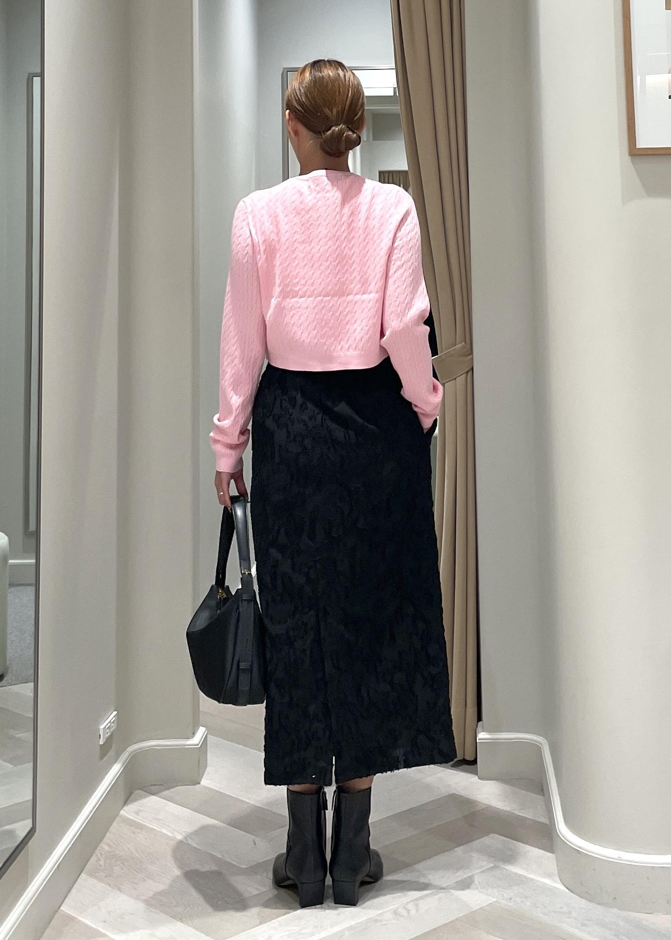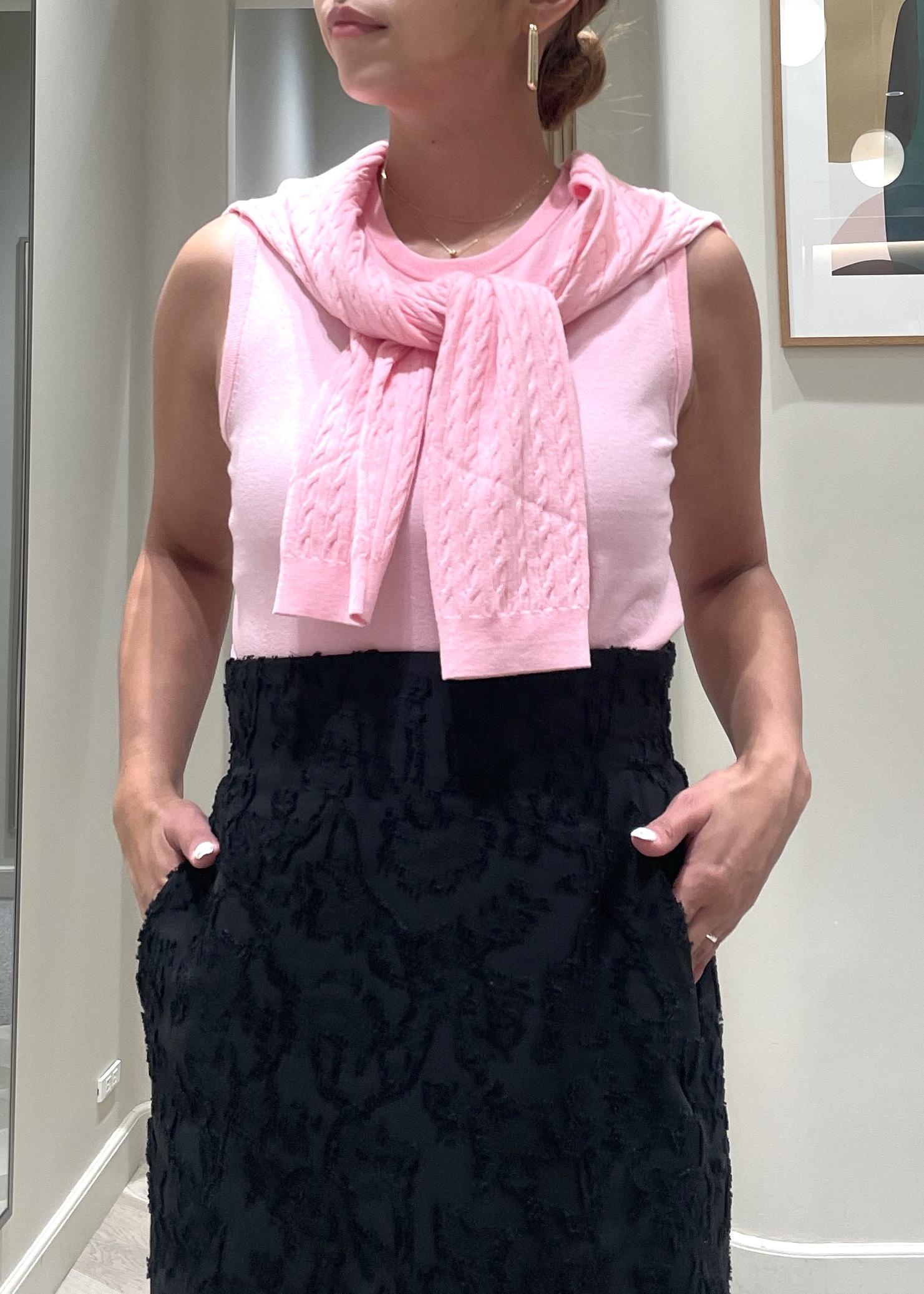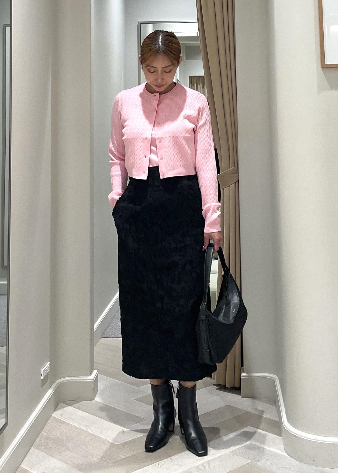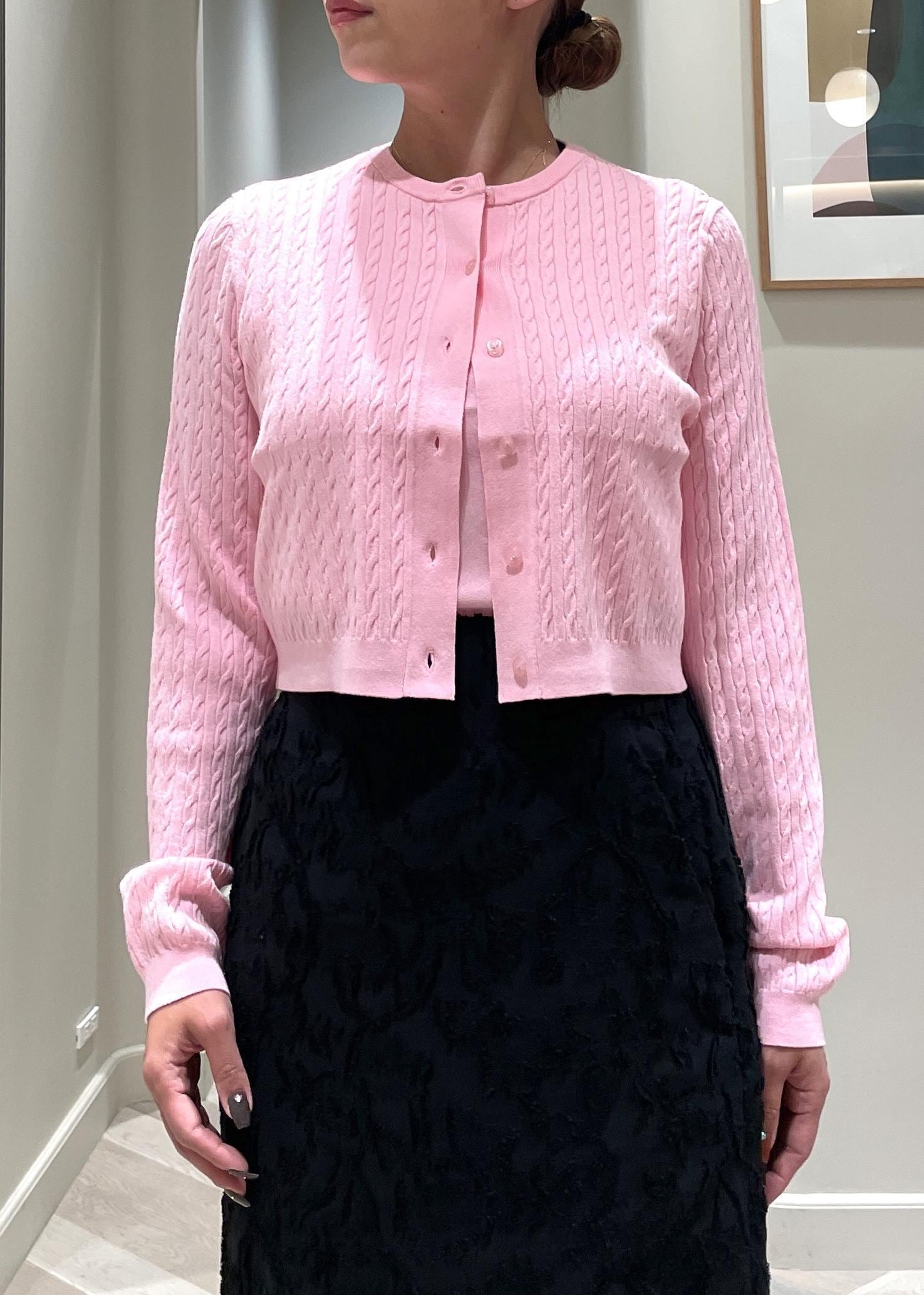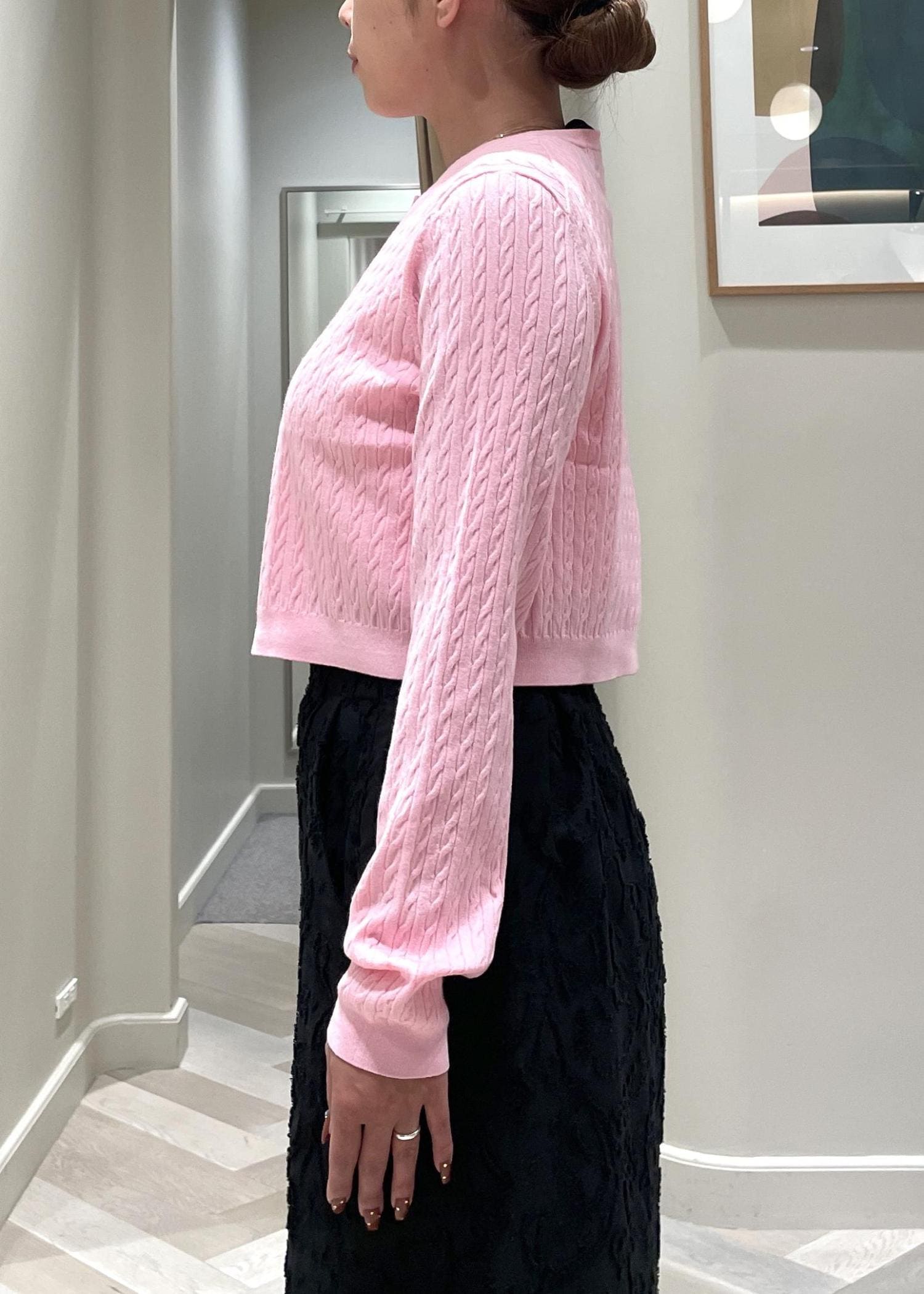ROPÉミニケーブルセパレートカーディガン(アンサンブル)/ イージーケアピンク系 / F¥21,560レビュー160cmが着用で、丈感はおへそ辺り。