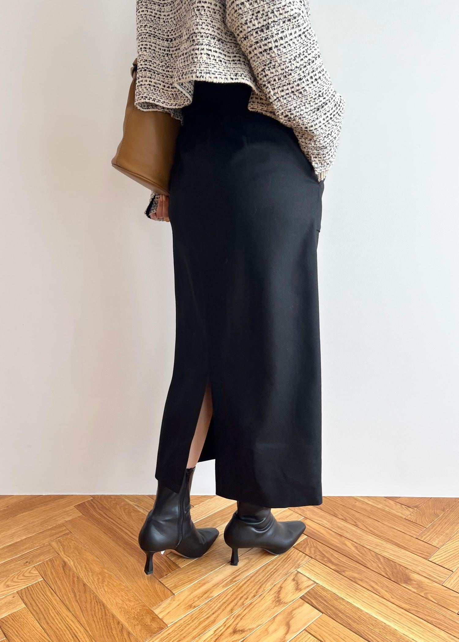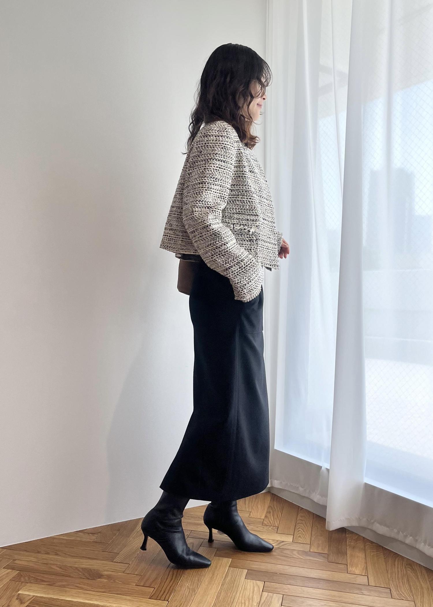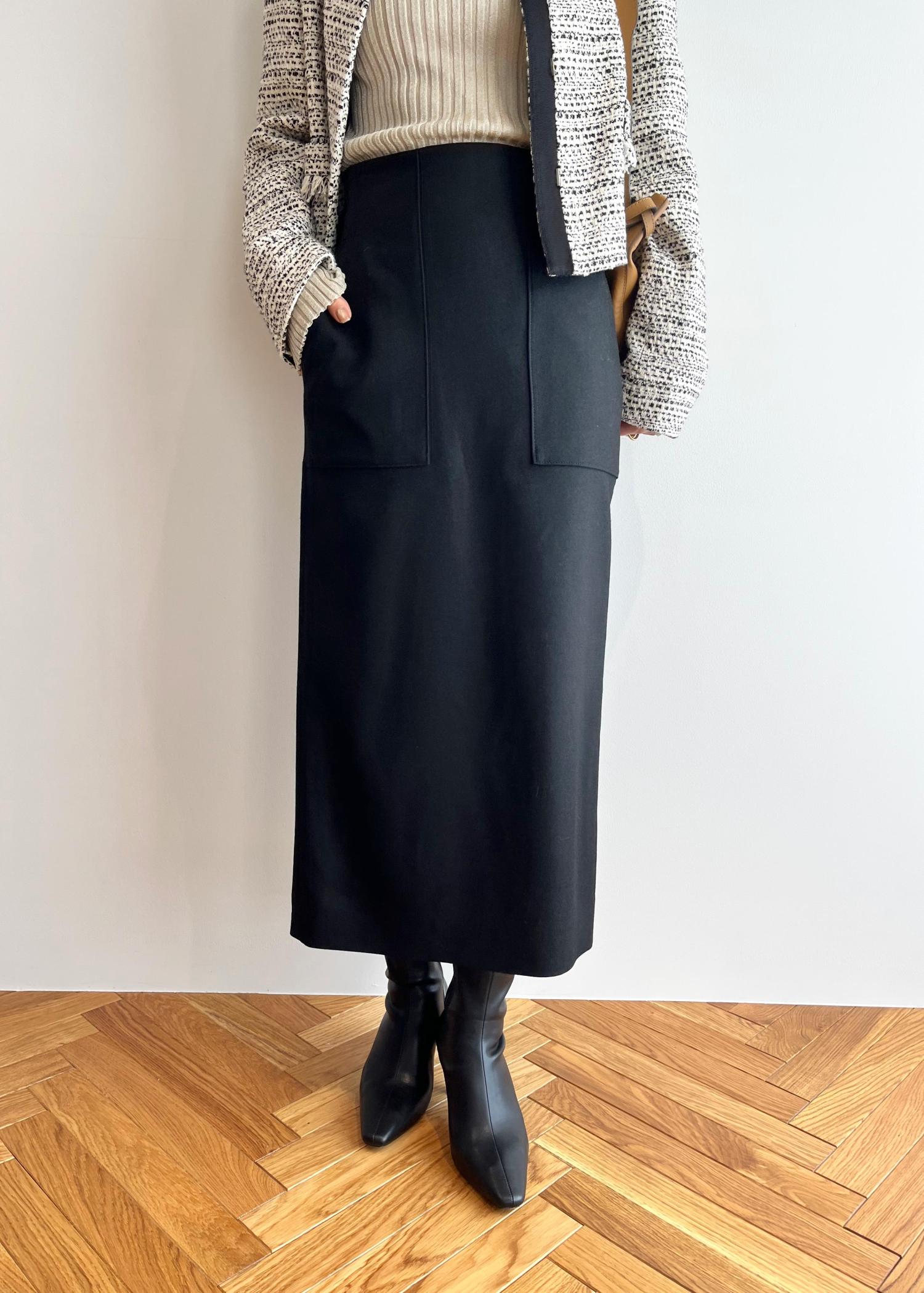 定番人気のタイトスカート。ハイウエストでポケットがポイントの、お腹周りがすっきり見えるデザインです。