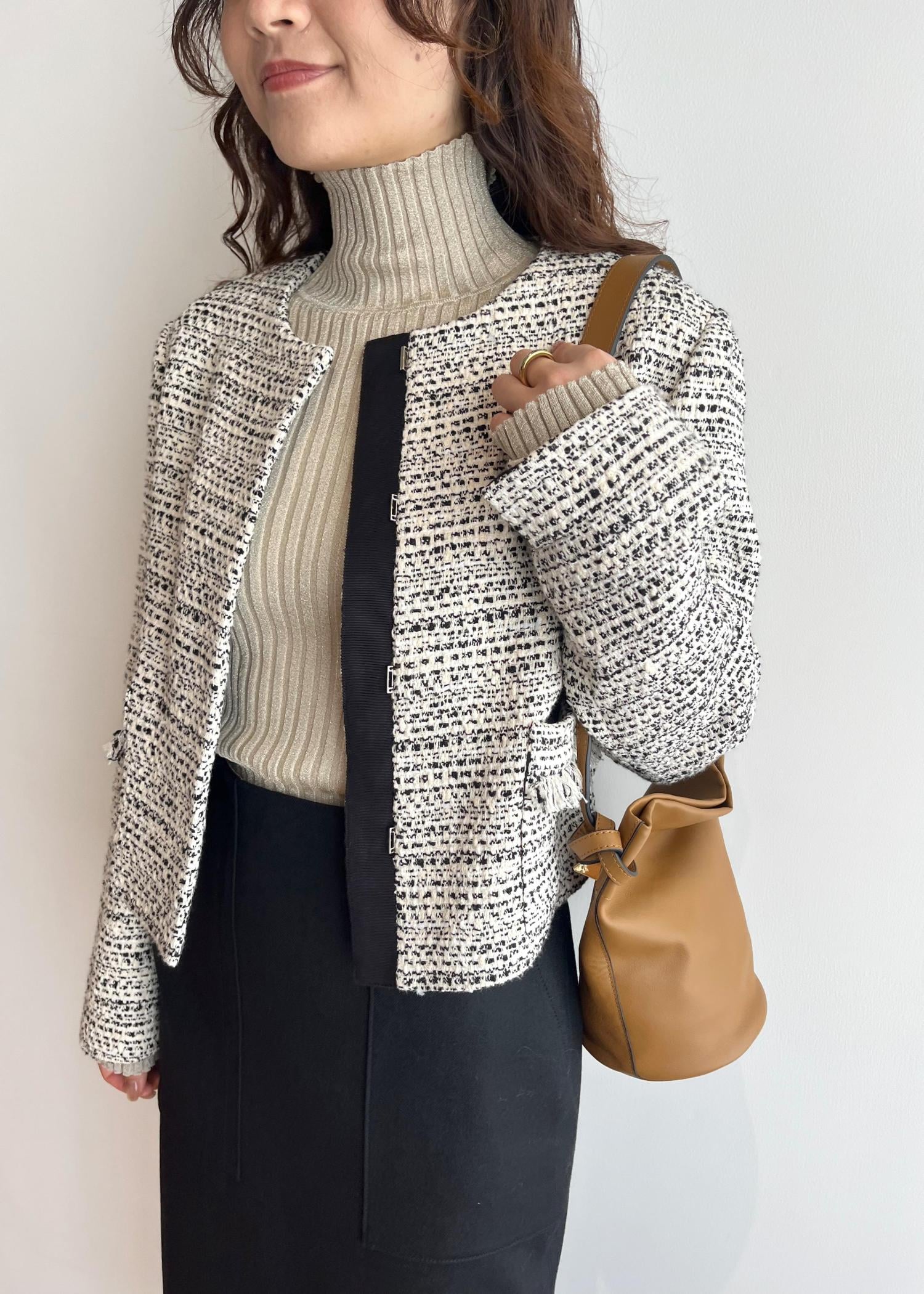 伸び感のあるリブデザインで、程よくフィットします。袖丈は手の甲が隠れる長めで、タートルも少し高さがありました。