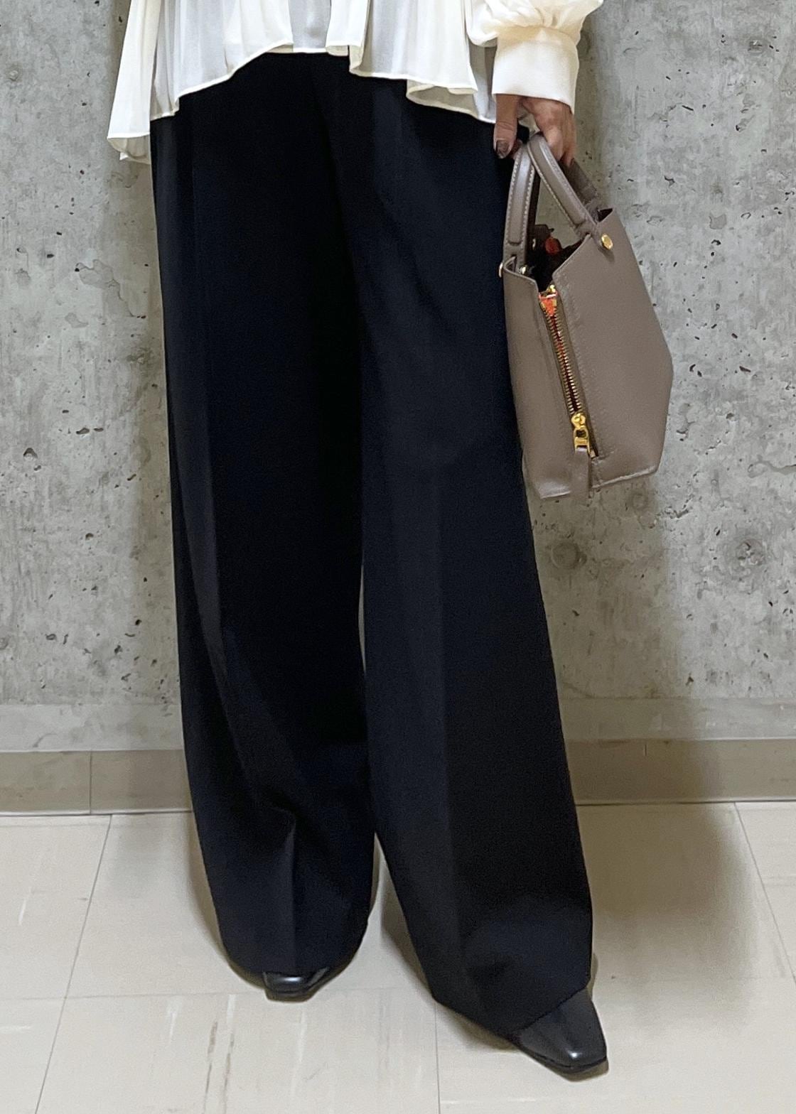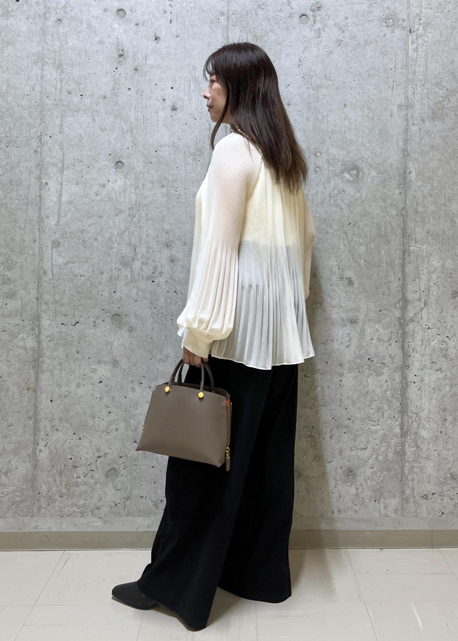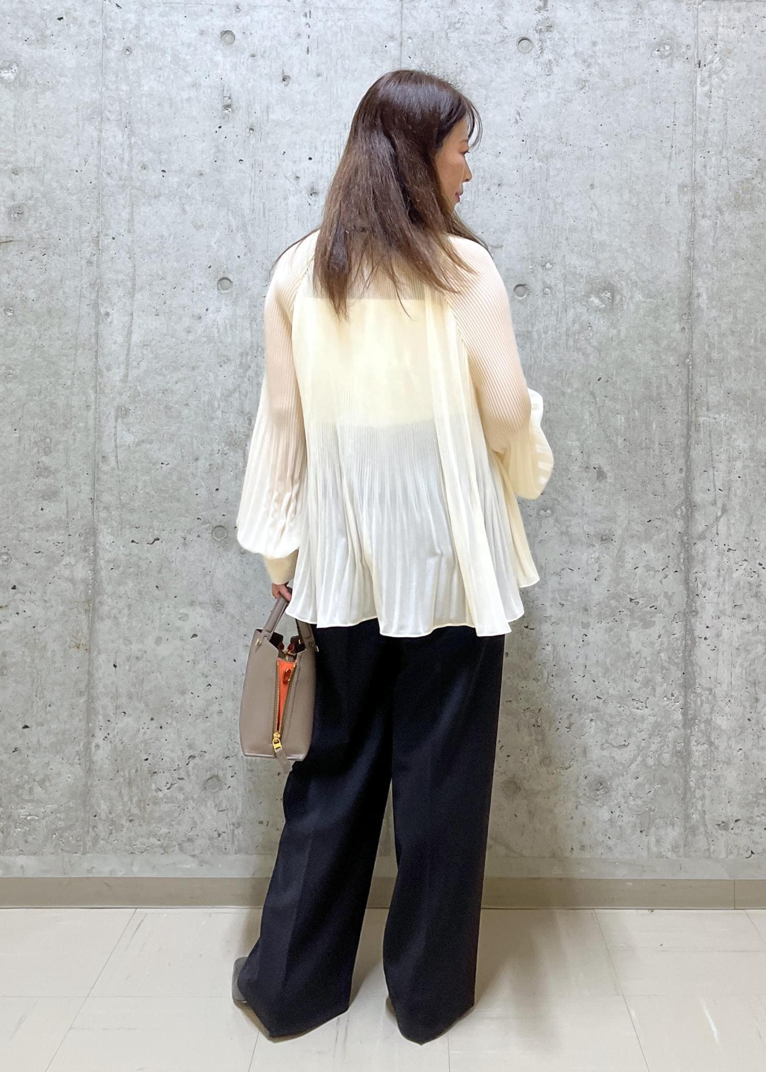 ワイドパンツとプリーツの入ったブラウで、可愛く見えて体型カバーもしてくれるコーディネートです。