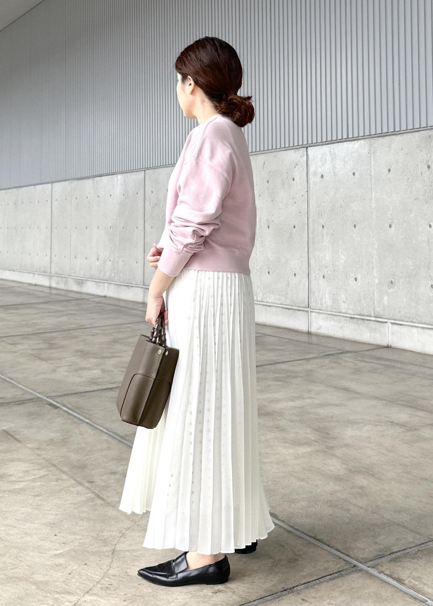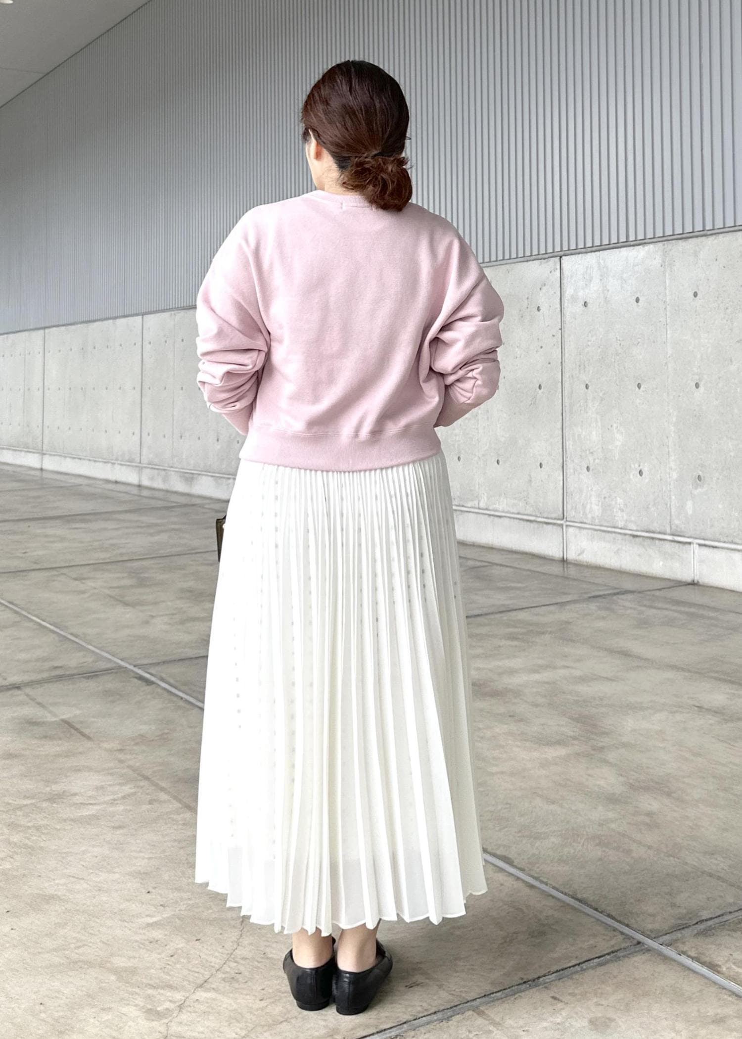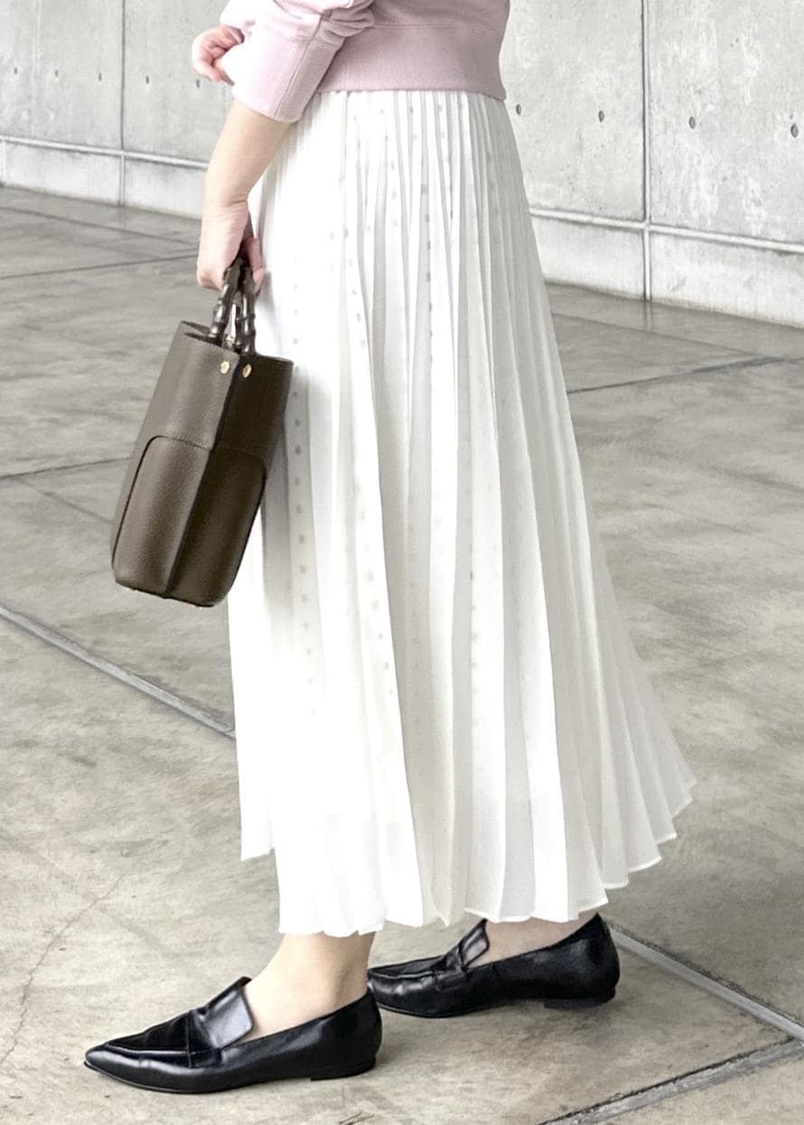 プリーツからスクエアドットプリントがさり気なく透ける軽やかな印象のスカートです。