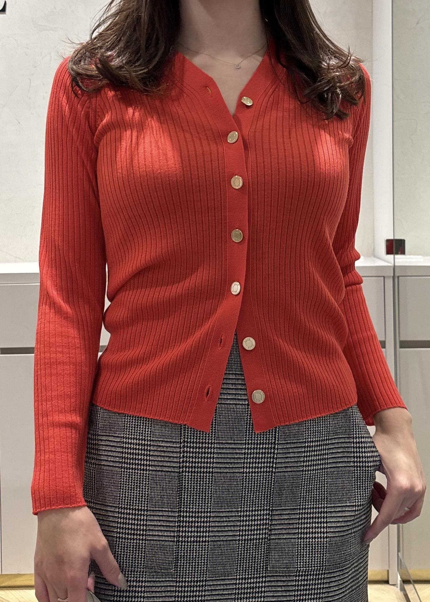 華やかな印象の金ボタンデザインで、ボタン位置はかがんだ時やサイドから胸元が見えにくく設定しています。太めのリブが身体のラインを拾いすぎず、程よくスッキリしたシルエットで着用できます。