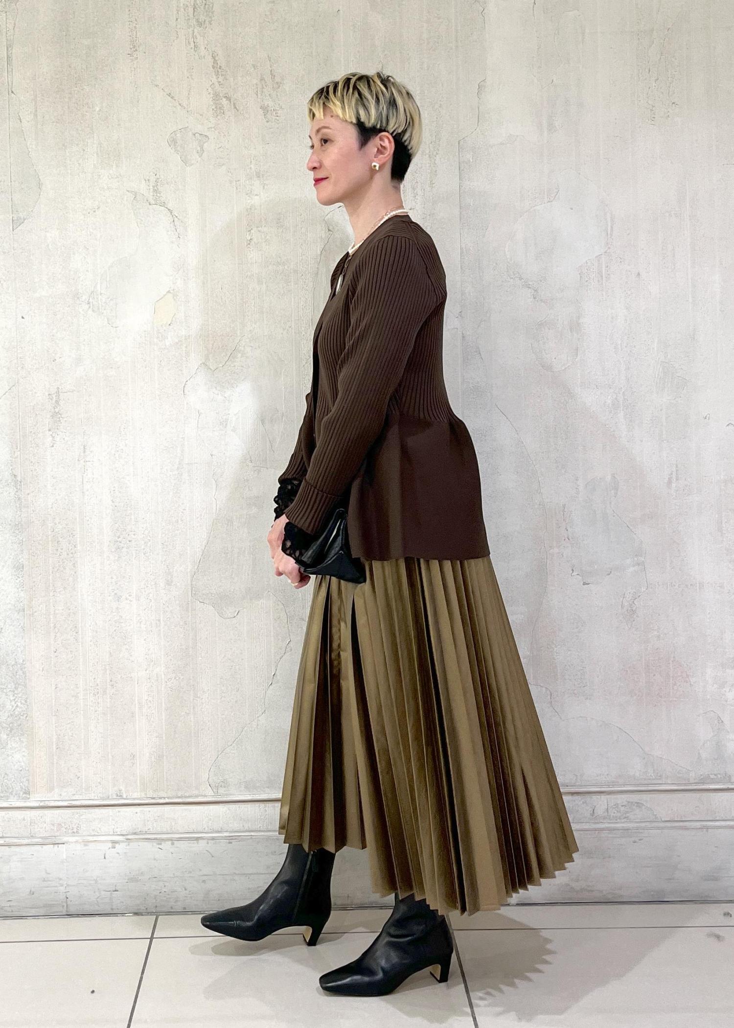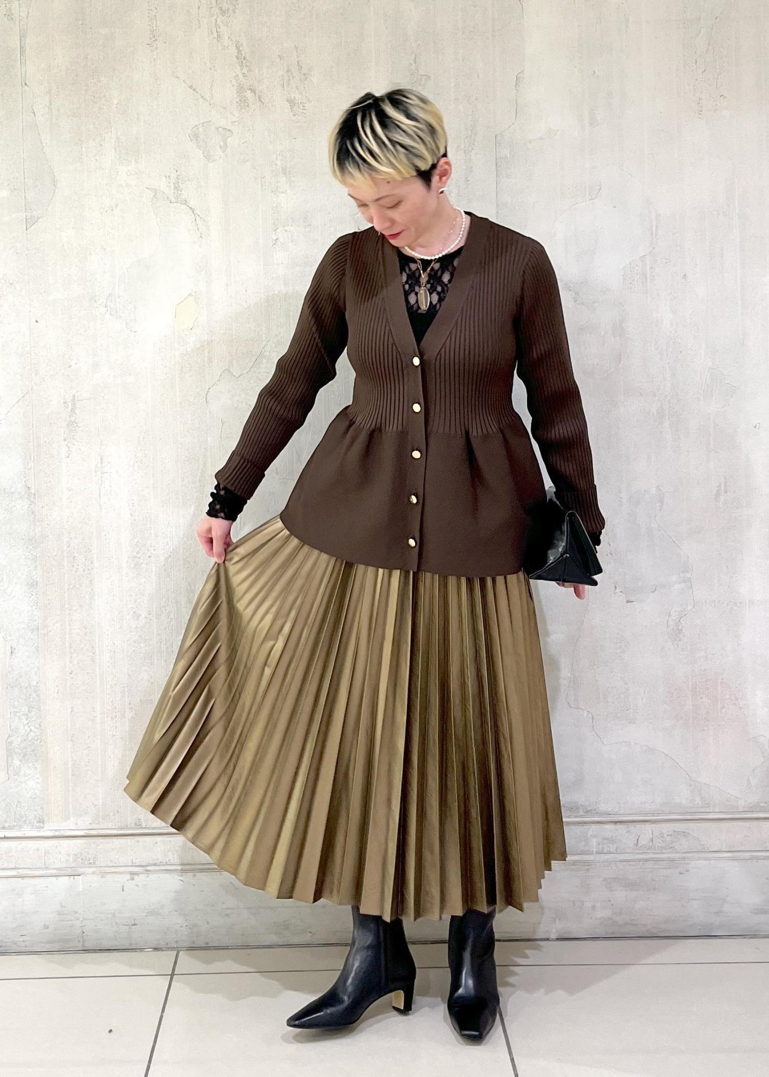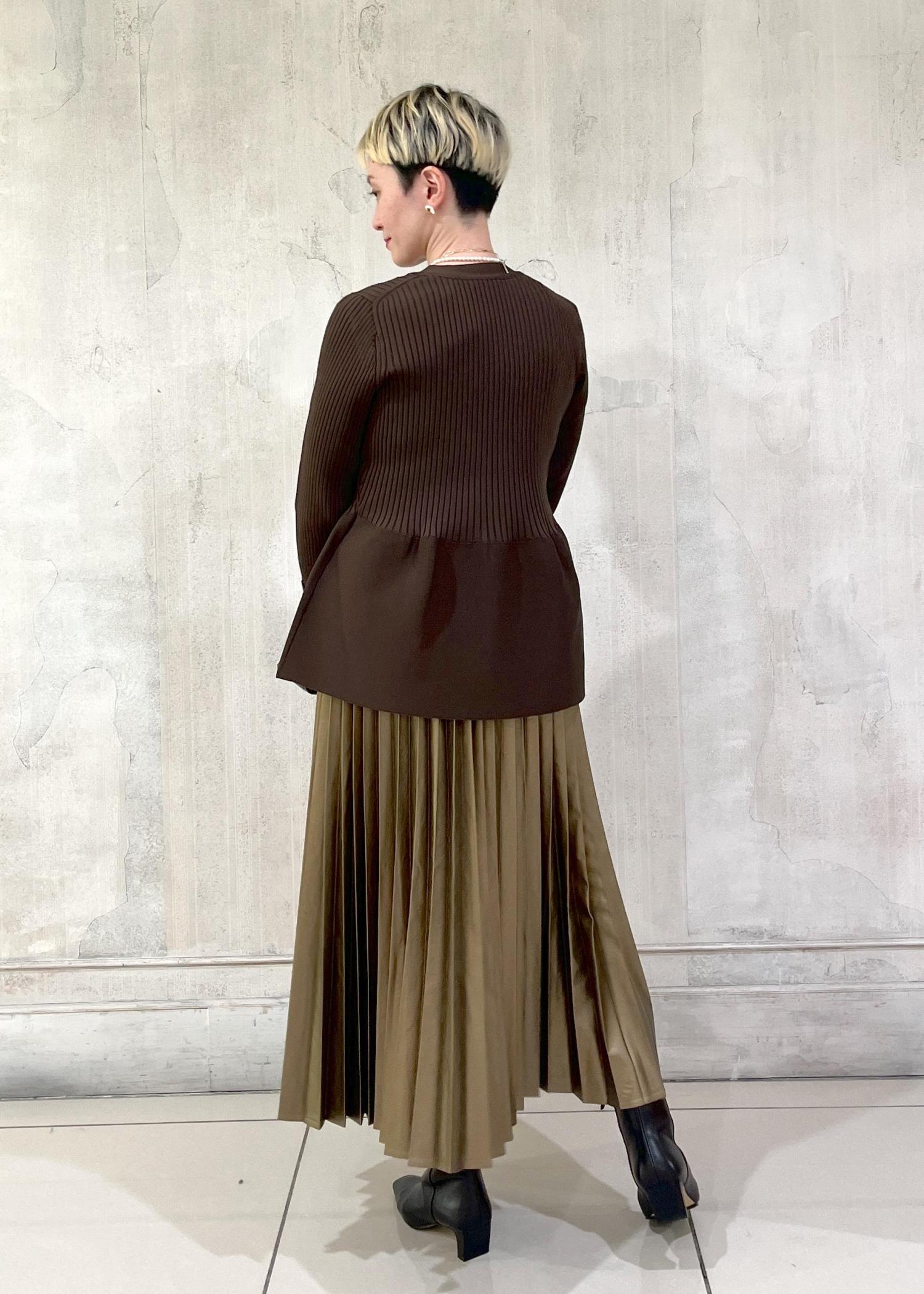 シンセティックレザーというフェイクレザーのプリーツスカート。硬そうに見えますが、裏面はさらっとした布帛素材で柔らかな着心地です。