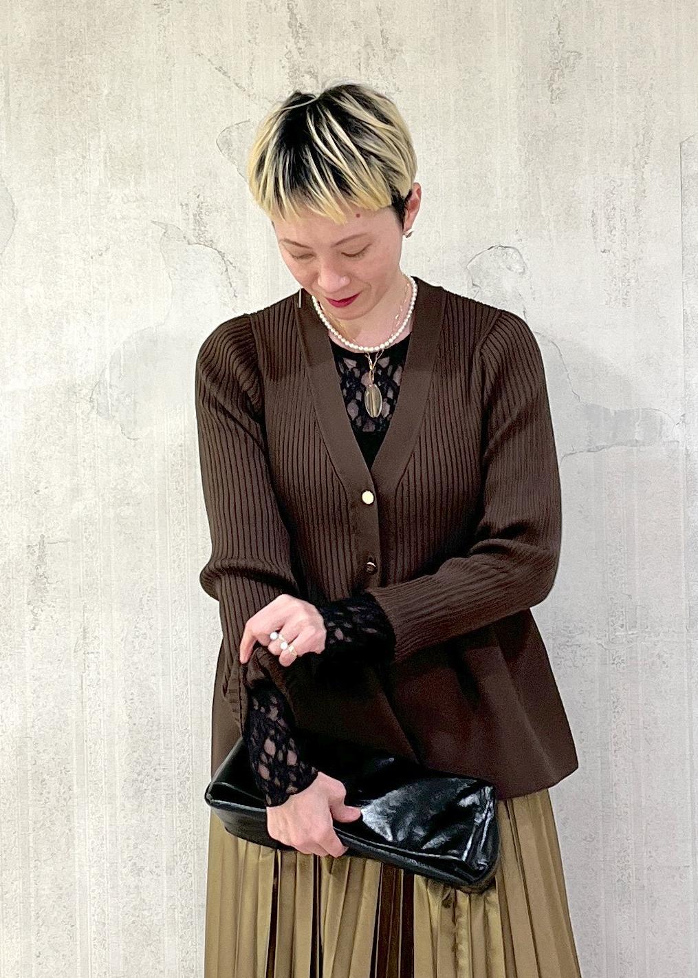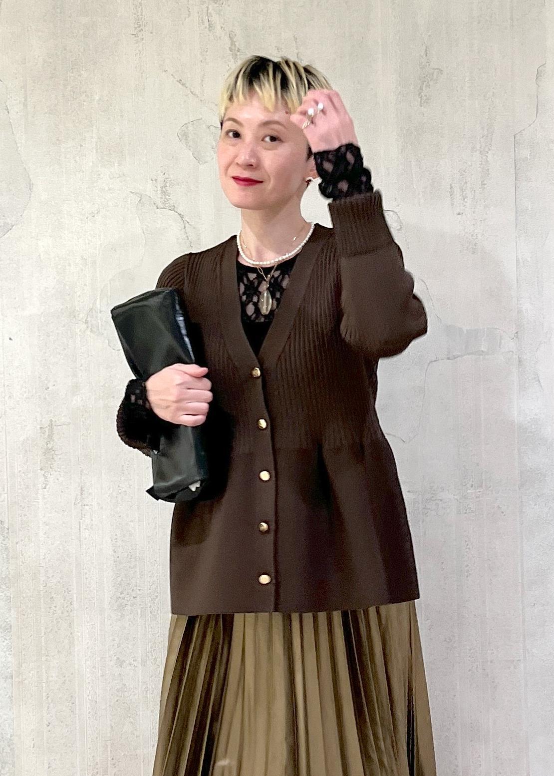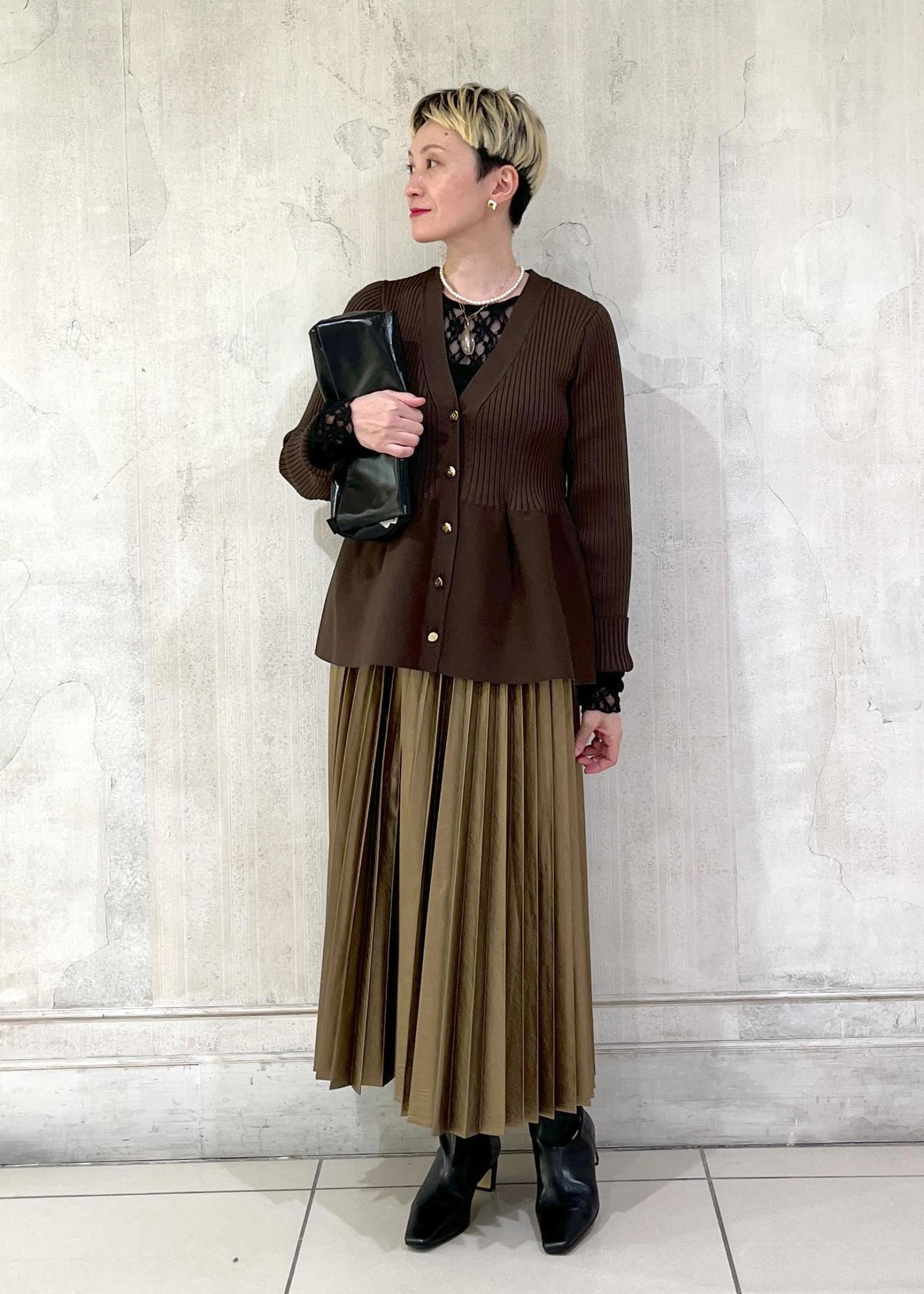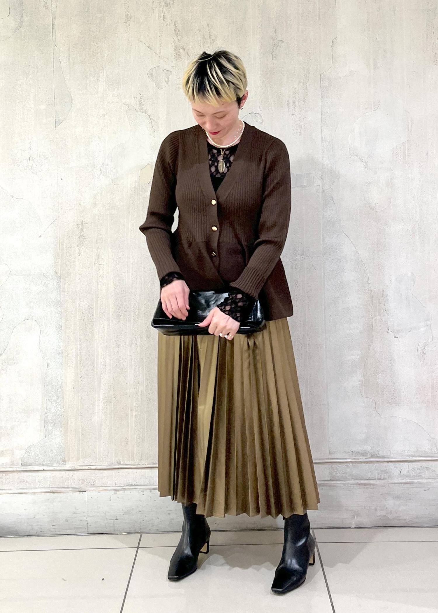 シンセティックレザーというフェイクレザーのプリーツスカート。硬そうに見えますが、裏面はさらっとした布帛素材で柔らかな着心地です。