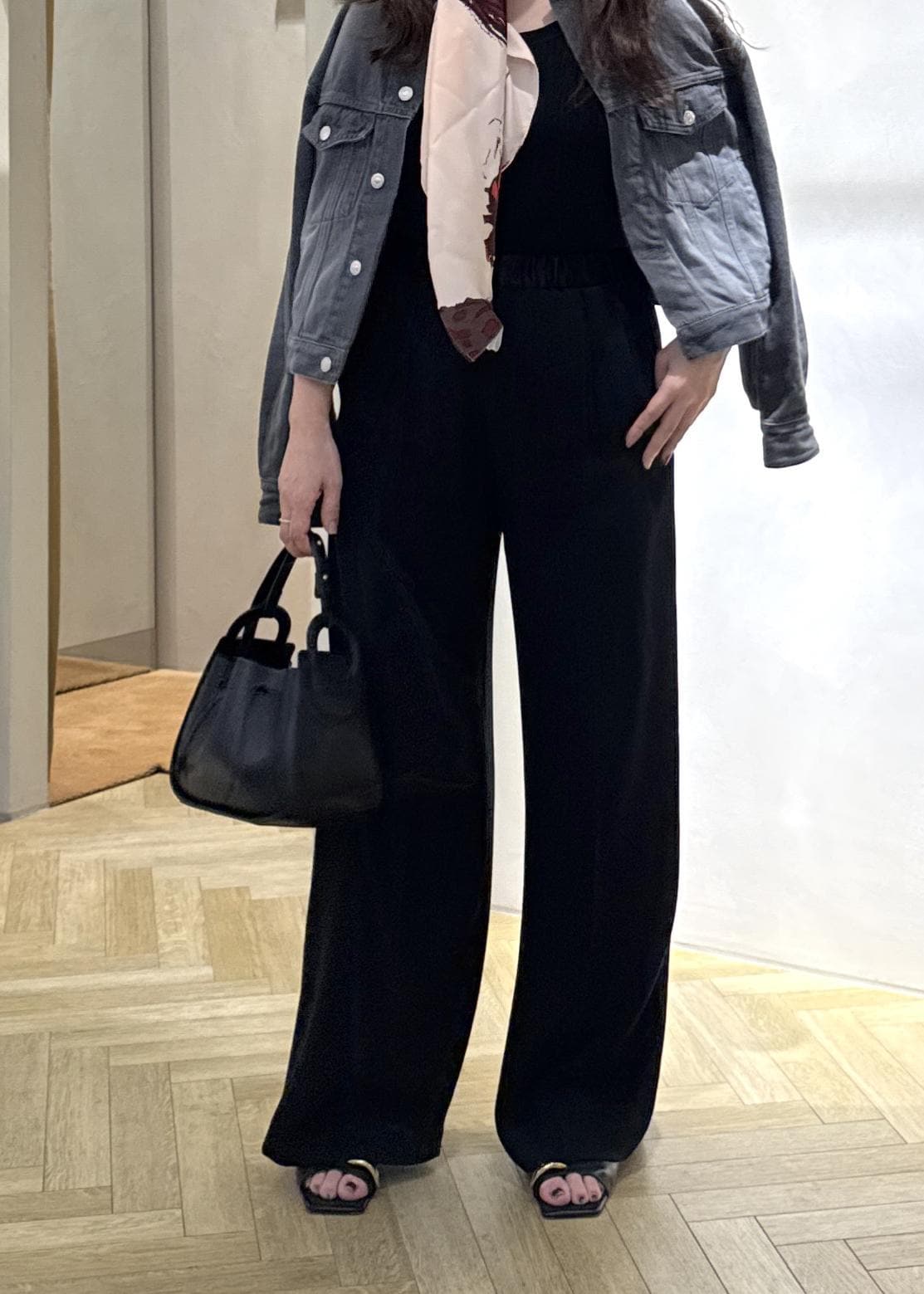 長さは私の身長、体型でフラットシューズで合わせるなら2〜2.5センチ丈詰めが必要。ヒールなら丈詰めなしで大丈夫でした。