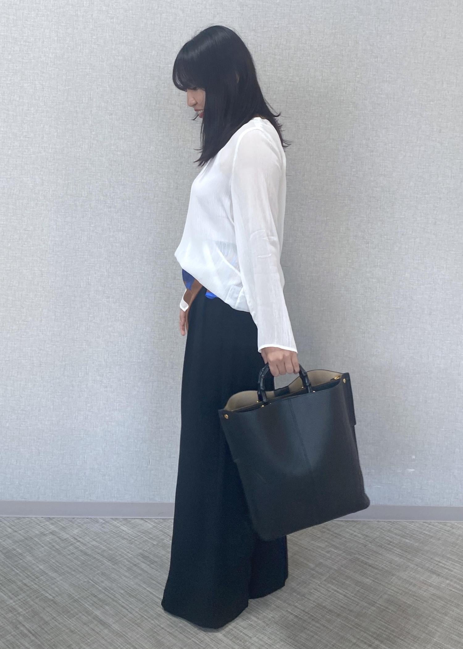 ブラックのワイドパンツで全体を引き締め、モード感のある小物で都会的にまとめました。