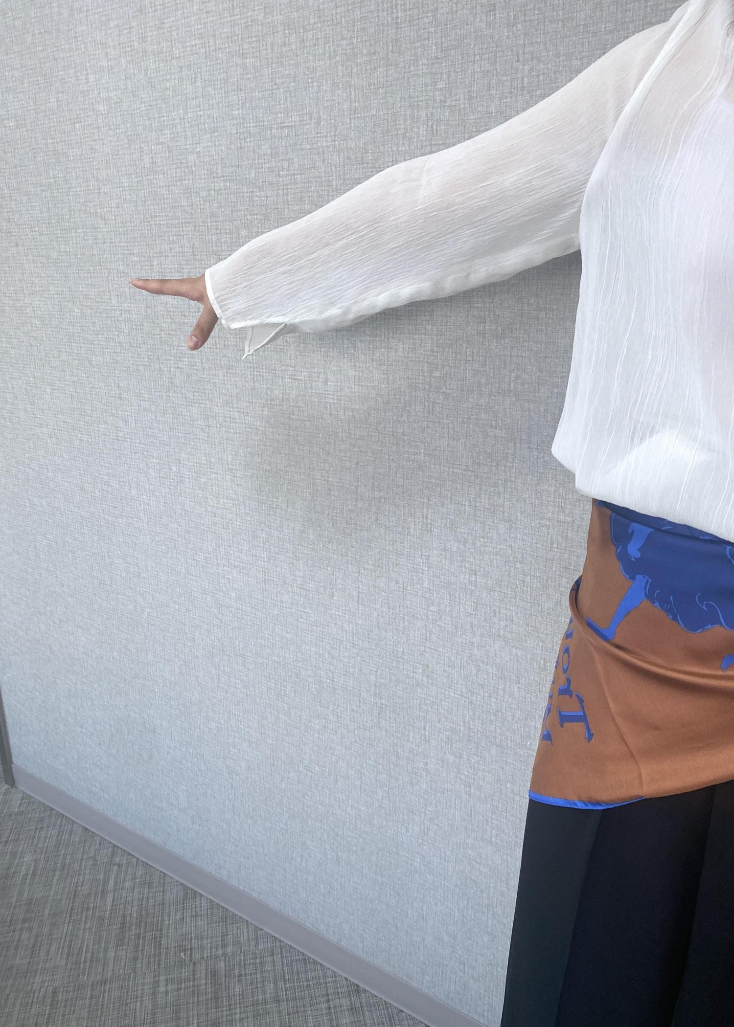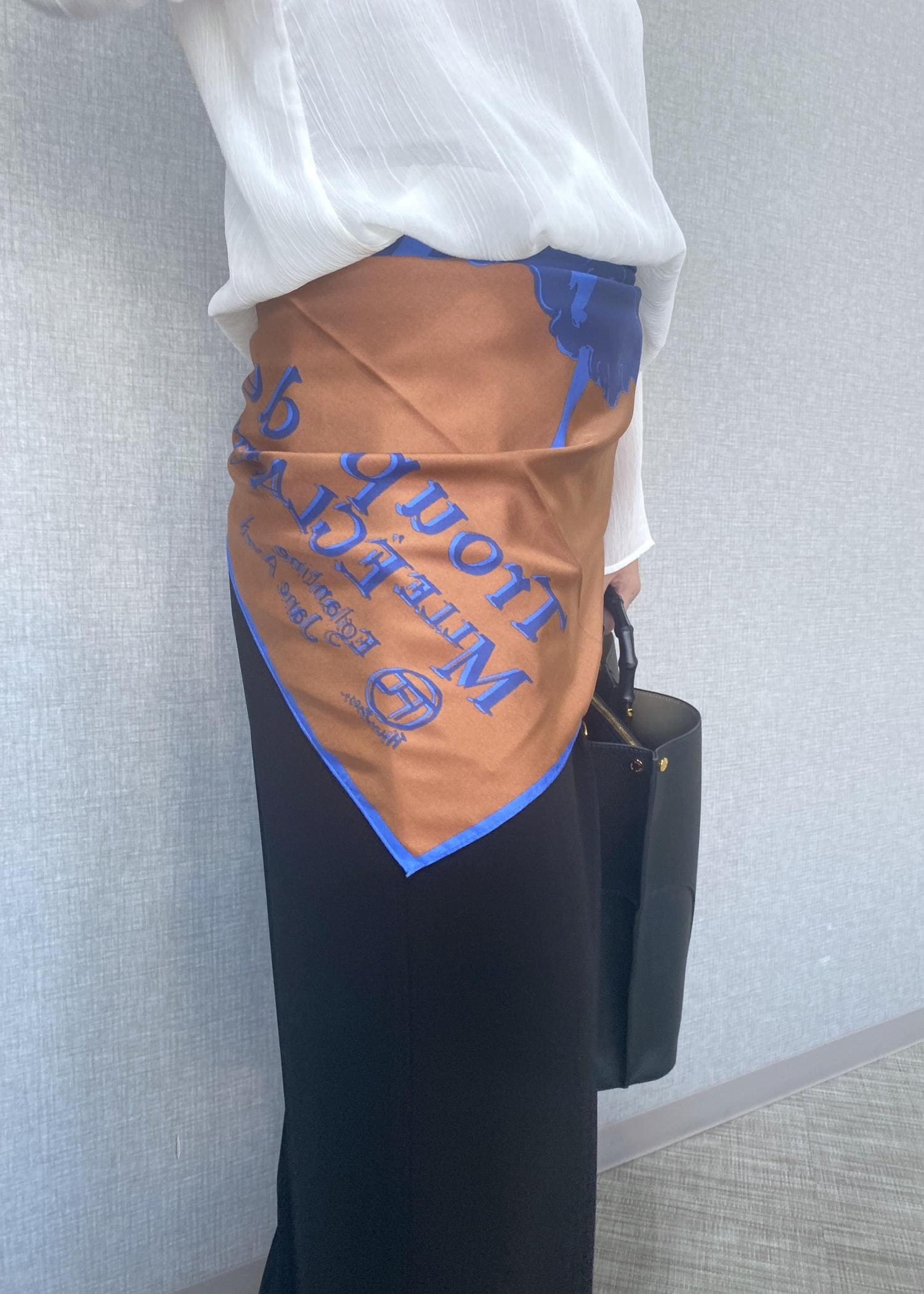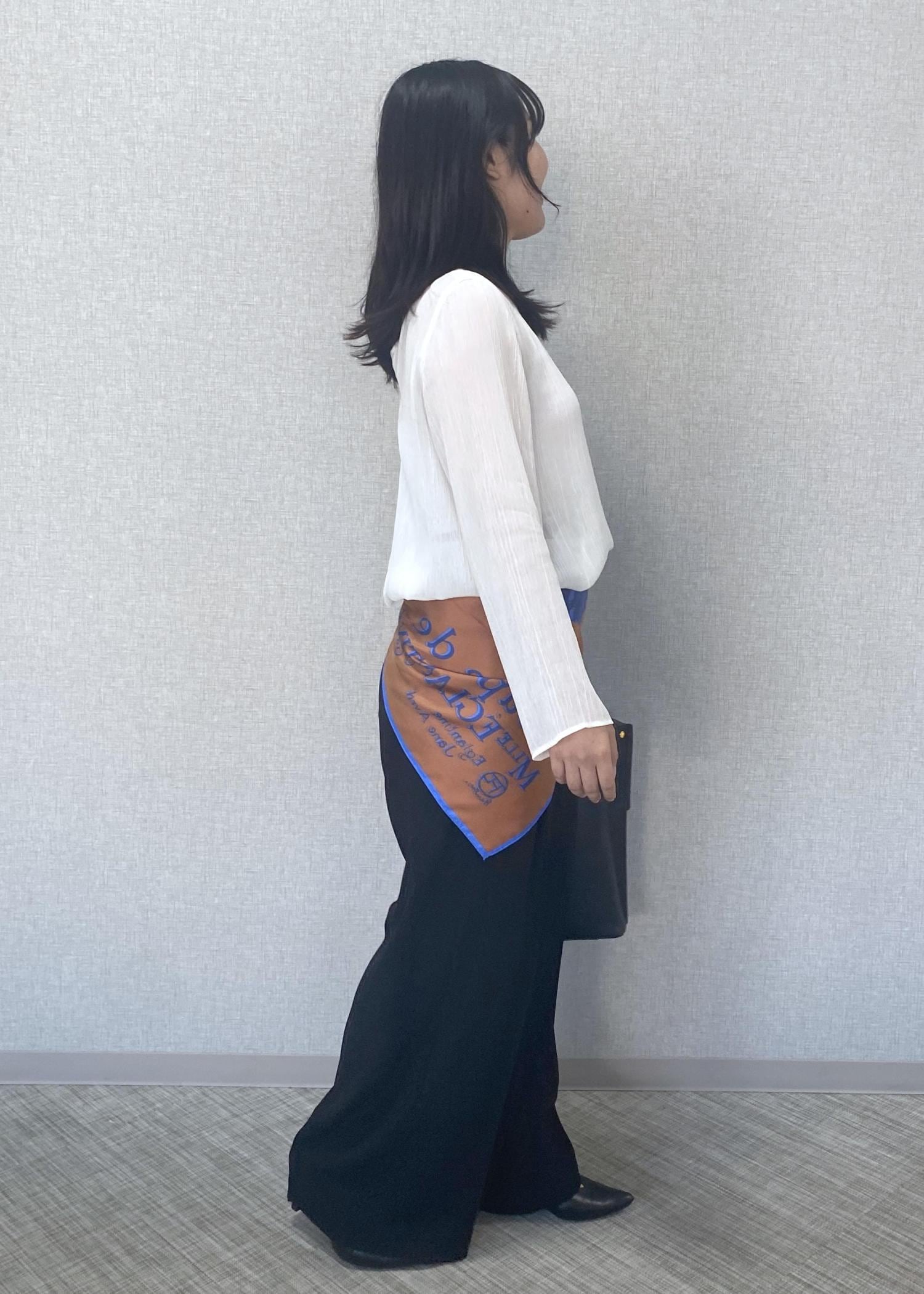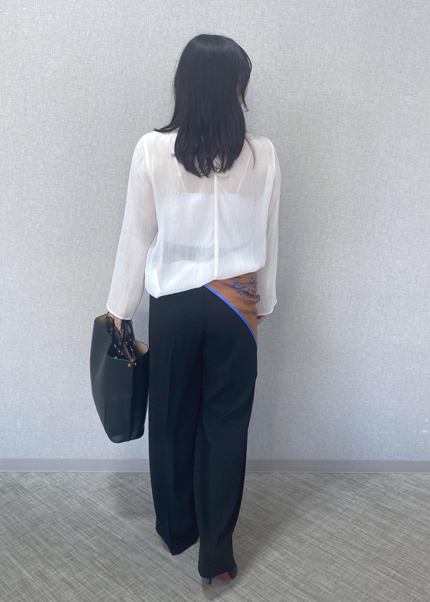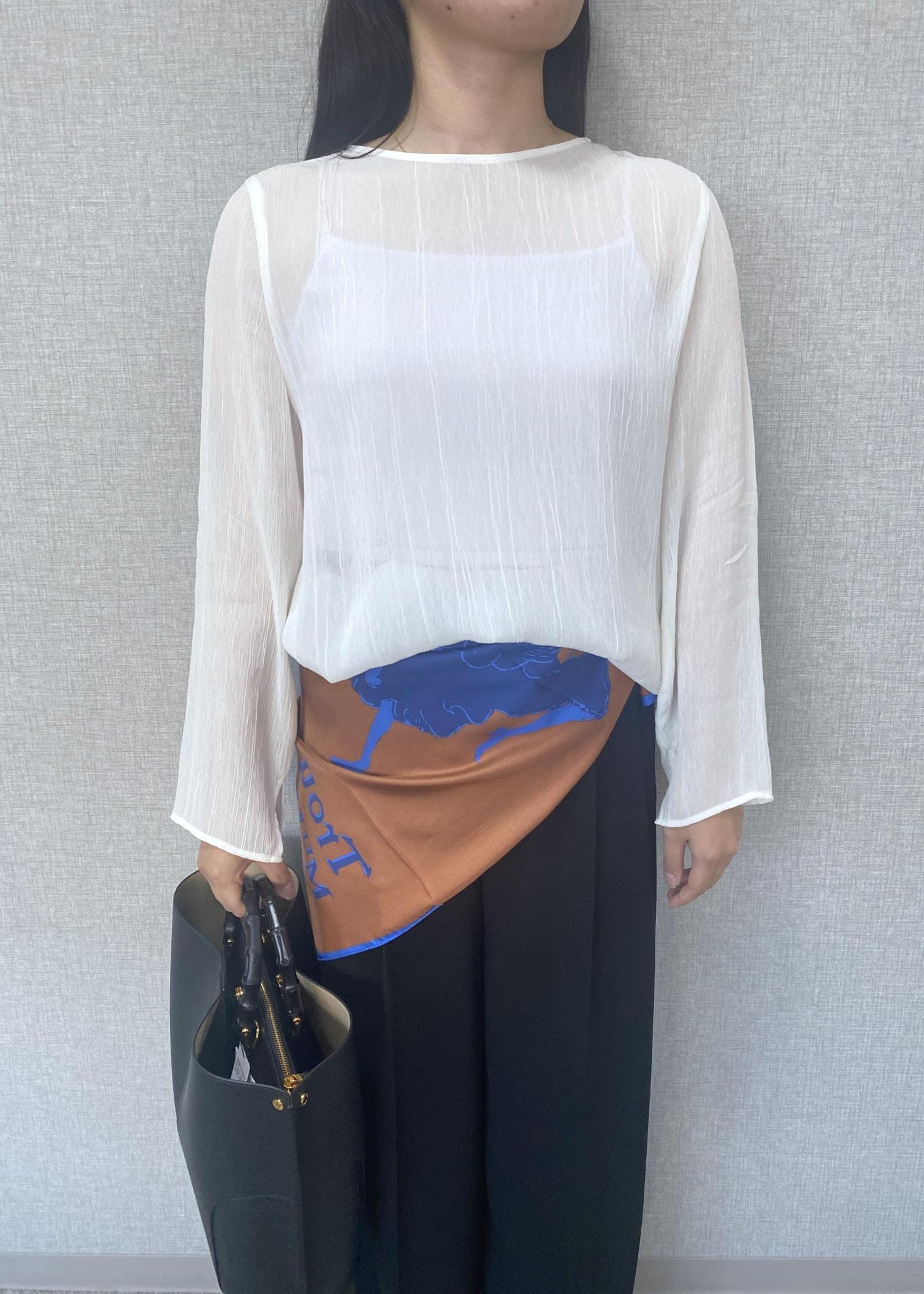 軽やかなシアーブラウスに、印象的なスカーフ柄を合わせた知的なスタイリング。