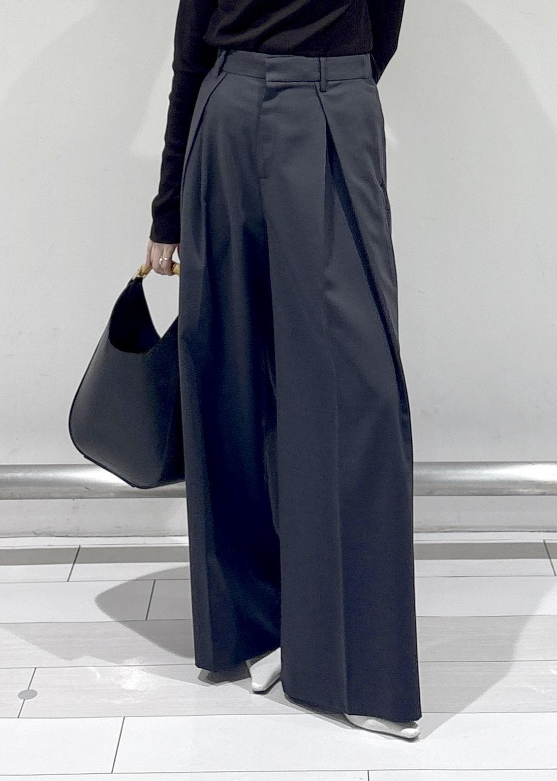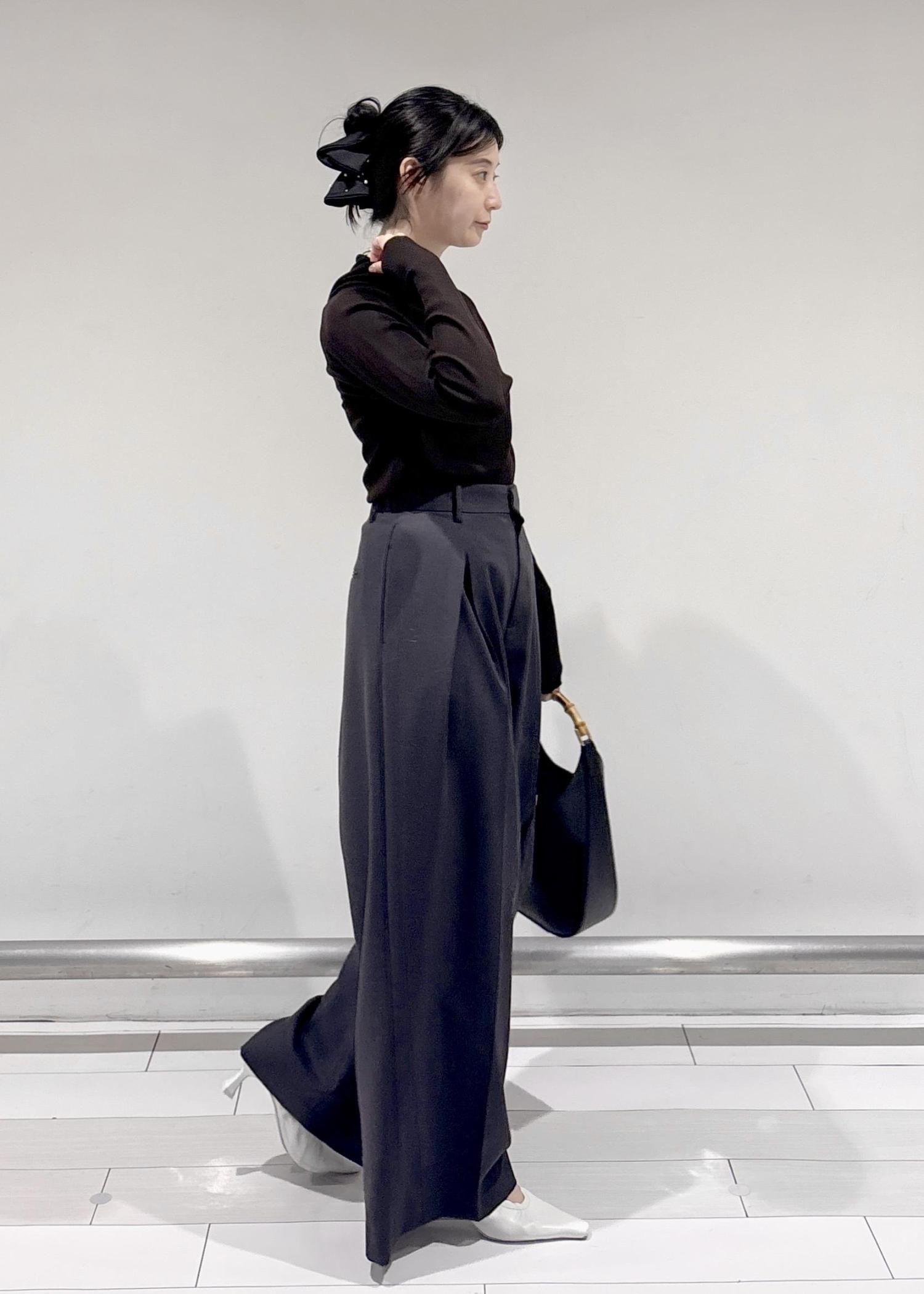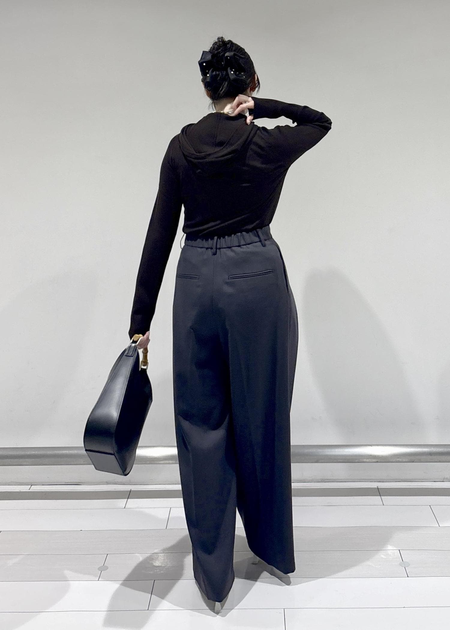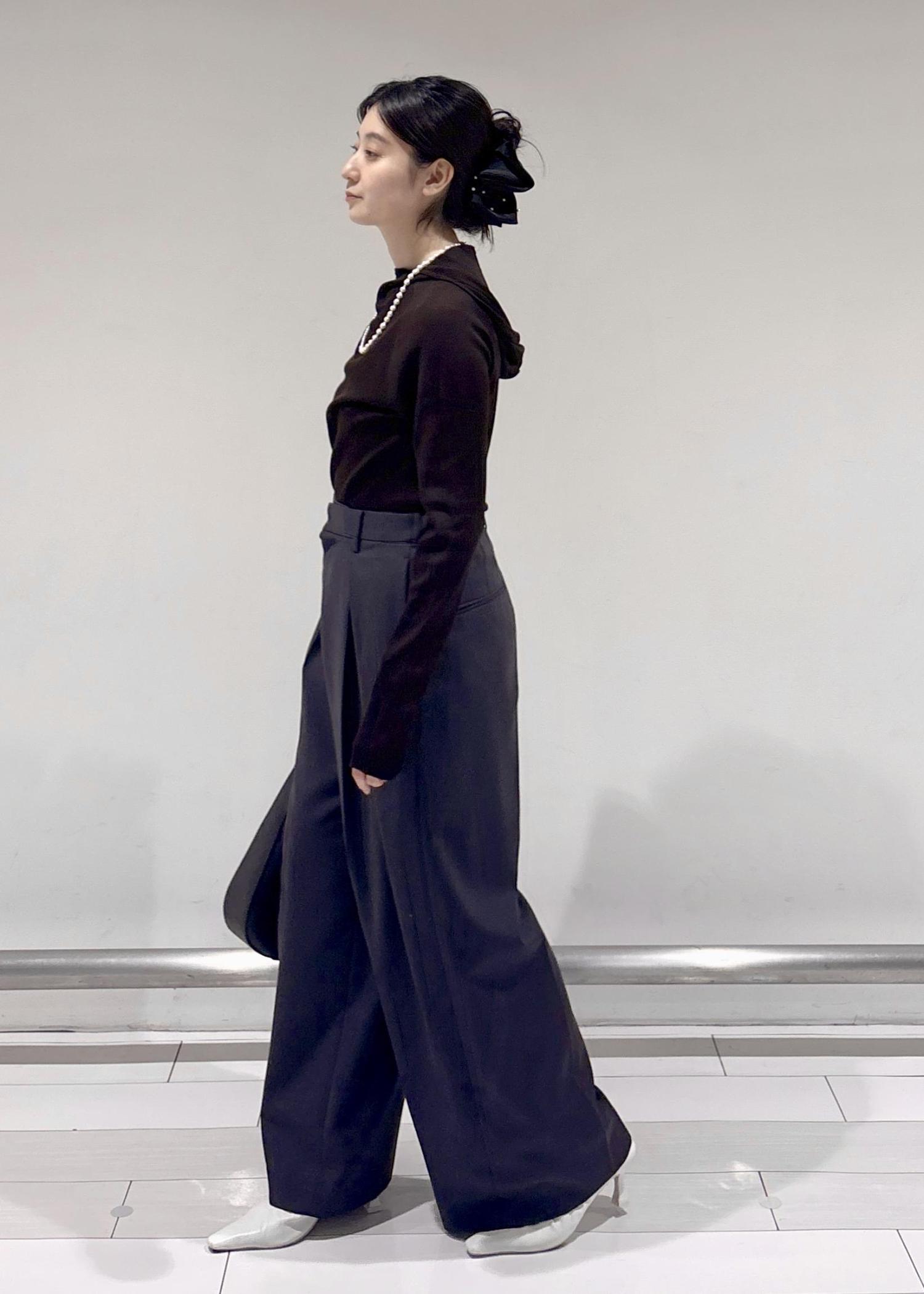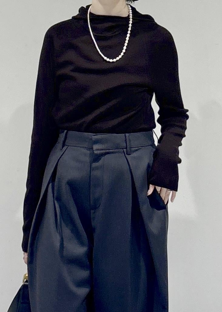 今年トレンドのフード付きニットとタックパンツでシンプルモードコーデ。