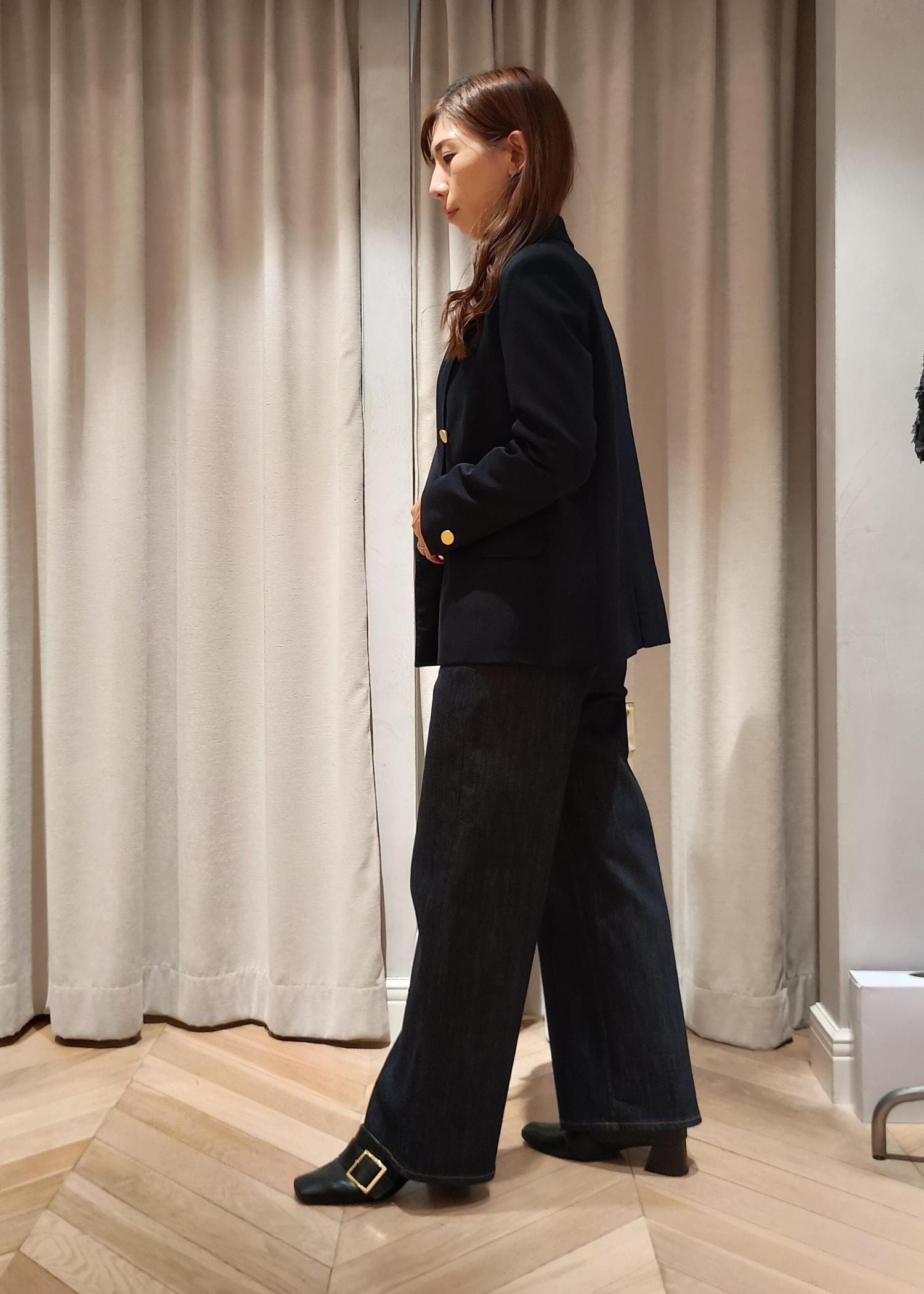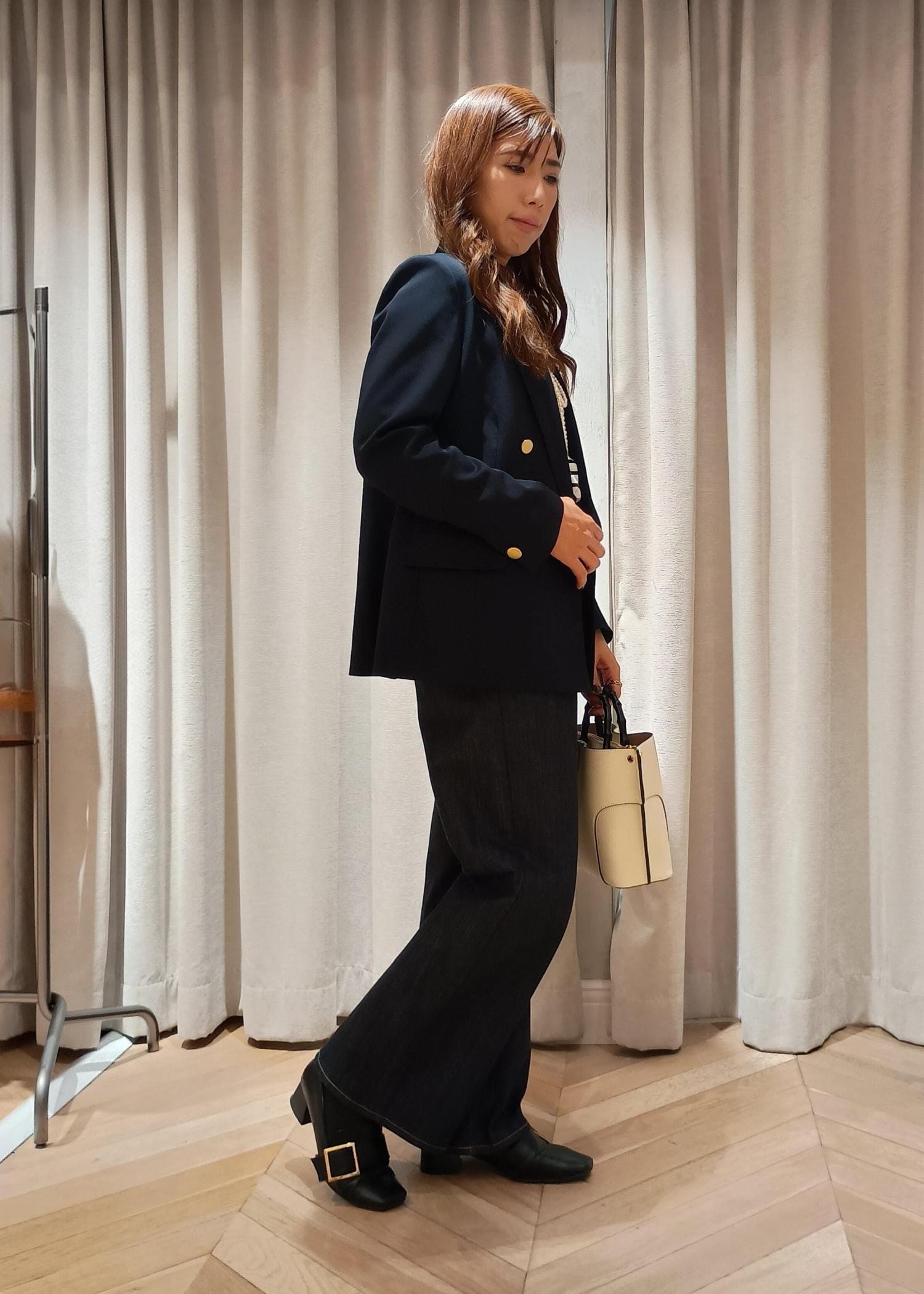 ROPÉストレッチ金ボタンブレザージャケットネイビー / 38¥52,800レビューお仕立てが美しく上品なシルエット。身幅がややゆったりめで、中にニットなど厚みのあるものでもレイヤードできます。デニムやプリーツスカートと合わせたトレンド感のある着こなしはもちろん、お仕事のシーン等きちんと感が求められる場面でも使えて着回しの幅広く楽しめます!