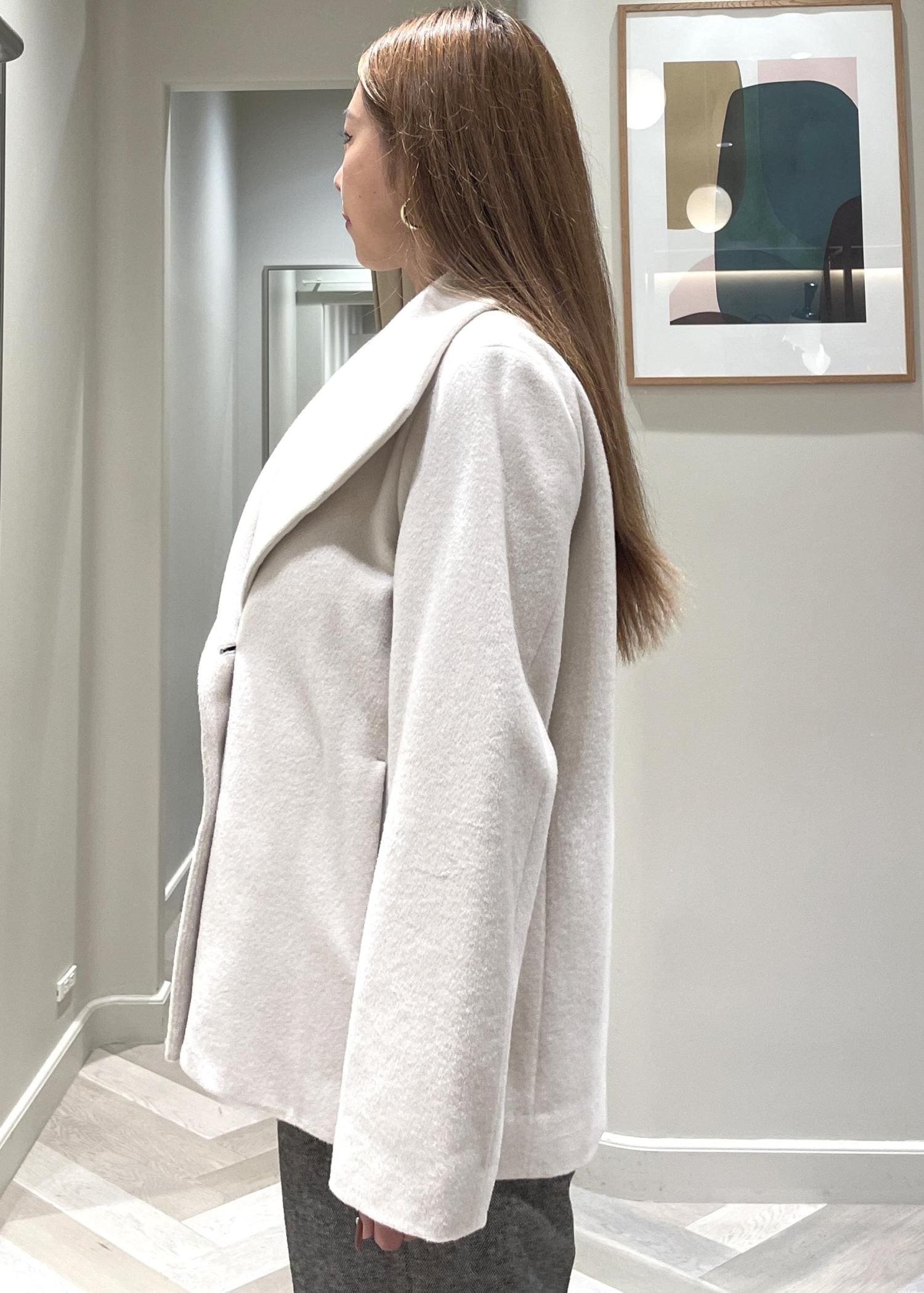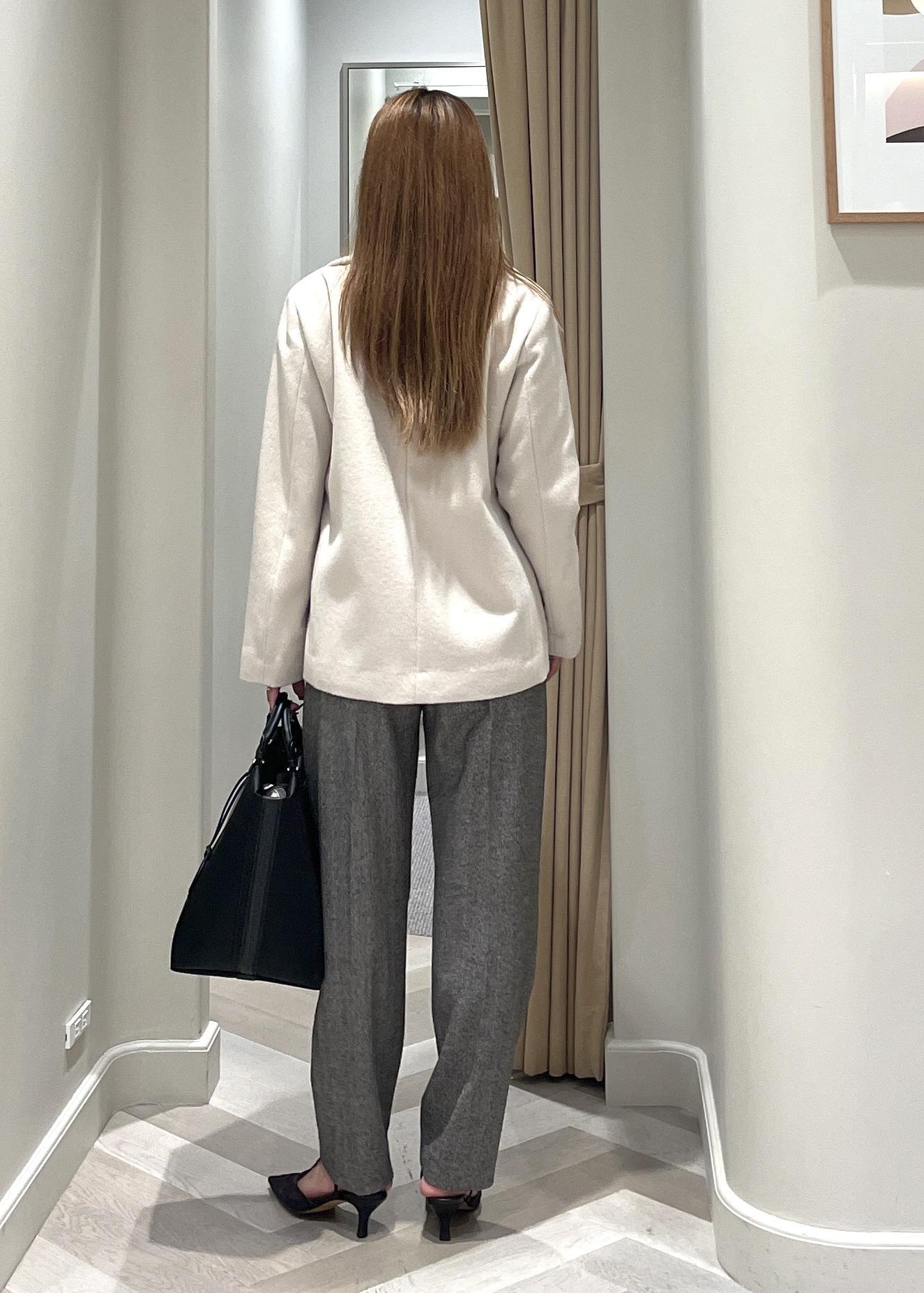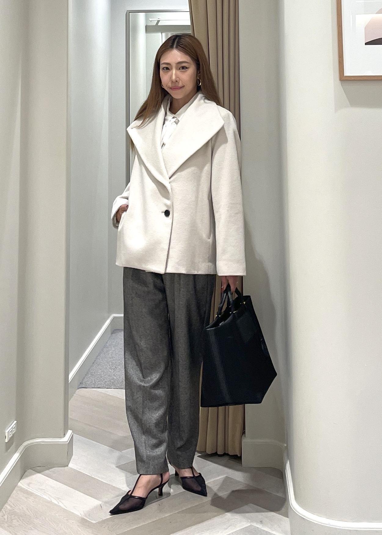 NEW!ROPÉプレミアムカシミヤ ショートコート【25AW】オフホワイト / 38¥53,900レビュー着丈は160cmが着用で、お尻がぎりぎり隠れる長さ。