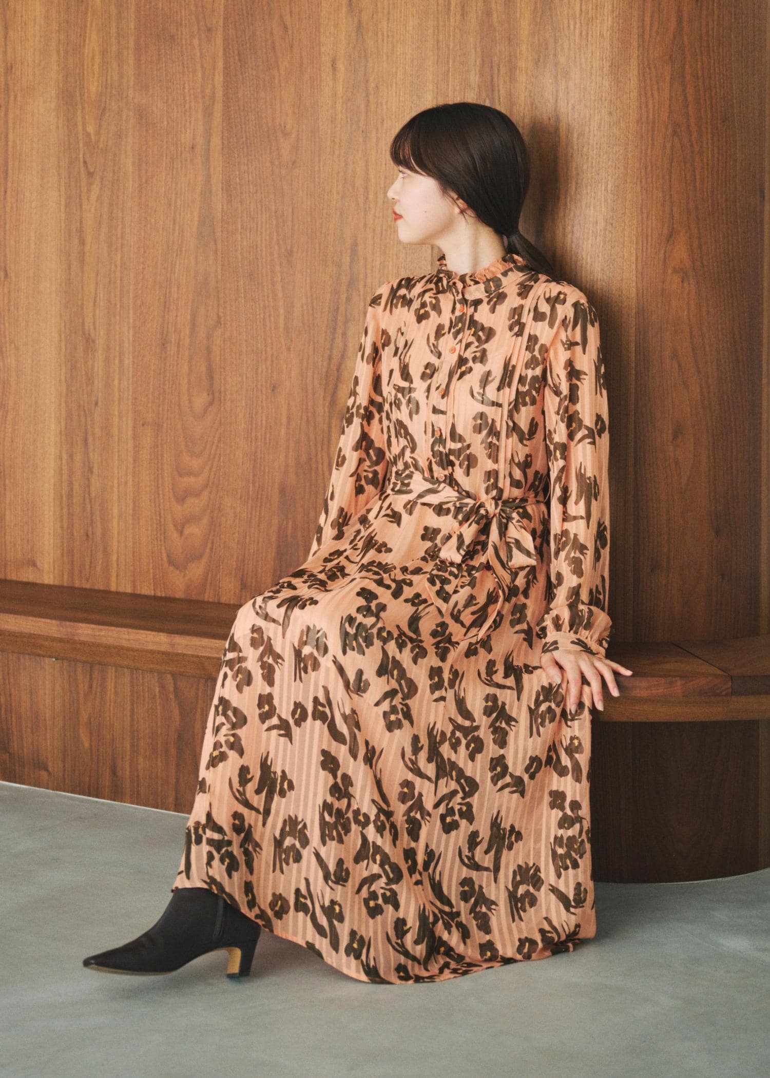 ROPÉフラワープリントタックワンピース/イージーケアオレンジ系 / F¥47,300レビューストライプ状の透け感やラメが入った