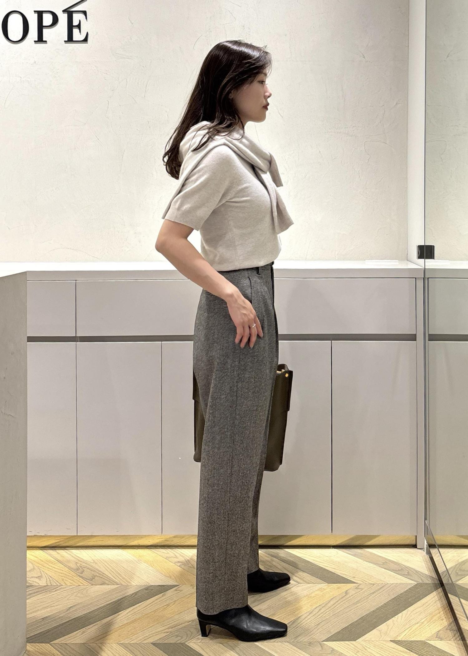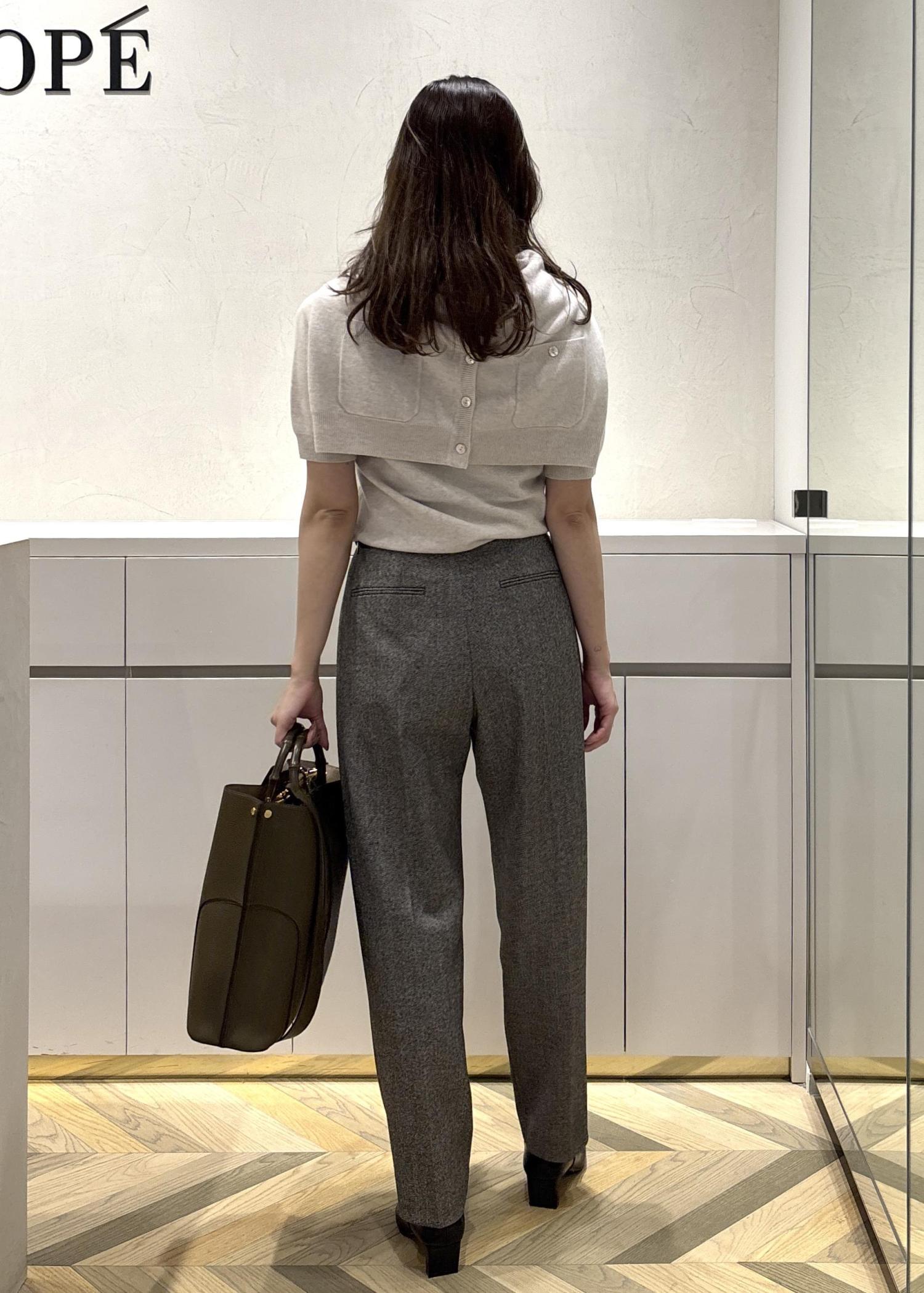 ウエストはゴム無しですっきりと、内向きの2タックで少し立体感があり裾にかけて細くなるラインが綺麗です。