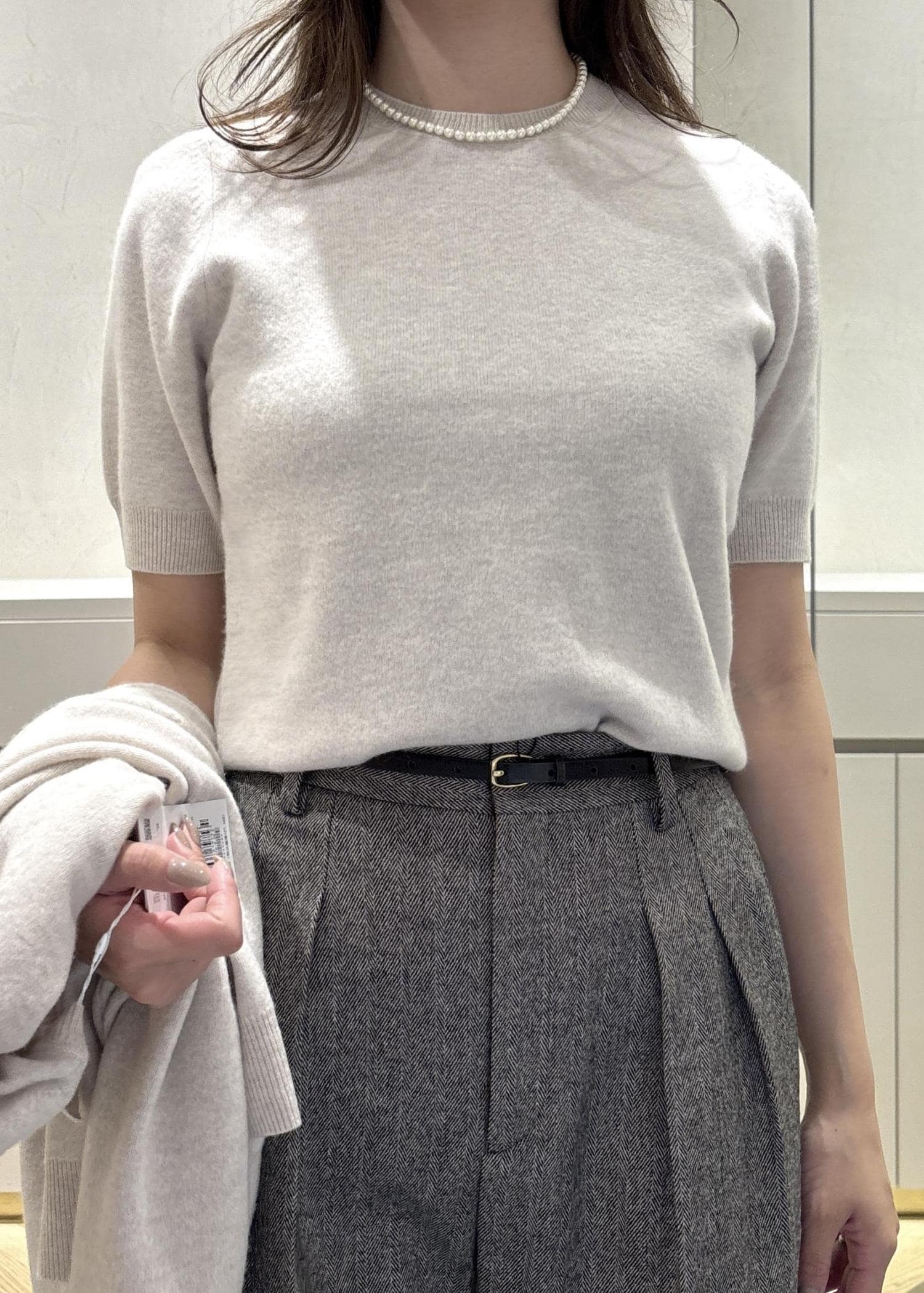 ROPÉウールカシミヤブレンド 5分袖ニットプルオーバー/イージーケアベージュ系 / F¥19,800レビューウール×カシミヤの柔らかさと軽さが魅力。素肌に着用してもチクチク感は無く、保温性が高いので暖かく感じました。全体のサイズ感はややコンパクト、同素材のカーディガンと重ね着しやすく設定してあります。着丈は私の身長で腰骨あたり。手洗い可能です。