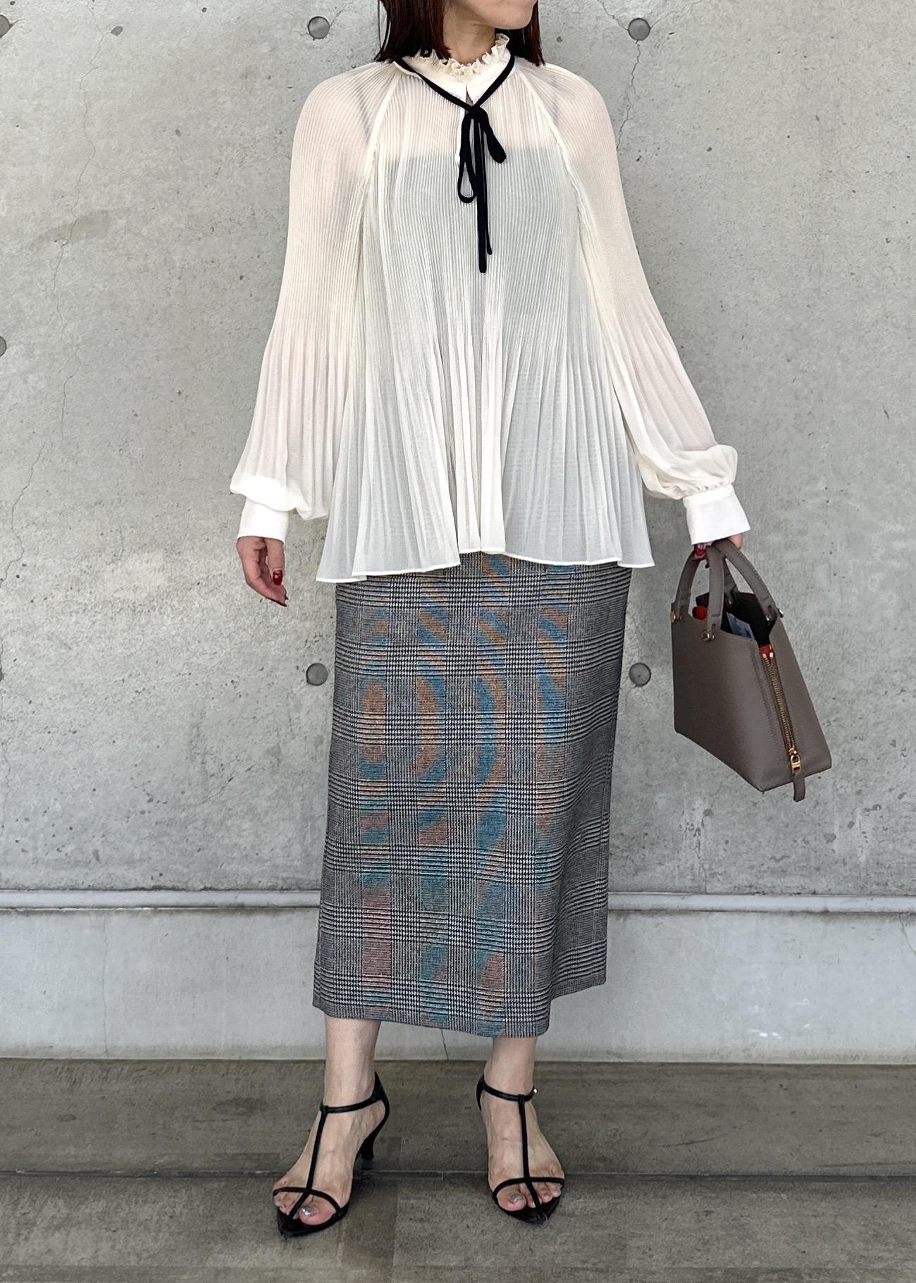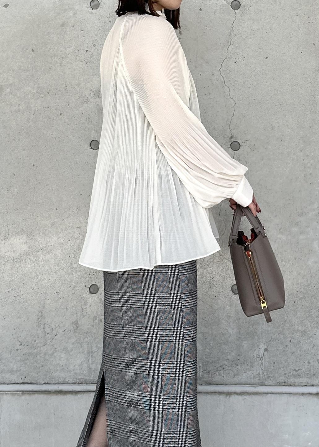 全体的な細かいプリーツは、ふんわりとした着心地ながら広がり過ぎずも体のラインを拾いません。