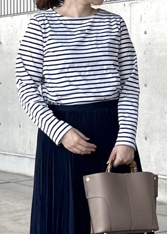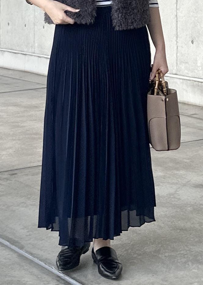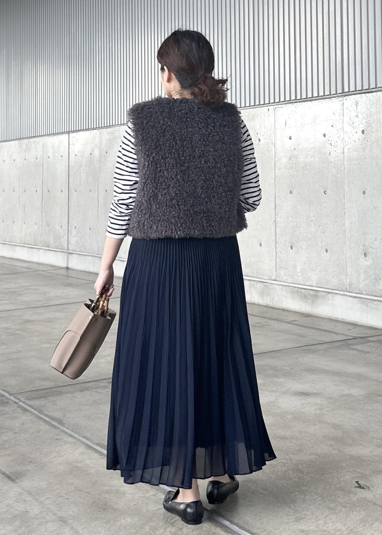 シンプルなプリーツスカートです。きれいめな見え方ですが、ウエスト後ろ部分がゴムになっているので快適な着心地です。