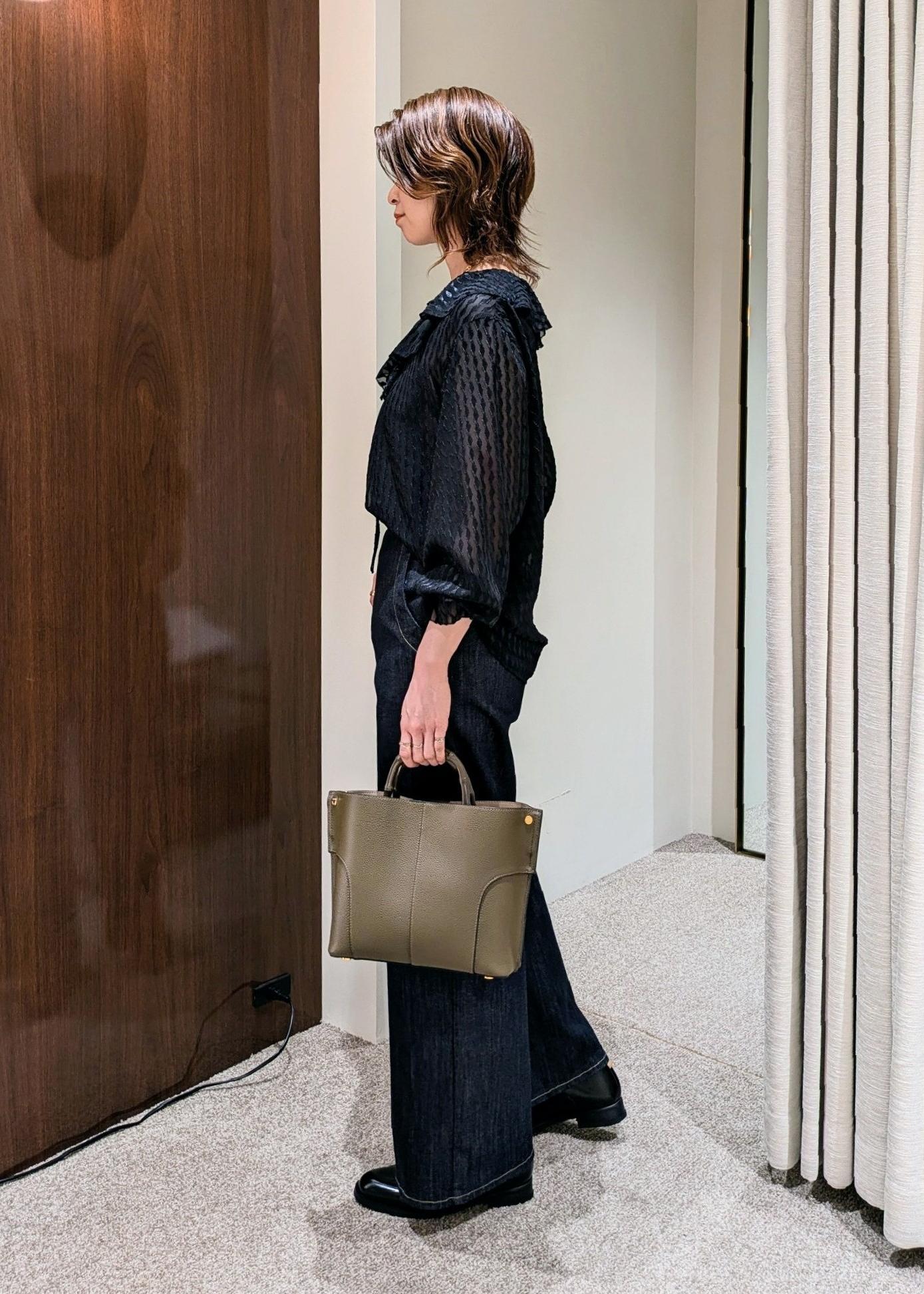 ブラウスは襟元のフリルが程よく、デイリーにはもちろん、ジャケットインでお仕事でもお勧めです。