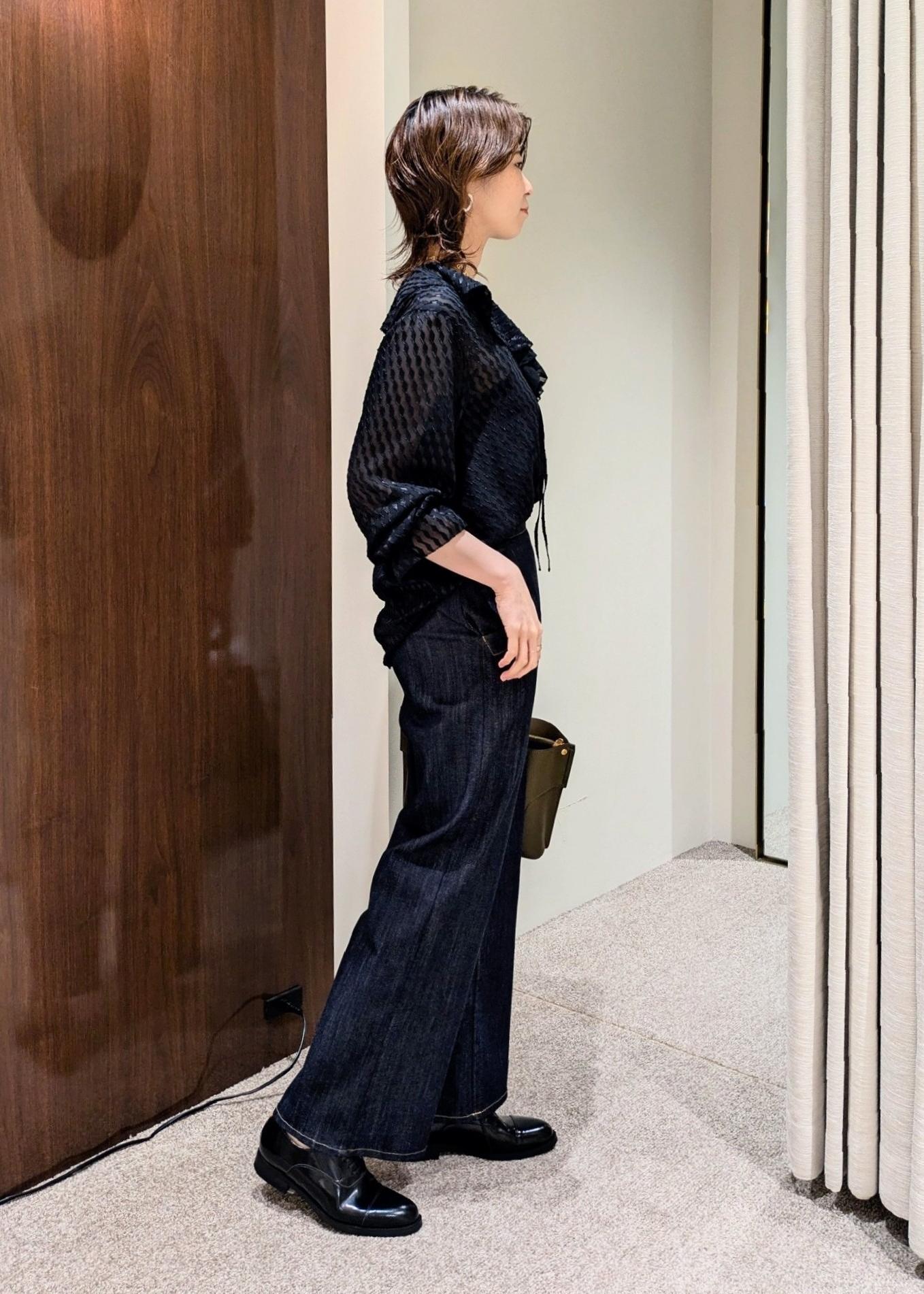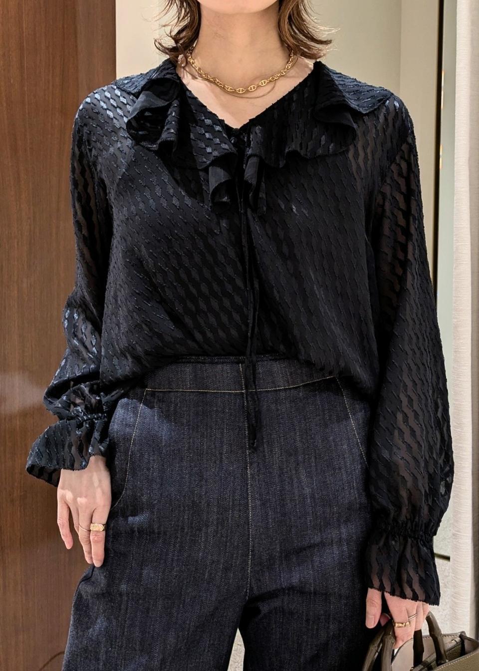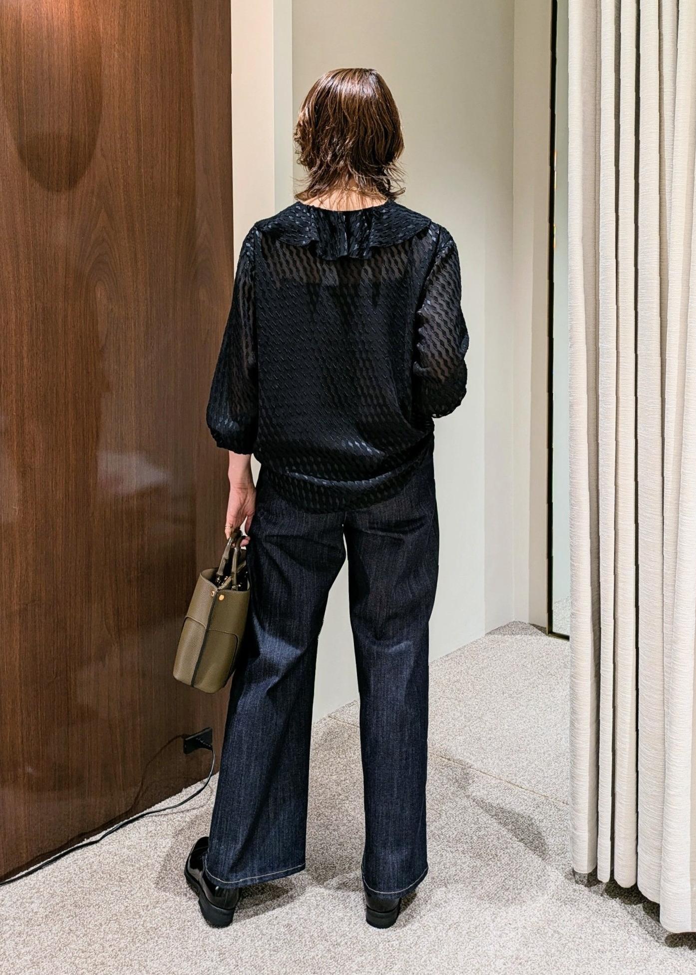 ラッフル襟ブラウスにデニムを合わせて、カジュアルフェミニンコーデでまとめました。