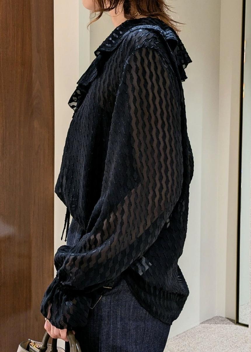 袖口のギャザーフリルもポイントで、一枚で着用する際には袖をたくし上げると華奢な印象になりますし、ジャケットのインナーにすると袖口のフリルがコーデのアクセントになりますよ♪ -