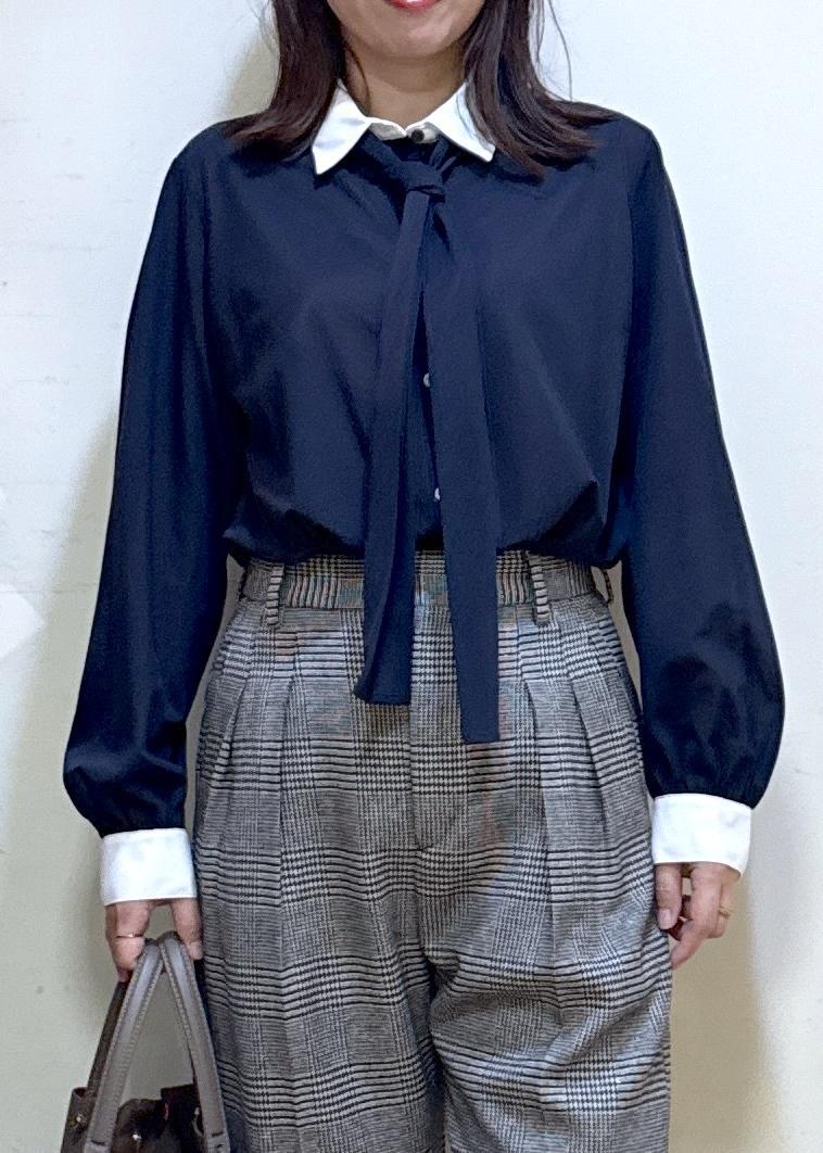 バイカラーがポイントのボウタイブラウスをお仕事コーデに♪