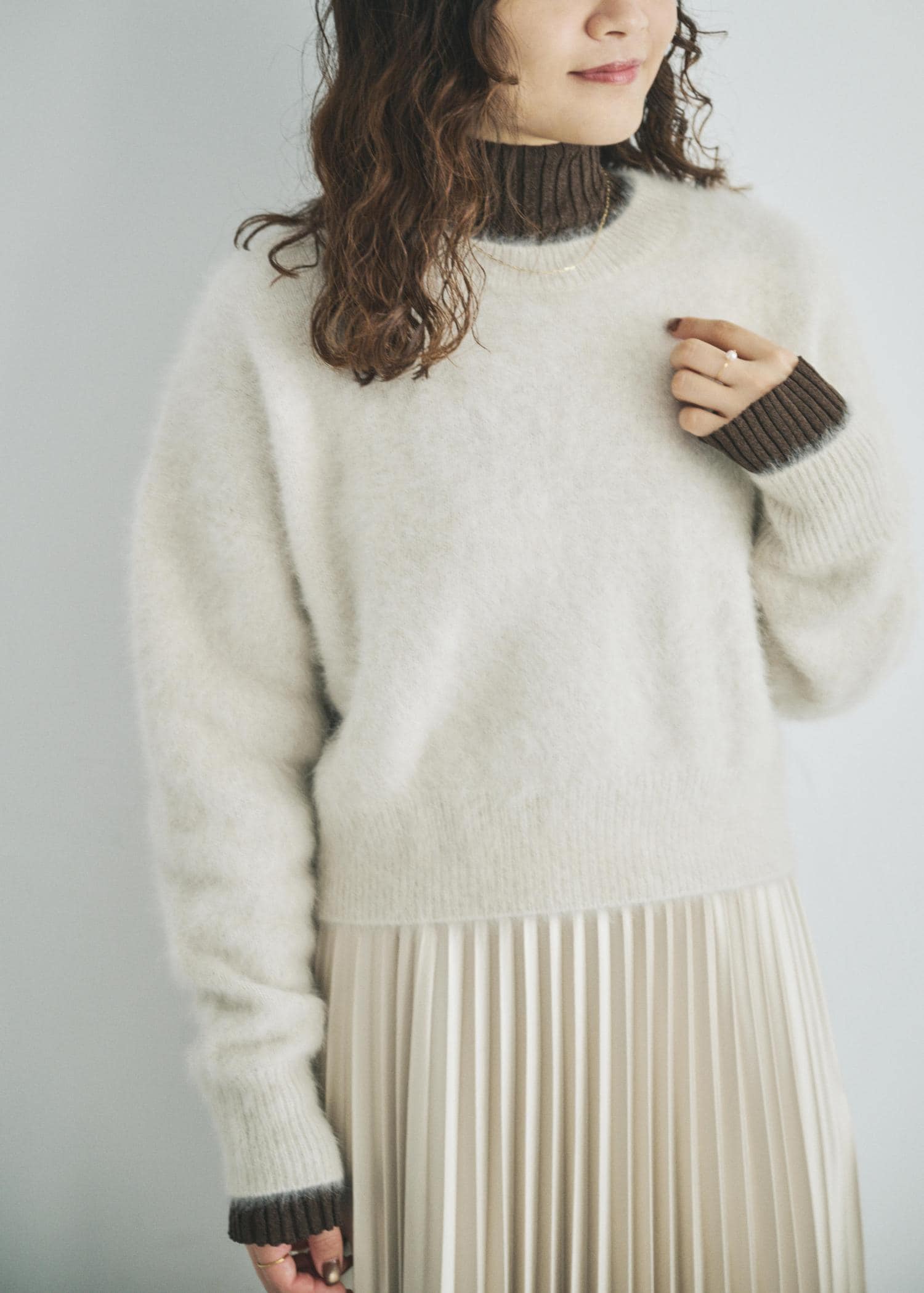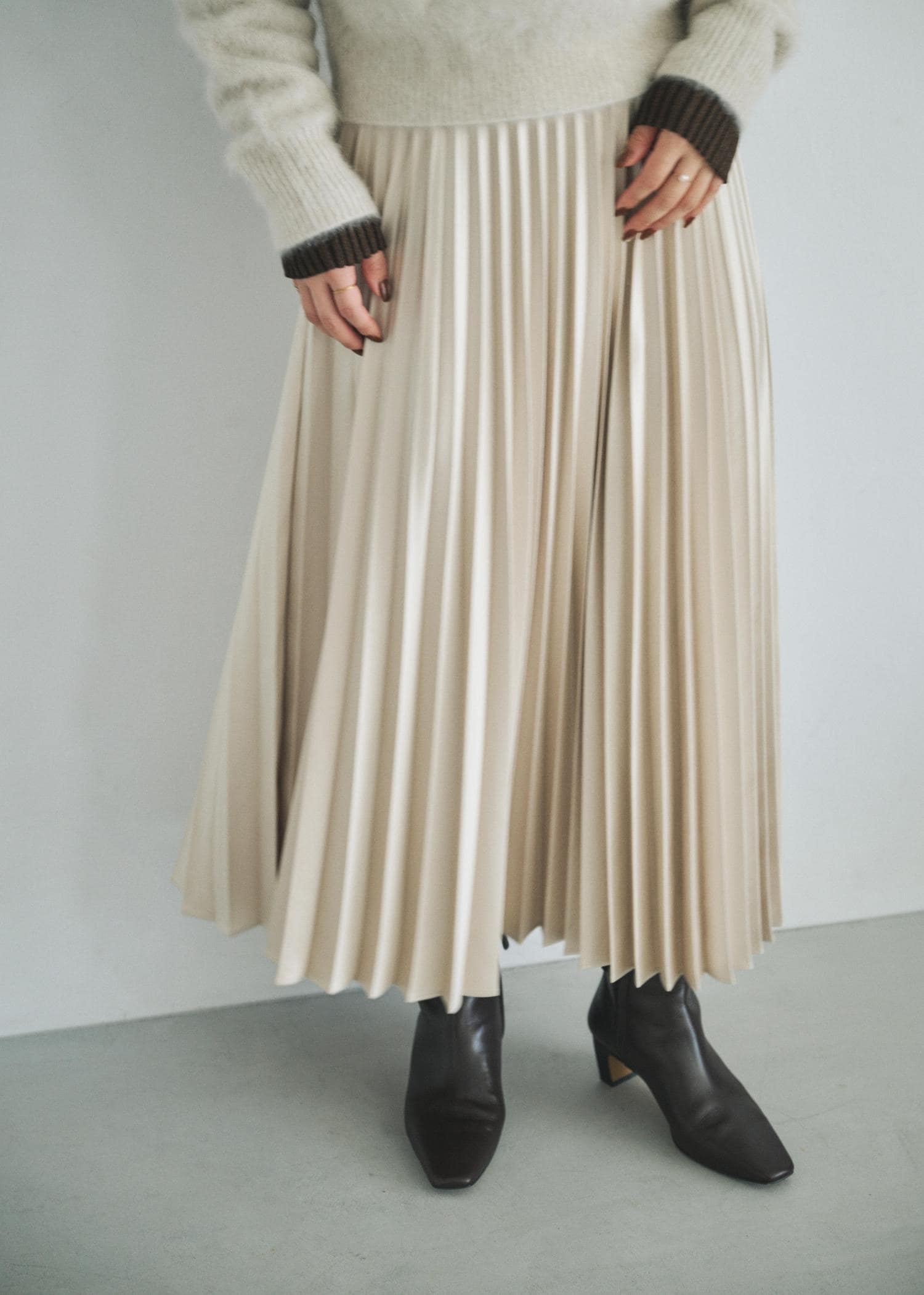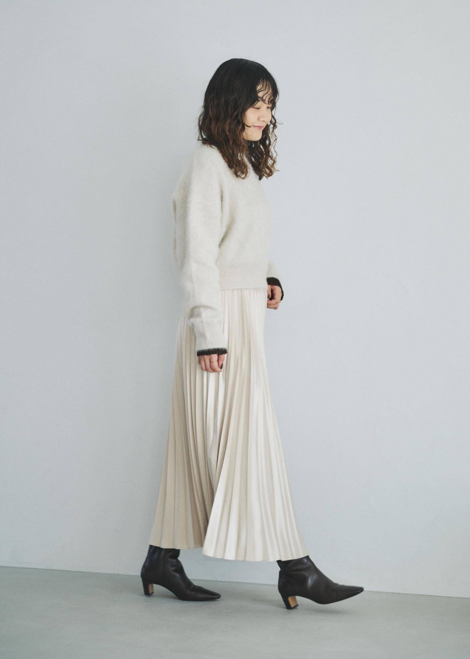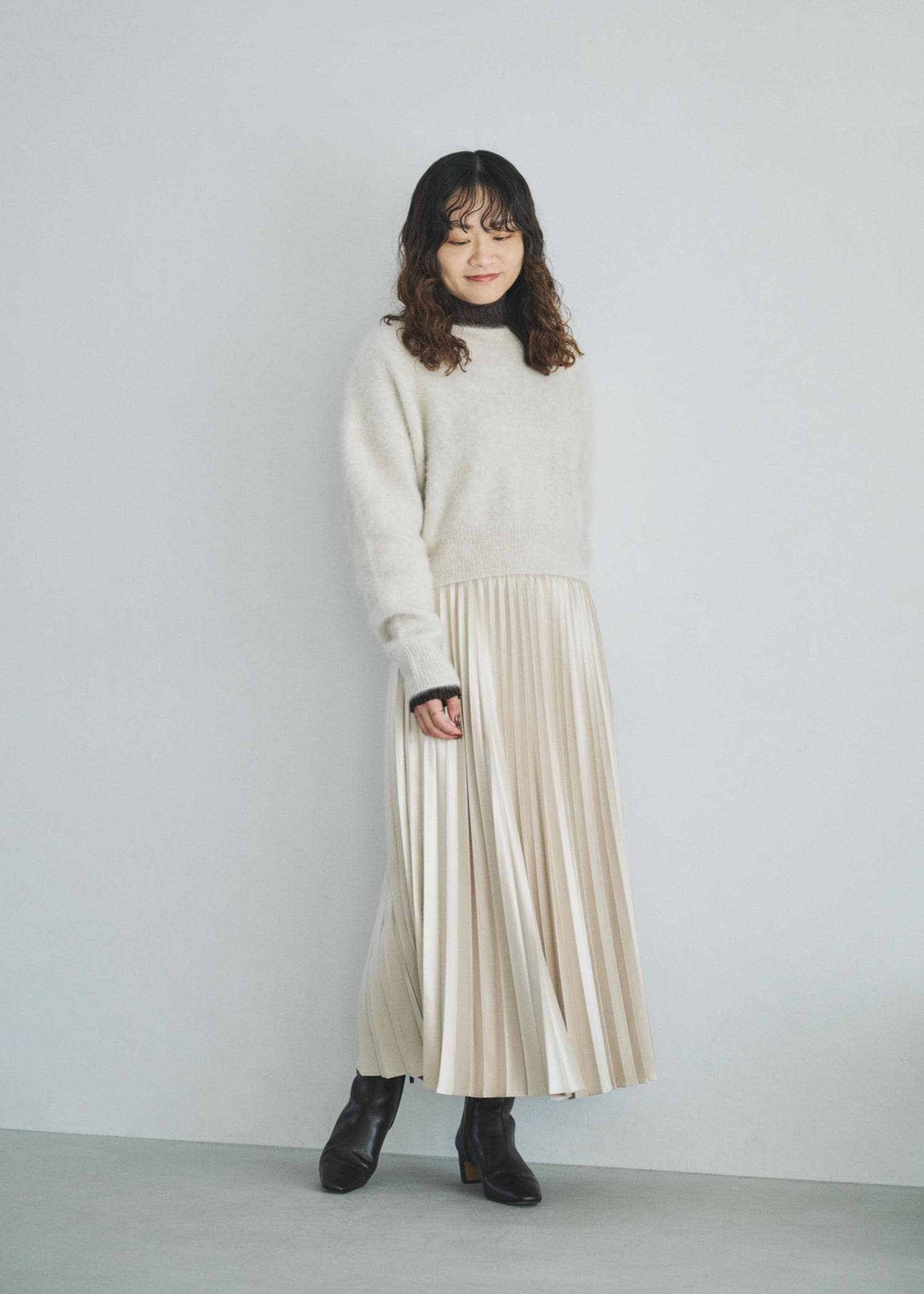 ふわふわのニットに光沢のあるプリーツスカートを合わせた