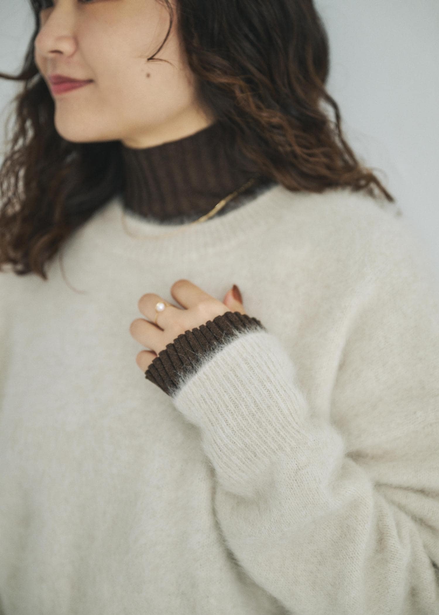 伸び感のあるリブデザインで、程よくフィットします。袖丈は手の甲が隠れる長めで、タートルも少し高さがありました。