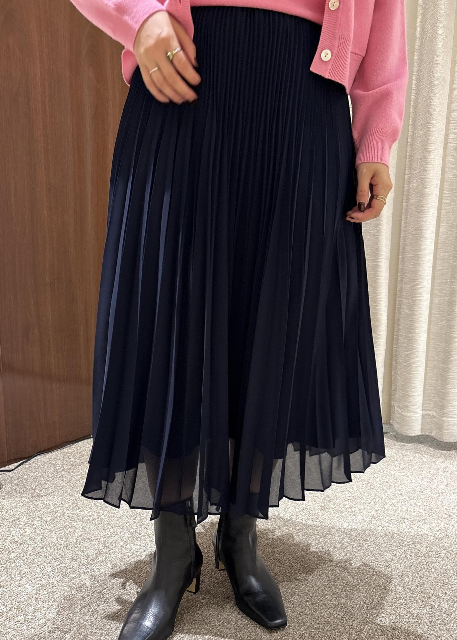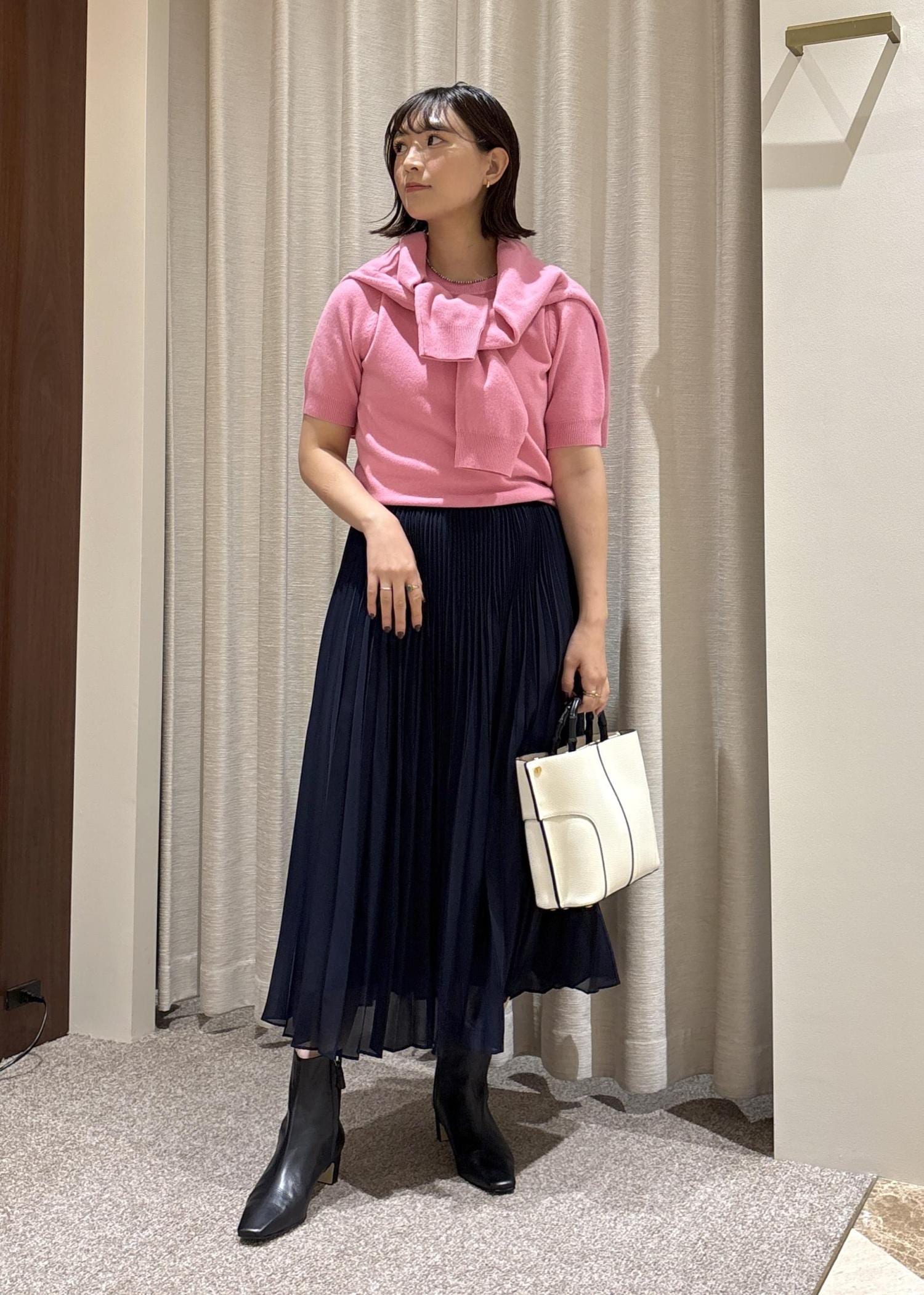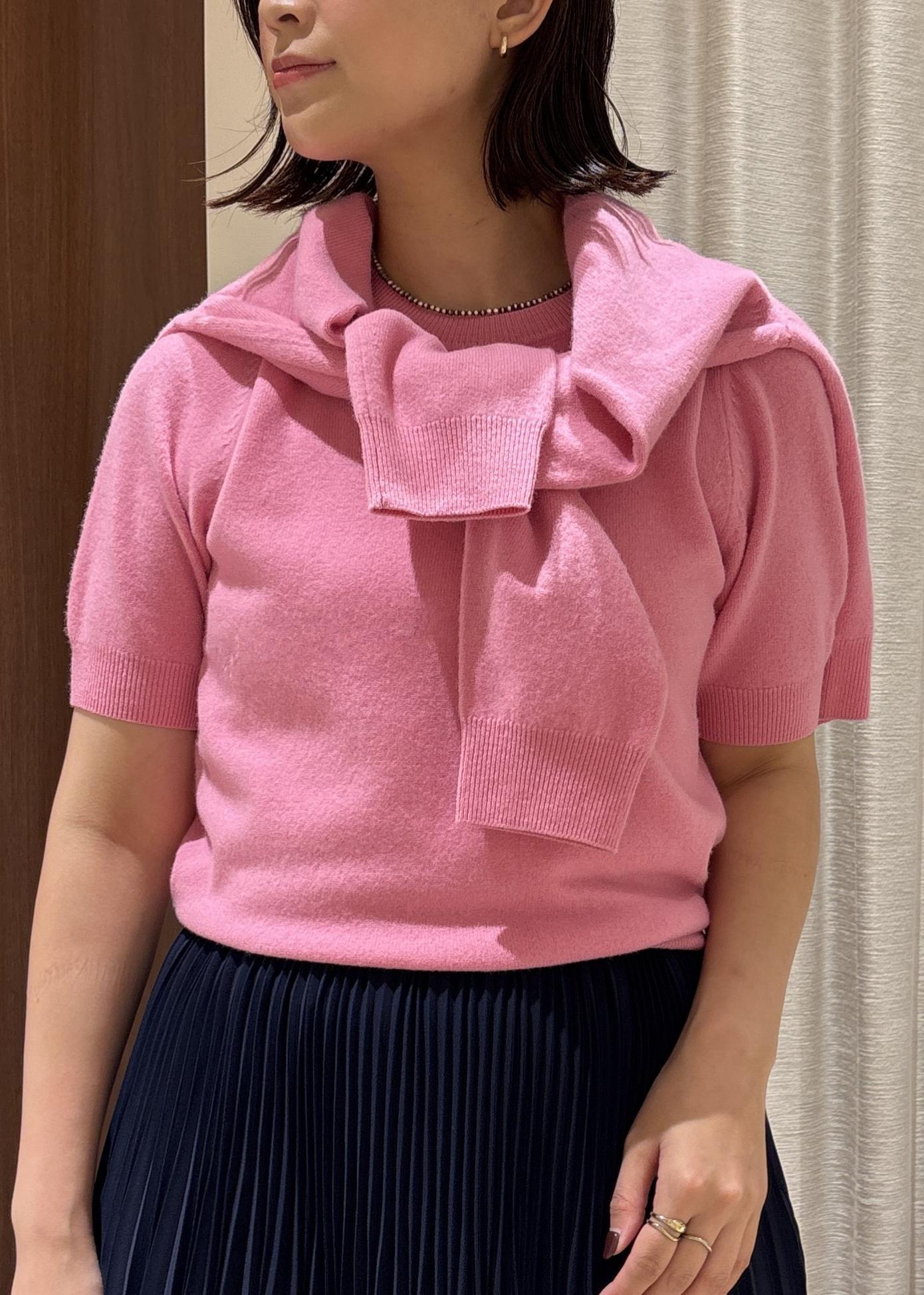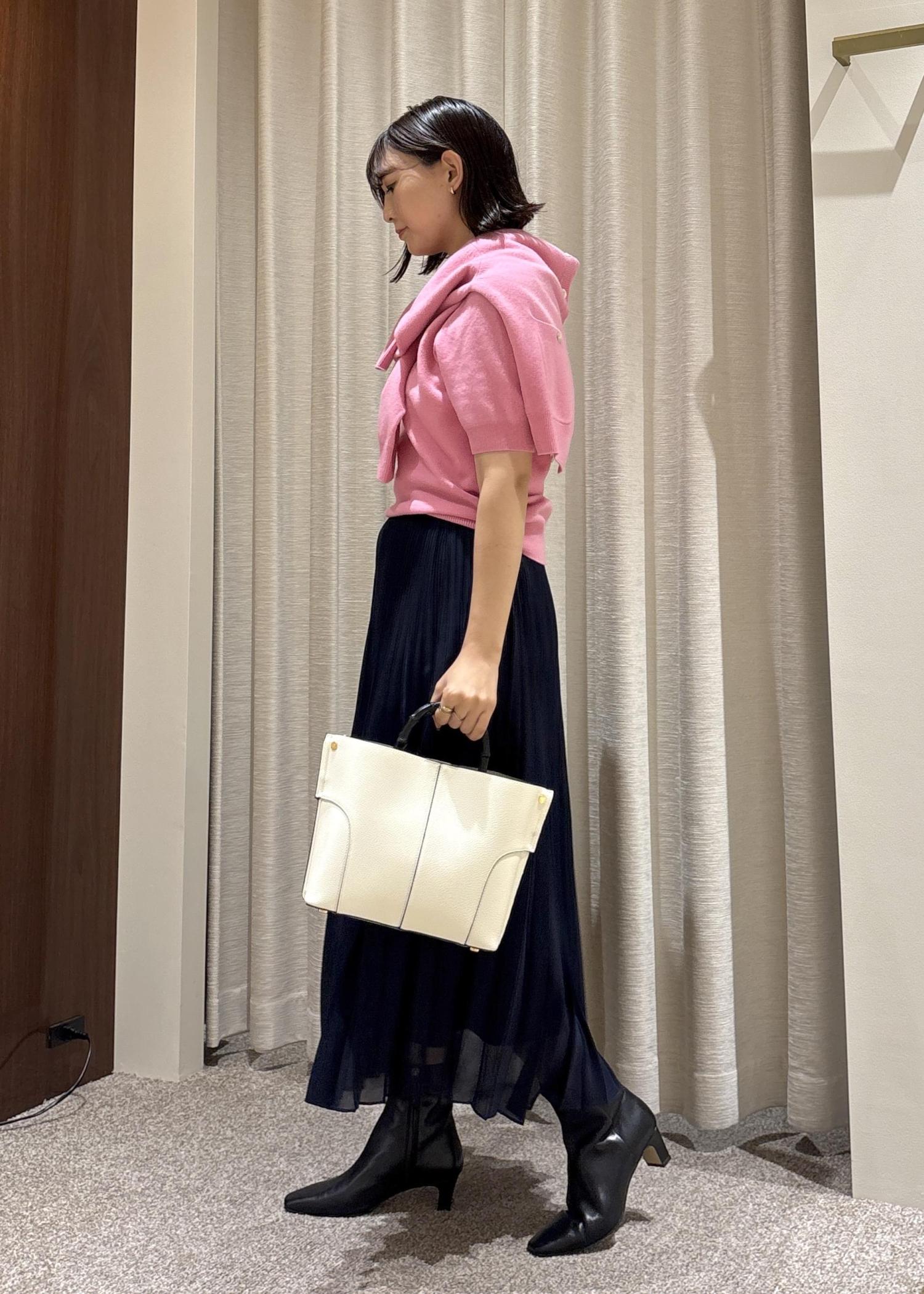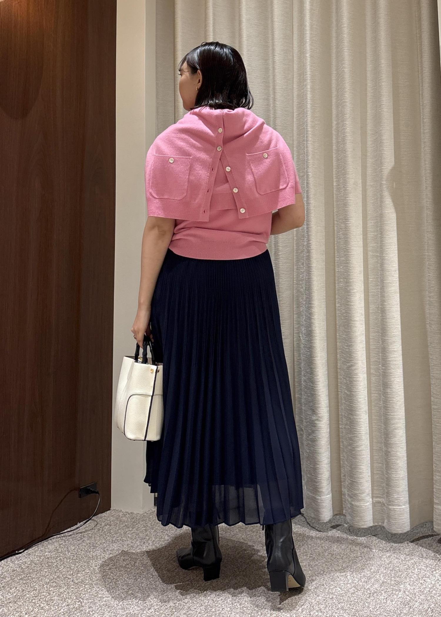 鮮やかなピンクのアンサンブルに、シックなネイビーカラーのプリーツスカートを合わせてみました♡