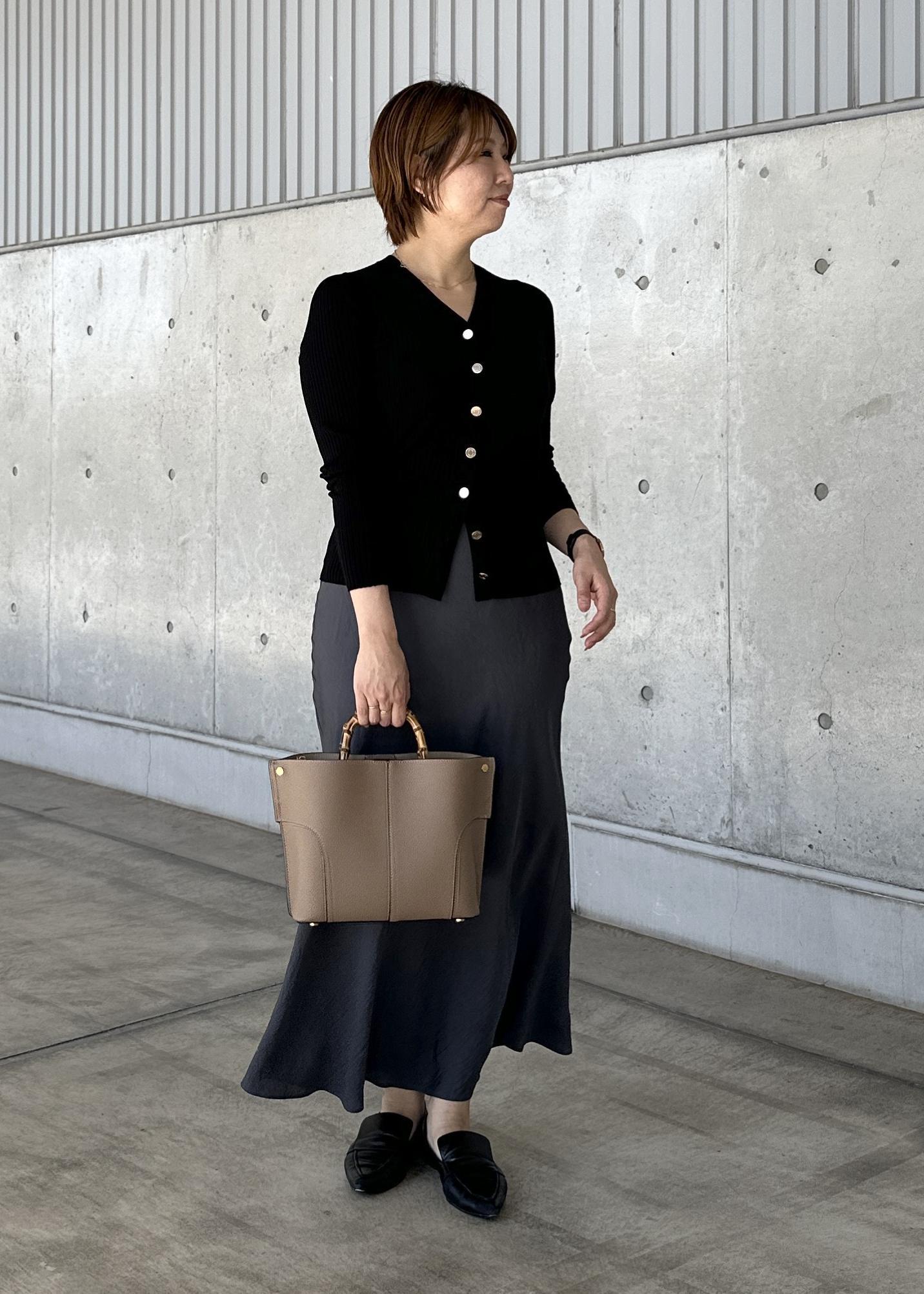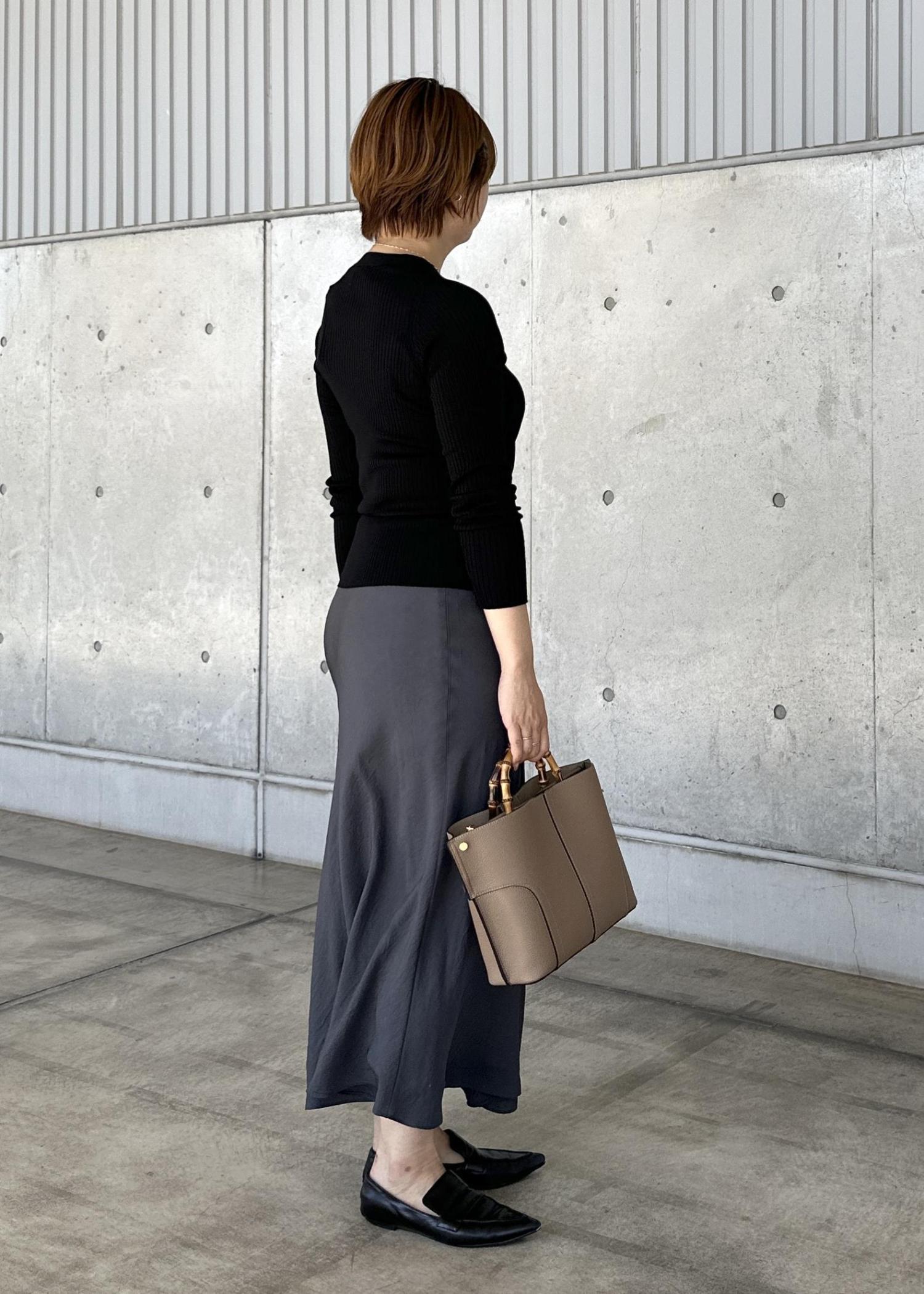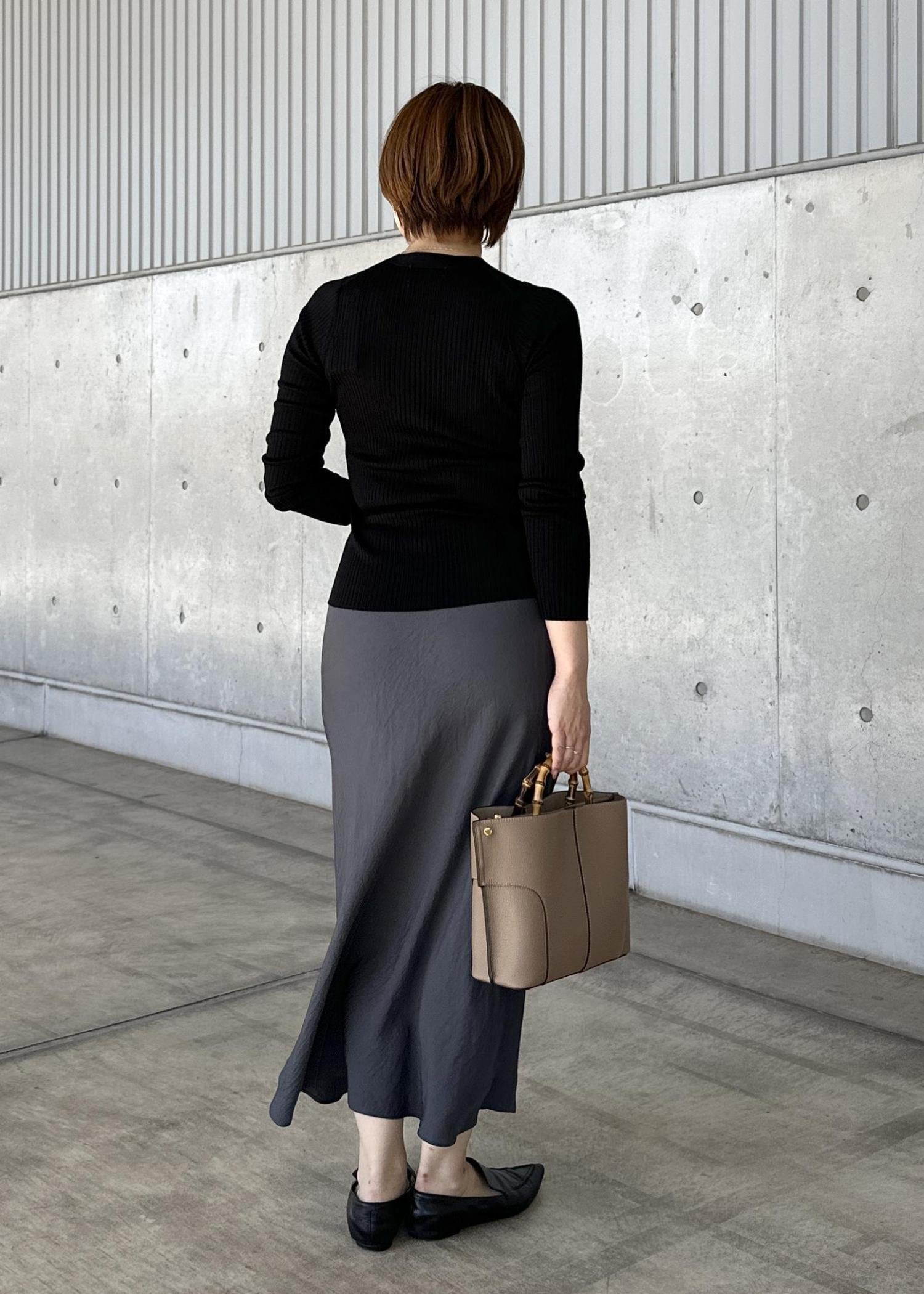 全体的に伸縮性があり、リブのデザインでも身体のラインを拾いすぎないのでおすすめです。