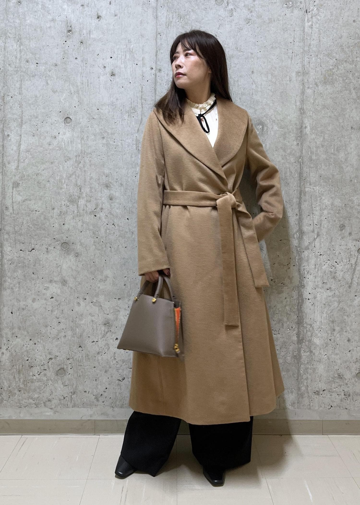 大きめのショールカラーのコートで小顔効果があり、スタイル良く見えるコーディネートです。
