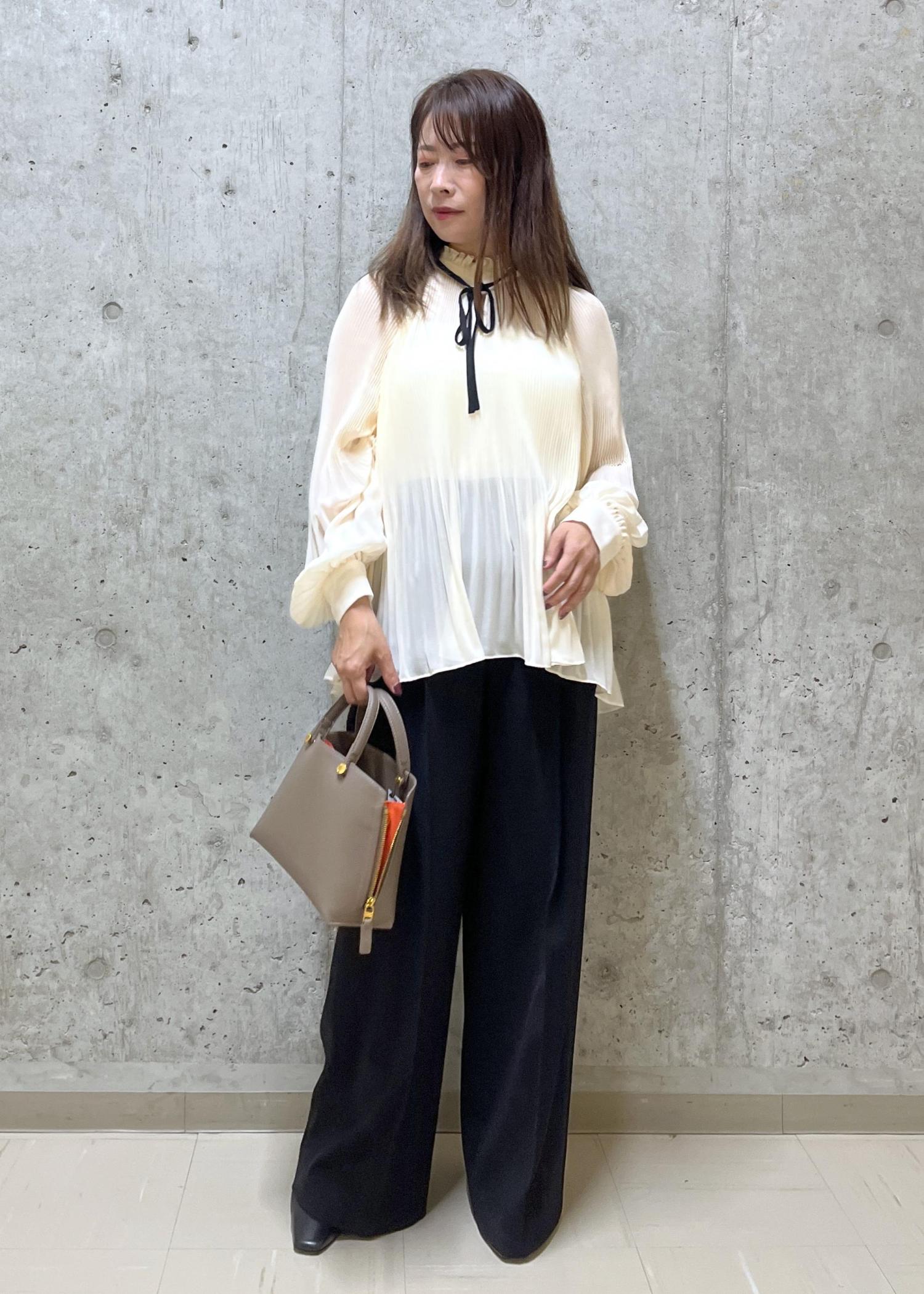 シンプルな色の組み合わせですが、インナーに着たブラウスのリボンが可愛らしいさと華やかな雰囲気にしてくれます。