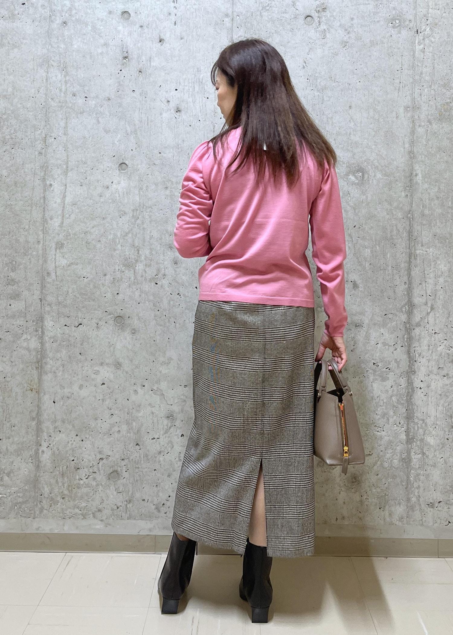 チェックとピンクで可愛らしい雰囲気ですが、タイトスカートで少し大人っぽい雰囲気も取り入れたスタイルです。