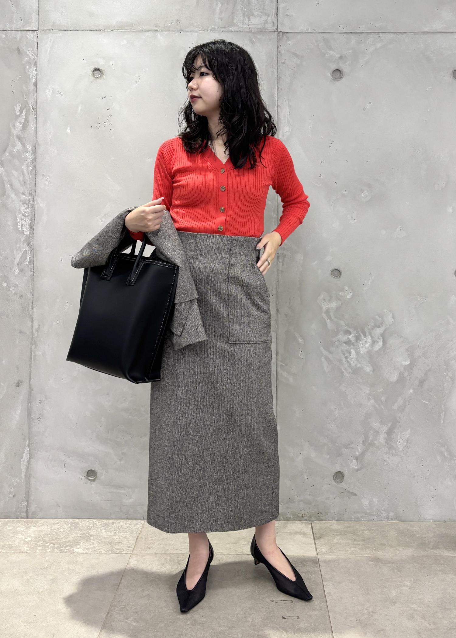 レッドカラーのニットをインナーに持ってくると、明るく華やかな秋コーデに。