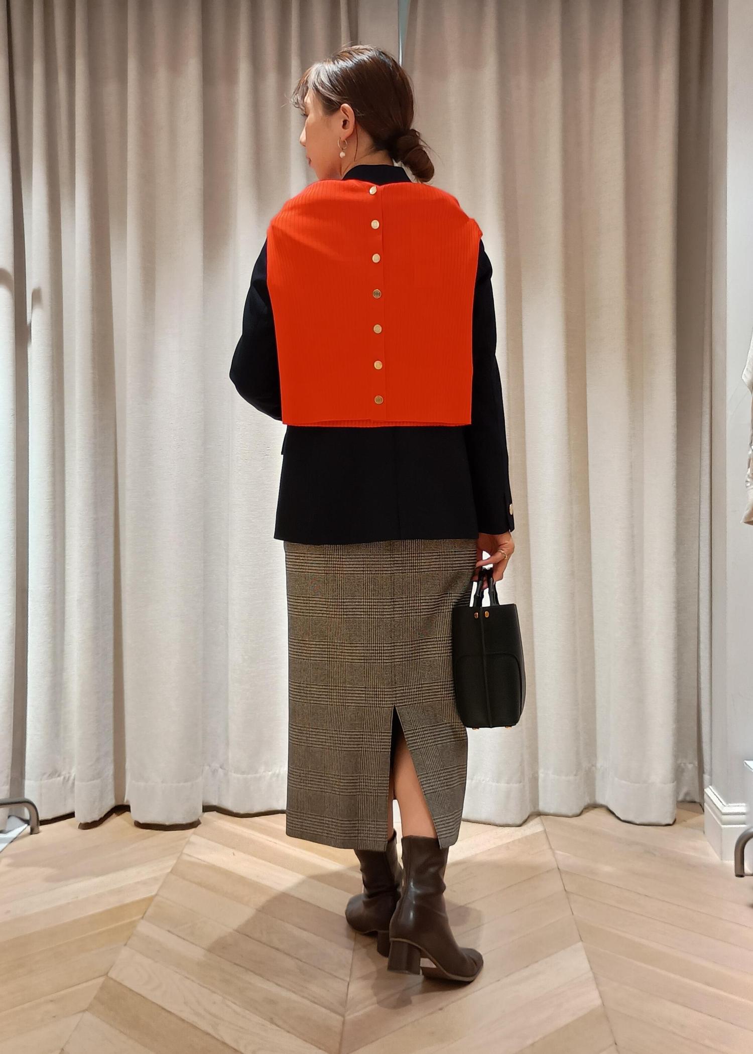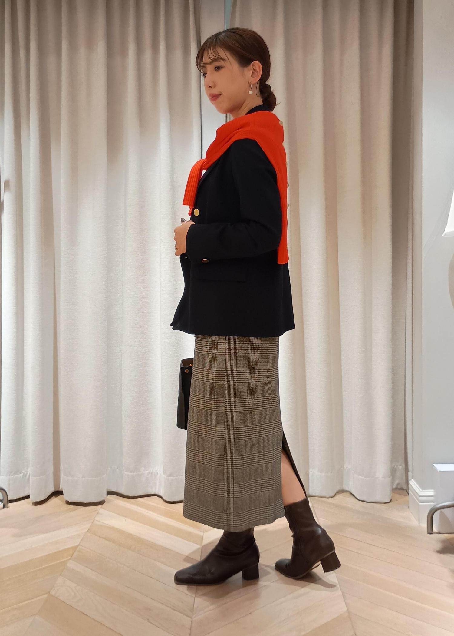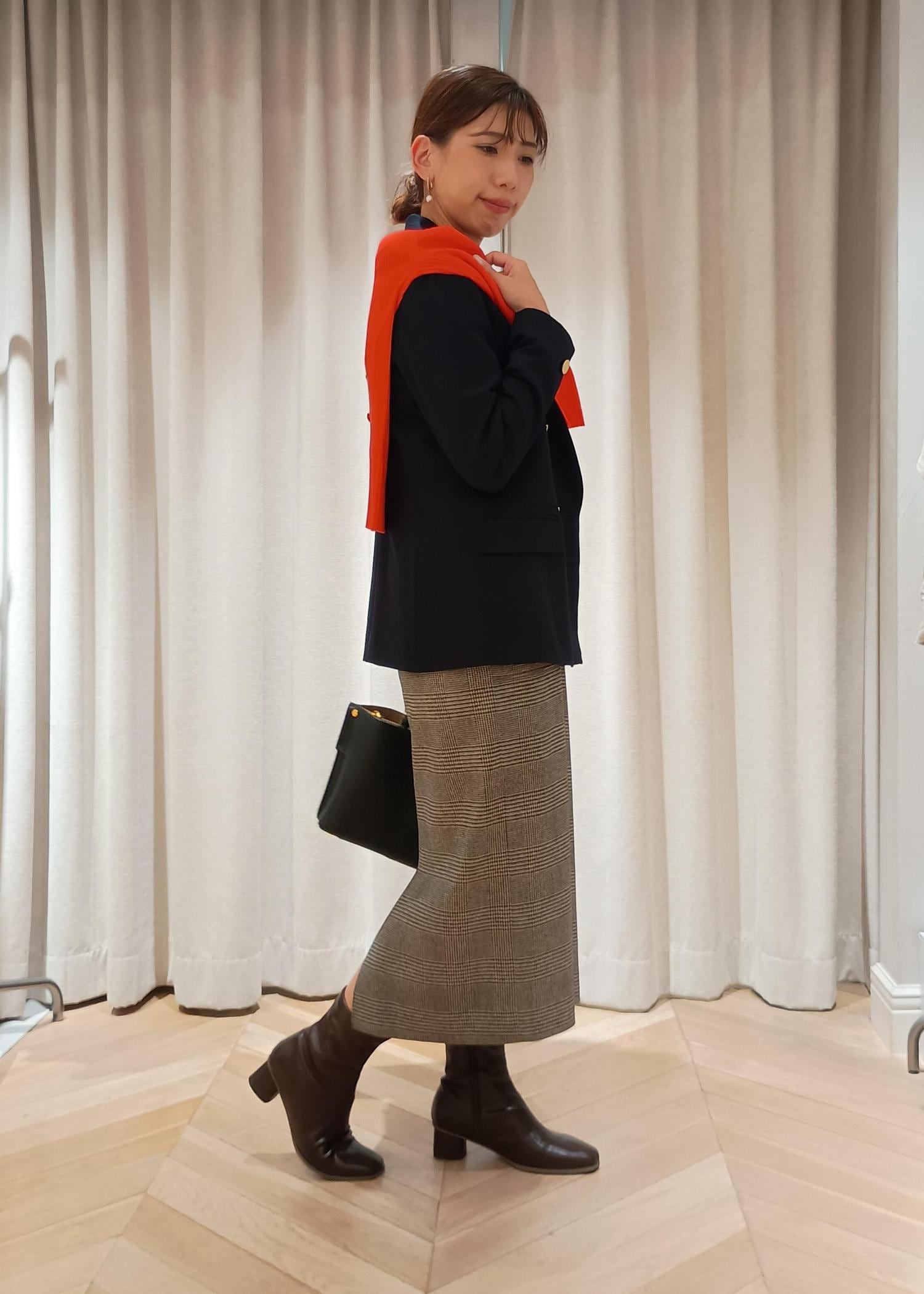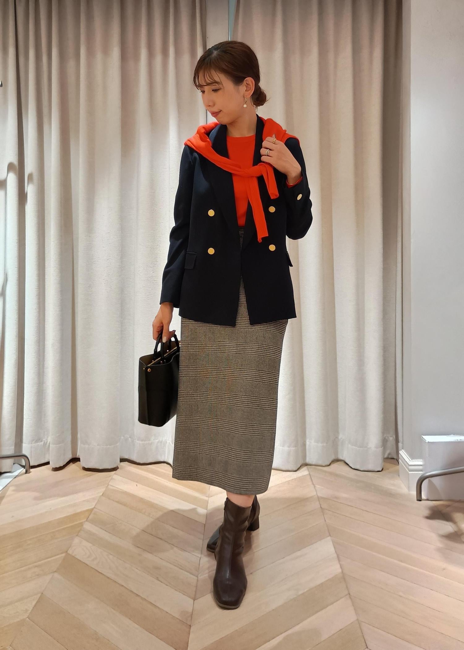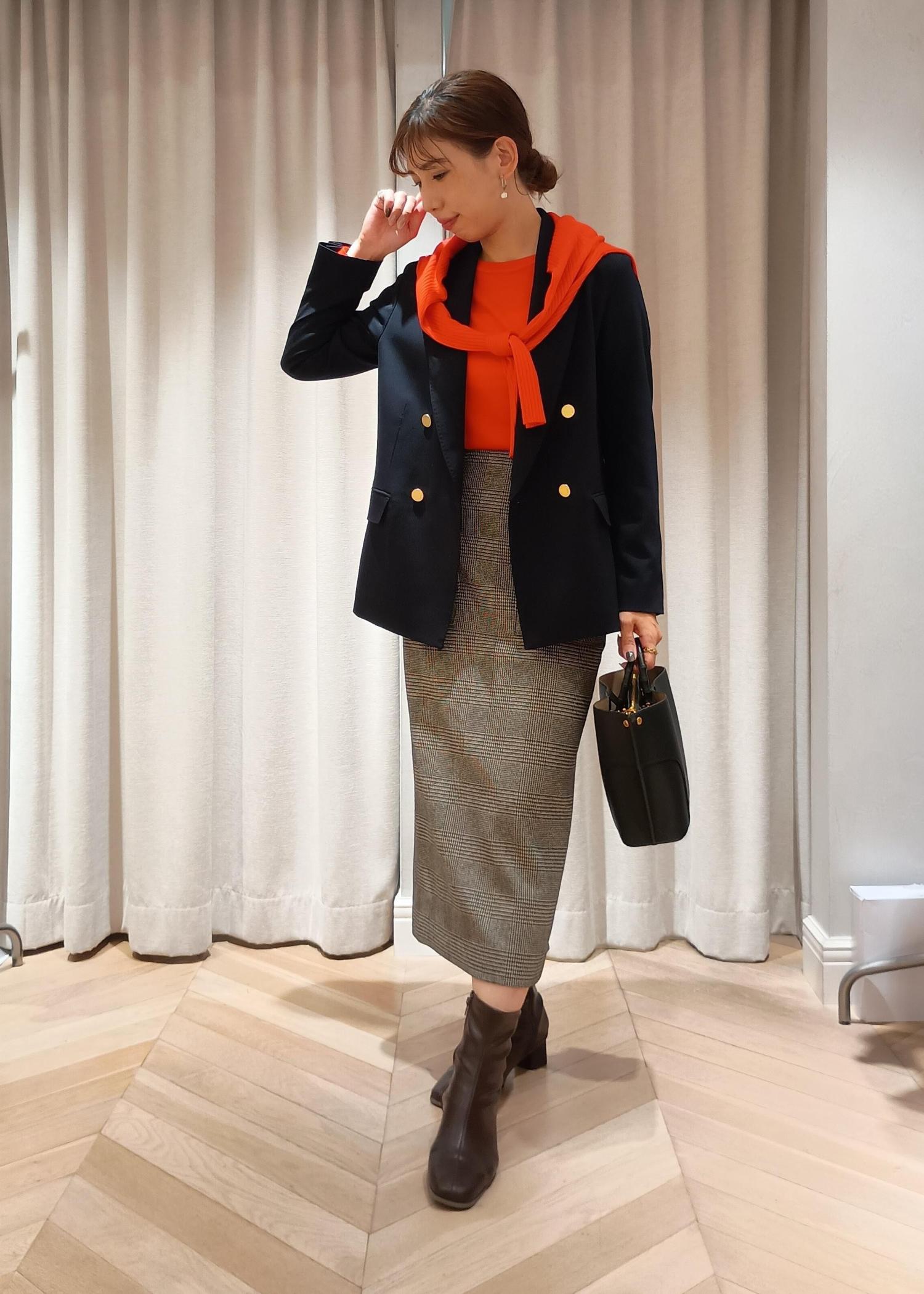 地味になりがちなジャケットスタイルも、インナーに赤を入れてコントラストを出すとこなれ感が一気にupします。トップスと同素材のカーディガンはアンサンブルとして着用せずあえて肩掛けにして色味の演出をより強くオシャレ見えするような着こなしにしています。
