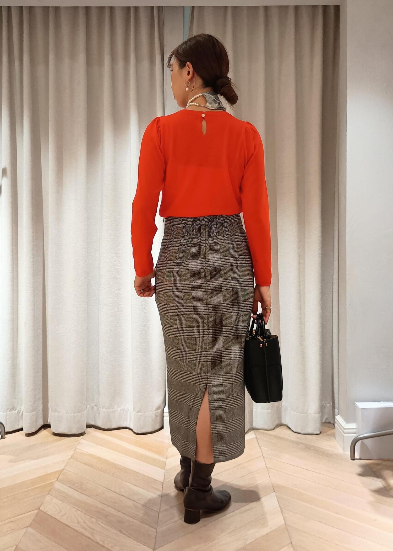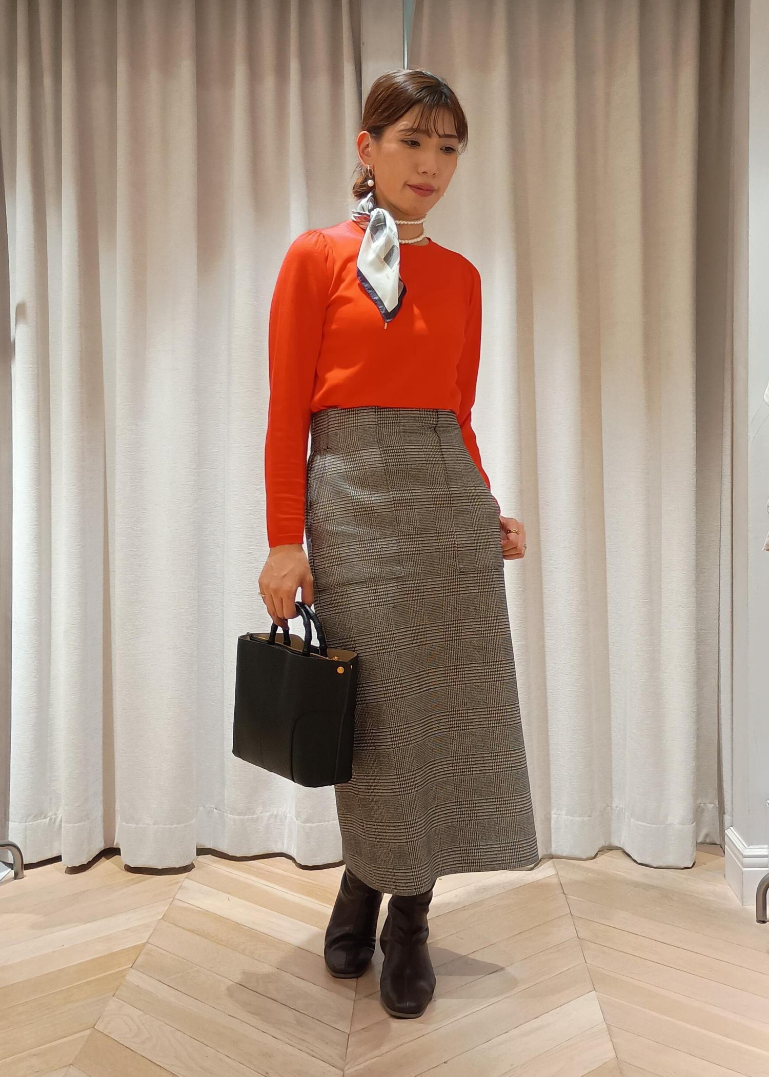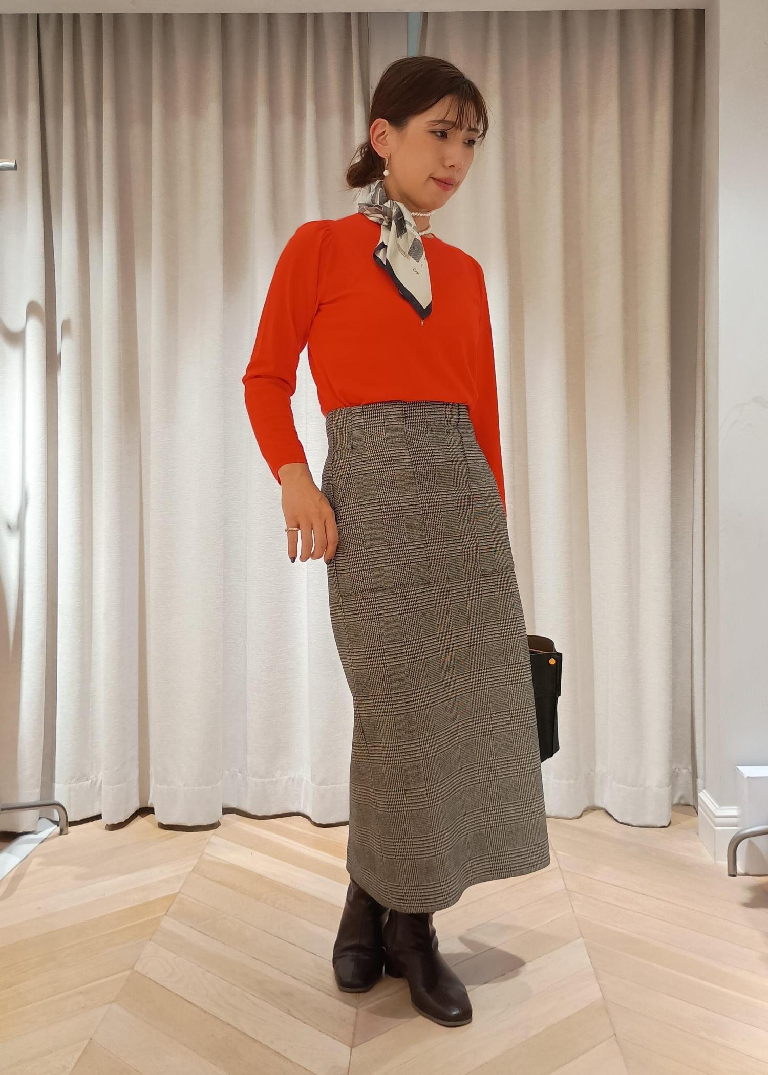 血色よく顔映りが明るく見える赤ニットにスカーフを合わせたきれいめカジュアルコーデです。シンプルなニットだからこそ、スカーフやブローチでポイントを付けるだけでオシャレ感度がグッと引き立ちます。定番のポケット付きタイトスカートとのバランスも良く、スタイルアップが叶うコーディネートです!