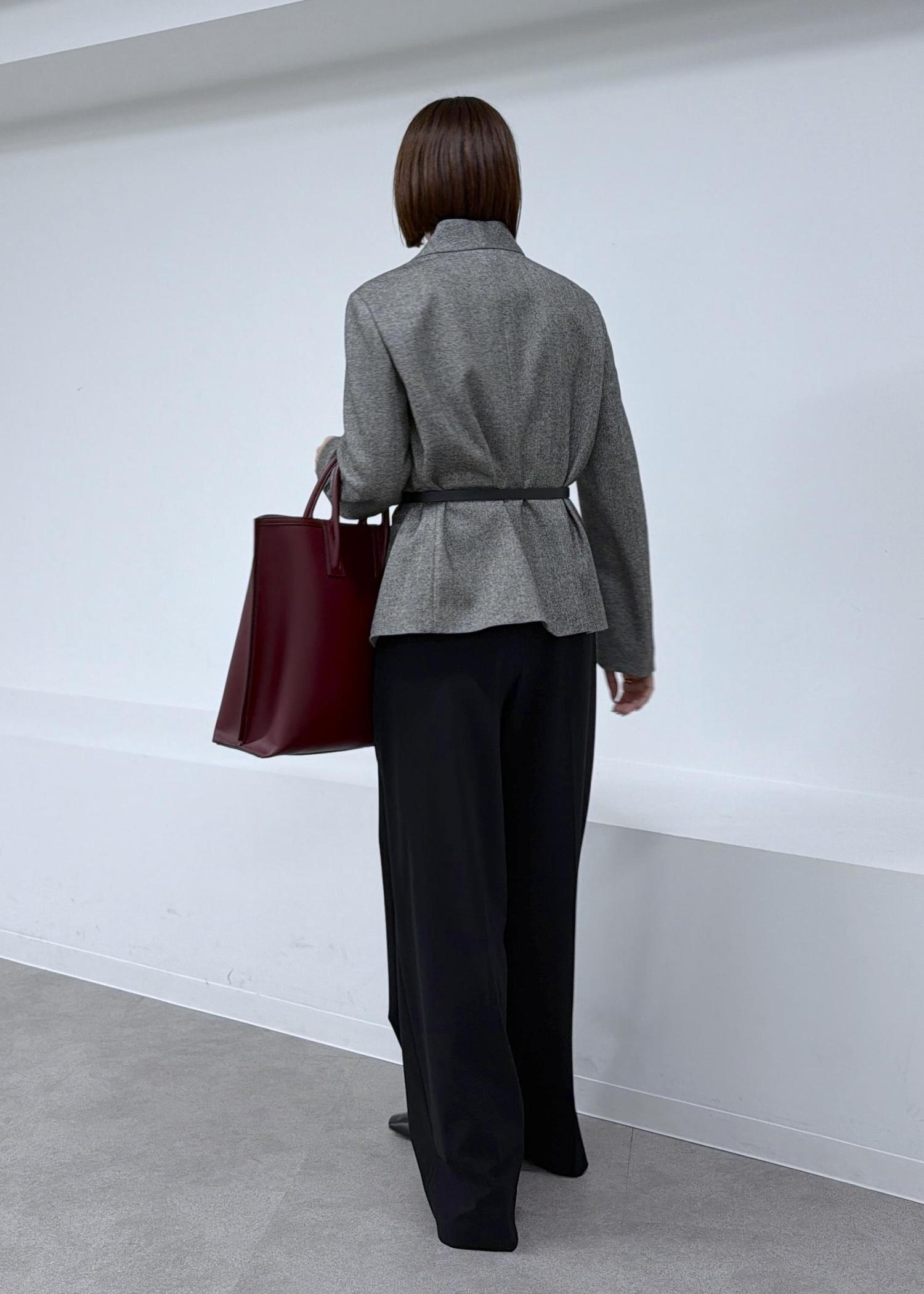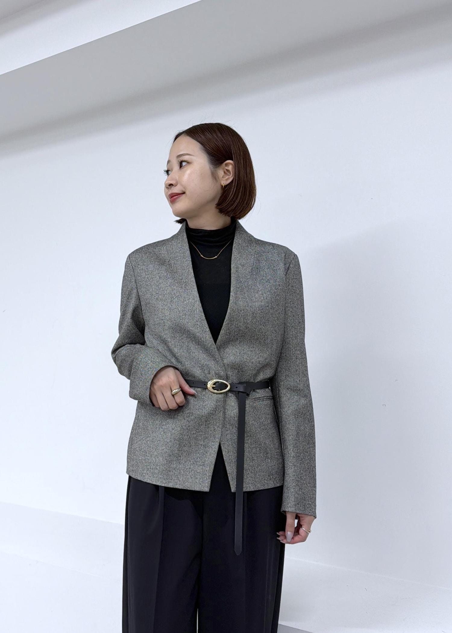 スタイルアップして見えるようジャケットの上からベルトをウエストマークし腰位置を高く見えるようにしました♪
